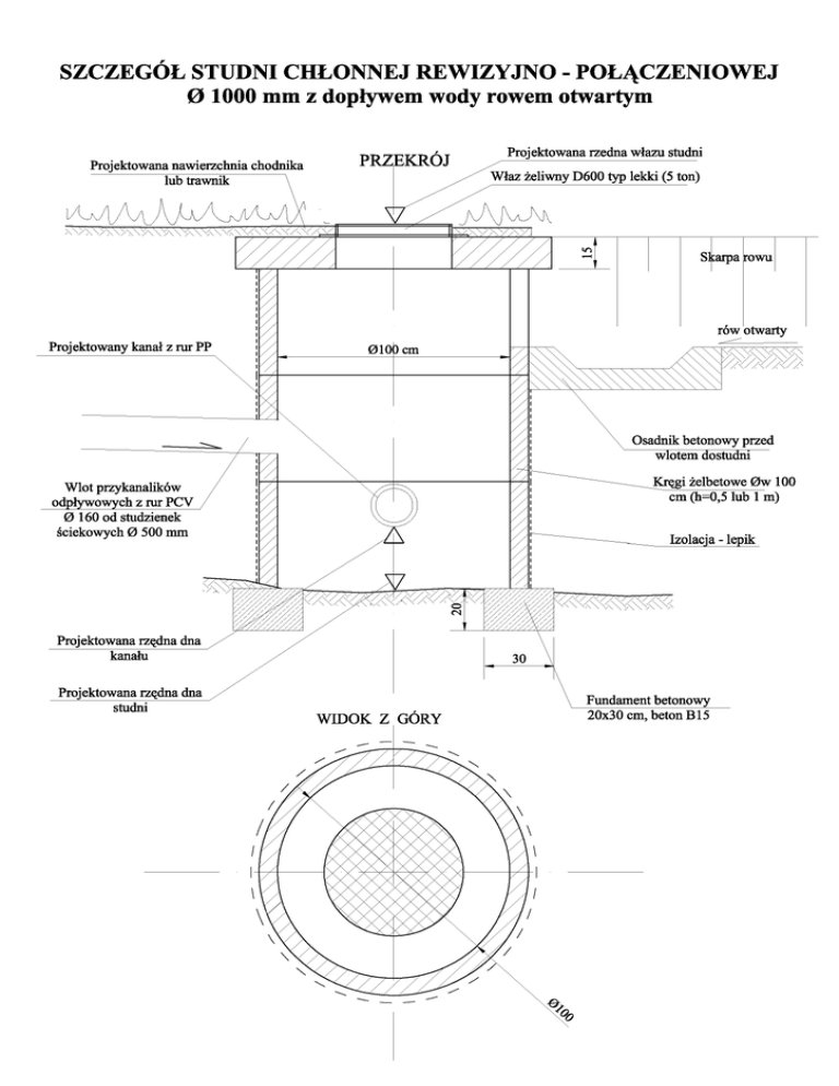 SZCZEGÓŁ STUDNI CHŁONNEJ REWIZYJNO - POŁĄCZENIOWEJ 0 1000 mm z dopływem wody rowem otwartym Projektowana nawierzchnia chodnika PRZEKRÓJ Projektowana rzedną włazu studni Właz żeliwny D600 typ lekki (5 ton) Kręgi żelbetowe 0w 100 ^ cm (h=0,5 lub 1 m) SZCZEGÓŁ STUDNI CHŁONNEJ REWIZYJNO POŁĄCZENIOWEJ 0 1000 mm Projektowana nawierzchnia chodnika PRZEKRÓJ Projektowana rzedną włazu studni Właz żeliwny D600 typ lekki (5 ton) Płyta żelbetowa nastudzienna 0120 cm Izolacja - lepik Kręgi żelbetowe 0w 100 cm (h=0,5 lub 1 m) Projektowana rzędna dna studni WIDOK Z GÓRY 20x30 cm, beton B15