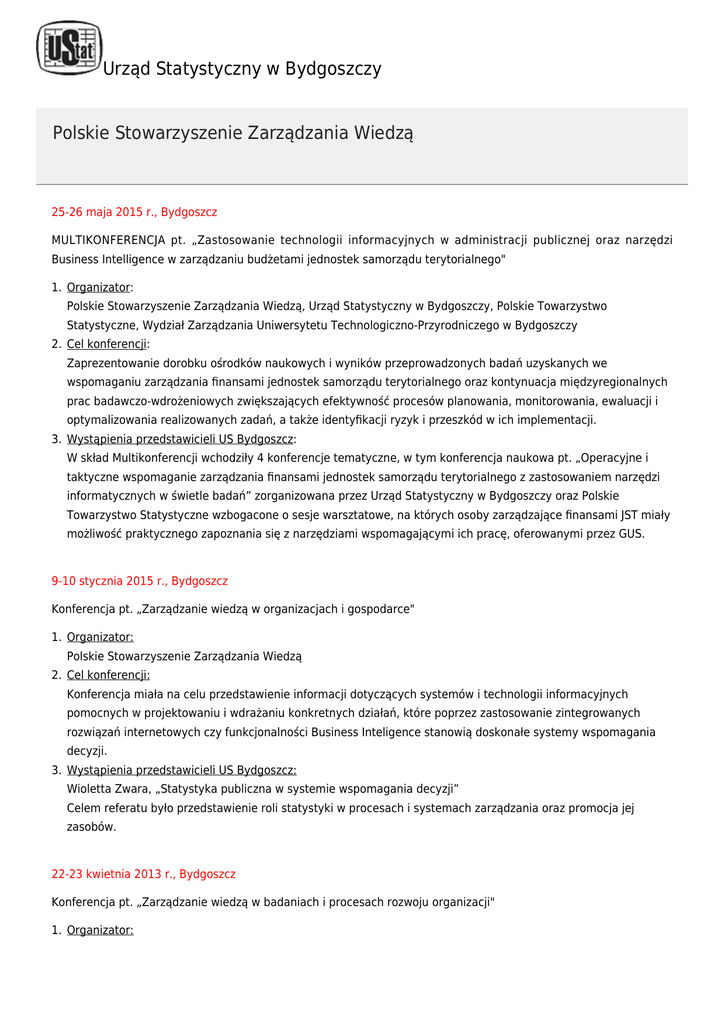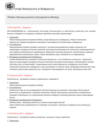 Urząd Statystyczny w Bydgoszczy Polskie Stowarzyszenie Zarządzania Wiedzą 25-26 maja 2015 r., Bydgoszcz MULTIKONFERENCJA pt. „Zastosowanie technologii informacyjnych w administracji publicznej oraz narzędzi Business Intelligence w zarządzaniu budżetami jednostek samorządu terytorialnego" 1. Organizator: Polskie Stowarzyszenie Zarządzania Wiedzą, Urząd Statystyczny w Bydgoszczy, Polskie Towarzystwo Statystyczne, Wydział Zarządzania Uniwersytetu Technologiczno-Przyrodniczego w Bydgoszczy 2. Cel konferencji: Zaprezentowanie dorobku ośrodków naukowych i wyników przeprowadzonych badań uzyskanych we wspomaganiu zarządzania finansami jednostek samorządu terytorialnego oraz kontynuacja międzyregionalnych prac badawczo-wdrożeniowych zwiększających efektywność procesów planowania, monitorowania, ewaluacji i optymalizowania realizowanych zadań, a także identyfikacji ryzyk i przeszkód w ich implementacji. 3. Wystąpienia przedstawicieli US Bydgoszcz: W skład Multikonferencji wchodziły 4 konferencje tematyczne, w tym konferencja naukowa pt. „Operacyjne i taktyczne wspomaganie zarządzania finansami jednostek samorządu terytorialnego z zastosowaniem narzędzi informatycznych w świetle badań” zorganizowana przez Urząd Statystyczny w Bydgoszczy oraz Polskie Towarzystwo Statystyczne wzbogacone o sesje warsztatowe, na których osoby zarządzające finansami JST miały możliwość praktycznego zapoznania się z narzędziami wspomagającymi ich pracę, oferowanymi przez GUS. 9-10 stycznia 2015 r., Bydgoszcz Konferencja pt. „Zarządzanie wiedzą w organizacjach i gospodarce" 1. Organizator: Polskie Stowarzyszenie Zarządzania Wiedzą 2. Cel konferencji: Konferencja miała na celu przedstawienie informacji dotyczących systemów i technologii informacyjnych pomocnych w projektowaniu i wdrażaniu konkretnych działań, które poprzez zastosowanie zintegrowanych rozwiązań internetowych czy funkcjonalności Business Inteligence stanowią doskonałe systemy wspomagania decyzji. 3. Wystąpienia przedstawicieli US Bydgoszcz: Wioletta Zwara, „Statystyka publiczna w systemie wspomagania decyzji” Celem referatu było przedstawienie roli statystyki w procesach i systemach zarządzania oraz promocja jej zasobów. 22-23 kwietnia 2013 r., Bydgoszcz Konferencja pt. „Zarządzanie wiedzą w badaniach i procesach rozwoju organizacji" 1. Organizator: Polskie Stowarzyszenie Zarządzania Wiedzą 2. Cel konferencji Upowszechnienie wiedzy o gromadzeniu i udostępniania informacji statystycznych. Popularyzacja i promocja zasobów statystyki publicznej. 3. Wystąpienia przedstawicieli US Bydgoszcz: Wioletta Zwara „Rola Urzędów Statystycznych w tworzeniu, przetwarzaniu i udostępnianiu informacji społecznogospodarczej”. Celem referatu było przedstawienie roli statystyki jako źródła wiedzy niezbędnego w procesach i systemach zarządzania.