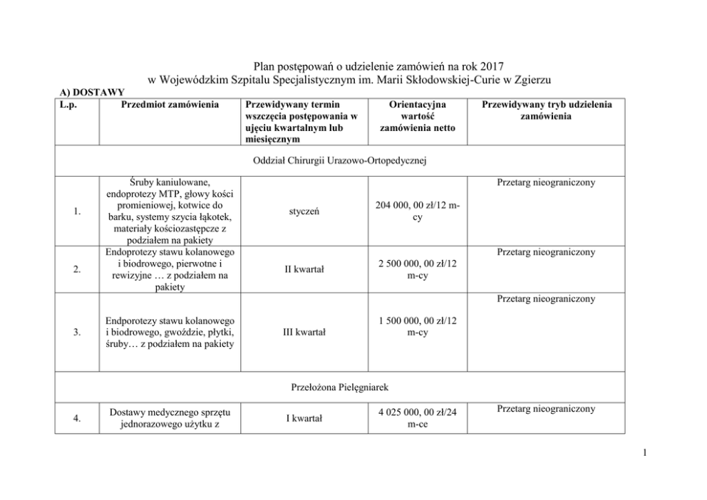 Plan postępowań o udzielenie zamówień na rok 2017 w Wojewódzkim Szpitalu Specjalistycznym im. Marii Skłodowskiej-Curie w Zgierzu A) DOSTAWY L.p. Przedmiot zamówienia Przewidywany termin wszczęcia postępowania w ujęciu kwartalnym lub miesięcznym Orientacyjna wartość zamówienia netto Przewidywany tryb udzielenia zamówienia Oddział Chirurgii Urazowo-Ortopedycznej 1. 2. Śruby kaniulowane, endoprotezy MTP, głowy kości promieniowej, kotwice do barku, systemy szycia łąkotek, materiały kościozastępcze z podziałem na pakiety Endoprotezy stawu kolanowego i biodrowego, pierwotne i rewizyjne … z podziałem na pakiety Przetarg nieograniczony styczeń 204 000, 00 zł/12 mcy II kwartał 2 500 000, 00 zł/12 m-cy Przetarg nieograniczony Przetarg nieograniczony 3. Endporotezy stawu kolanowego i biodrowego, gwoździe, płytki, śruby… z podziałem na pakiety III kwartał 1 500 000, 00 zł/12 m-cy Przełożona Pielęgniarek 4. Dostawy medycznego sprzętu jednorazowego użytku z I kwartał 4 025 000, 00 zł/24 m-ce Przetarg nieograniczony 1 podziałem na pakiety 5. 308 000, 00 zł/24 mce II kwartał Przetarg nieograniczony Apteka 6. Leki, opatrunki, kontrasty z podziałem na pakiety IV kwartał 6 300 000, 00 zł/24m-ce Przetarg nieograniczony 7. Leki, kontrast, kapsułki apteczne z podziałem na pakiety IV kwartał 415 000, 00 zł/24-mce Przetarg nieograniczony Oddział Okulistyczny 8. Jałowe, jednorazowe, zbiorczo zapakowane zestawy/pakiety materiałów i akcesoriów niezbędnych do operacji witrektomii tylnej aparatem ACCURUS IV kwartał 51 000, 00 zł Przetarg nieograniczony 77 000, 00 zł Przetarg nieograniczony Centralna Sterylizatornia 9. Materiały jednorazowego użytku do przeprowadzania procesu sterylizacji z podziałem na pakiety III kwartał Zakład Diagnostyki Laboratoryjnej 10. Nakłuwacze do drenów, probówki + wymazówki, I kwartał 14 500, 00 zł/ 24 mce Przetarg nieograniczony 2 11. 12. 13. 14. 15. podłoża transportowe dla bakterii tlenowych i beztlenowych, bagietki z wacikiem Podłoża, krążki wysycone antybiotykiem, szczepy wzorcowe z podziałem na pakiety Testy do diagnostyki chorób autoimmunologicznych wraz z dzierżawą sprzętu pomocniczego Podłoża i testy diagnostyczne wraz z udostępnieniem chłodziarki Barwniki, testy diagnostyczne, krążki antybiotykowe z podziałem na pakiety Odczynniki do badań z zakresu serologii I kwartał 9 500, 00 zł/24-m-ce Przetarg nieograniczony I kwartał 64 000, 00 zł/24-m-ce Przetarg nieograniczony II kwartał 112 000, 00 zł/24-mce Przetarg nieograniczony III kwartał 32 000, 00 zł/24-m-ce Przetarg nieograniczony IV kwartał 12 000, 00 zł netto /24-m-ce Przetarg nieograniczony I kwartał 224 000, 00 zł/ 12 mcy Przetarg nieograniczony I kwartał 103 000, 00 zł/ 12 mcy Przetarg nieograniczony Blok Operacyjny 16. 17. Dostawy sprzętu i akcesoriów jednorazowych dla Bloku Operacyjnego z podziałem na pakiety Akcesoria do elektrochirurgii, klipsy tytanowe i polimerowe, siatki przepuklinowe z podziałem na pakiety 3 18. 19. Dostawy sterylnych obłożeń jednorazowych, jednorazowych ubrań operacyjnych, jednorazowych narzędzi chirurgicznych z podziałem na pakiety Dostawy narzędzi i akcesoriów do laparoskopii, klipsów do zabiegów laparoskopowych i chirurgii klasycznej z podziałem na pakiety I kwartał 303 000, 00 zł/ 12 mcy Przetarg nieograniczony II kwartał 325 000, 00 zł/12 mcy Przetarg nieograniczony Oddział Medycyny Nuklearnej i Endokrynologicznej 20. Radiofarmaceutyki z podziałem na pakiety IV kwartał 1 250 000, 00 zł/ 12m-cy Przetarg nieograniczony Oddział Ginekologiczny 21. Zestawy do leczenia statyki, taśm do leczenia wysiłkowego nietrzymania moczu III kwartał 103 000, 00 zł/24-mce Przetarg nieograniczony Oddział Neurochirurgii 22. Zaciski plastikowe jednorazowe, sterylne do płata skórnego, zaciski talerzykowe do mocowania płata kostnego po kraniotomii, sprzęt do leczenia wodogłowia, zastawki programowalne z I kwartał 57 000, 00 zł/12 m-cy Przetarg nieograniczony 4 przedzbiornikiem z podziałem na pakiety 23. 24. 25. Zaciski /klipsy/ do mikrochirurgicznego leczenia tetniaków naczyń mózgowych oraz sprzętu do leczenia wodogłowia z podziałem na pakiety Implanty i instrumentarium do operacji kręgosłupa z podziałem na pakiety Sprzęt do stymulacji rdzenia kregowego I kwartał 72 000, 00 zł/12 m-cy Przetarg nieograniczony II kwartał 460 000, 00 zł/12 mcy Przetarg nieograniczony II kwartał 200 000, 00 zł /12-cy Przetarg nieograniczony Oddział Chirurgii 26. Dostawy akcesoriów oraz osprzętu do zabiegów endoskopowych dla Oddziału Chirurgii Ogólnej i Pracowni Endoskopowej z podziałem na pakiety I kwartał 137 000, 00 zł/12 mcy Przetarg nieograniczony 106 000, 00 zł/12 mcy Przetarg nieograniczony Oddział Urologii 27. Sprzęt urologiczny specjalistyczny, jednorazowego i wielorazowego użytku z podziałem na pakiety IV kwartał Inne 5 28. Dostawy foteli i taboretów obrotowych, krzeseł, podajników na mydło, papier z podziałem na pakiety III kwartał 26 000, 00 zł/12 m-cy Przetarg nieograniczony Aparatura i sprzęt medyczny 29. Gastroskop wraz z wyposażeniem – szt. 2 30. Kolonoskop wraz z wyposażeniem – szt. 2 31. Lampy operacyjno-zabiegowe (mobilne) – szt. 5 32. Kardiomonitory szt. 10 i 2 centrale 33. 34. 35. 36. 37. I kwartał 111 111, 00 zł Przetarg nieograniczony 120 370, 00 zł Przetarg nieograniczony 60 185, 00 zł Przetarg nieograniczony III kwartał 231 481, 00 zł Przetarg nieograniczony Stacje dokujące z pompami strzykawkowymi – kpl. 10 III kwartał 203 703, 00 zł Przetarg nieograniczony Videobronchofiberoskop z wyposażeniem – szt. 1 II kwartał 37 037, 00 zł Przetarg nieograniczony IV kwartał 2 777 777, 00 zł Przetarg nieograniczony IV kwartał 4 027 777, 00 zł Przetarg nieograniczony IV kwartał 682 407, 00 zł Przetarg nieograniczony Gamma kamera planarna i gamma kamera dwugłowicowa z wyposażeniem – szt. 2 Tomograf komputerowy 