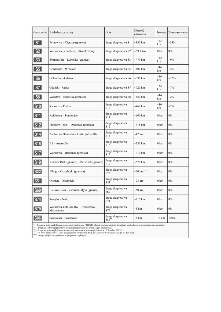 Opis Długość całkowita Istnieje Zaawansowanie Pyrzowice – Cieszyn (granica) droga ekspresowa S1 ~130 km ~43 km ~33% Warszawa (Konotopa) – Konik Nowy droga ekspresowa S2* ~39,5 km 0 km 0% Świnoujście – Lubawka (granica) droga ekspresowa S3 ~470 km ~42 km ~9% Grudziądz – Wrocław droga ekspresowa S5 ~400 km ~16 km ~4% Goleniów – Gdańsk droga ekspresowa S6 ~330 km ~39 km ~12% Gdańsk – Rabka droga ekspresowa S7 ~720 km ~52 km ~7% Wrocław – Budzisko (granica) droga ekspresowa S8 ~680 km ~14 km ~2% Szczecin – Płońsk droga ekspresowa S10 ~460 km ~10 km ~2% Kołobrzeg – Pyrzowice droga ekspresowa S11 ~600 km 0 km 0% Piotrków Tryb. – Dorohusk (granica) droga ekspresowa S12 ~315 km 0 km 0% Zachodnia Obwodnica Łodzi (A2 – S8) droga ekspresowa S14 ~42 km 0 km 0% A1 – Augustów droga ekspresowa S16* ~335 km 0 km 0% Warszawa – Hrebenne (granica) droga ekspresowa S17 ~310 km 0 km 0% Kuźnica Biał. (granica) – Barwinek (granica) droga ekspresowa S19 ~570 km 0 km 0% Elbląg – Grzechotki (granica) droga ekspresowa S22 ~60 km**** 0 km 0% Olsztyn – Olsztynek droga ekspresowa S51 ~25 km 0 km 0% Bielsko-Biała – Zwardoń-Myto (granica) droga ekspresowa S69 ~50 km 0 km 0% Sulejów – Nisko droga ekspresowa S74 ~215 km 0 km 0% Warszawa-Lotnisko (S2) – WarszawaMarynarska droga ekspresowa S79* ~5 km 0 km 0% Sosnowiec – Katowice droga ekspresowa S86** ~6 km ~6 km 100% Oznaczenie Zakładany przebieg * – droga nie jest uwzględniona w programie rządowym, GDDKIA planuje wybudowanie tej drogi jako niezbędnego uzupełnienia planowanej sieci ** – droga nie jest uwzględniona w programie rządowym, ale istnieje i jest użytkowana *** – droga nie jest uwzględniona w programie rządowym, jest uwzględniona w NPR na lata 2007-13 **** – w NPR na lata 2007-13 jest uwzględnione wydłużenie drogi do Gorzowa Wielkopolskiego (o ok. 320 km.) ***** – droga nie jest uwzględniona w programie rządowym