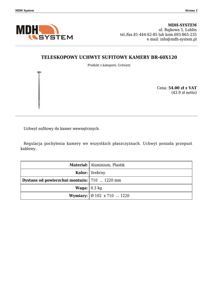 teleskopowy uchwyt sufitowy kamery br-60x120 - Mdh