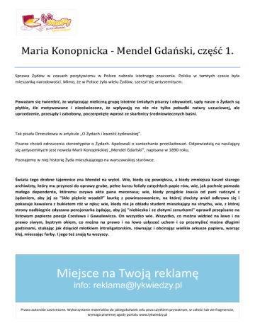 Maria Konopnicka - Mendel Gdański, część 1. Sprawa Żydów w czasach pozytywizmu w Polsce nabrała istotnego znaczenia. Polska w tamtych czasie była mieszanką narodowości. Mimo, że w Polsce żyło wielu Żydów, szerzył się antysemityzm. Poważam się twierdzid, że wyłączając nieliczną grupę istotnie śmiałych pisarzy i obywateli, sądy nasze o Żydach są płytkie, źle motywowane i nieoświecone, że wpływają na nie nie tylko pobudki natury uczuciowej, ale uprzedzenie, przesądy i zabobony, poczerpnięte wprost ze skarbnicy średniowiecznych baśni. Tak pisała Orzeszkowa w artykule „O Żydach i kwestii żydowskiej”. Pisarze chcieli odrzucenia stereotypów o Żydach. Apelowali o zaniechanie prześladowao. Odpowiedzią na nasilający się antysemityzm jest nowela Marii Konopnickiej „Mendel Gdaoski”, napisana w 1890 roku. Poznajemy w niej historię Żyda mieszkającego na warszawskiej starówce. Świata tego drobne tajemnice zna Mendel na wylot. Wie, kiedy się powiększa, a kiedy zmniejsza kaszel starego archiwisty, który mu przynosi do oprawy grube, pełne kurzu foliały zatęchłych papie rów, wie, jak pachnie pomada małego dependenta, któremu zszywa akta pana mecenasa; wie, kiedy przyjdzie Joasia od pani radczyni z żądaniem, aby jej za "śkło pięknie wsadził" laurkę z powinszowaniem, na której złocisty anioł odkrywa się i pokazuje kawalera z bukietem róż w ręku; wie, kiedy nie je obiadu student mieszkający na strychu, wie, z której strony nadbiegnie zdyszana pensjonarka żądając, aby jej "niebiesko i ze złotymi sznurkami" oprawił przepisane na listowym papierze poezje Czesława i Gawalewicza. On wszystko wie. Wszystko, co można widzied na lewo i na prawo siwym, bystrym okiem, co można na prawo i na lewo usłyszed uchem i co przemyśled można długimi godzinami, stukając jak dzięcioł młotkiem introligatorskim, równając i obcinając wielkie arkusze papieru, warząc klej, mieszając farby. I jego też znają tu wszyscy. Prawa autorskie zastrzeżone. Wykorzystanie materiałów do jakiegokolwiek celu poza użytkiem prywatnym, w całości lub we fragmencie, wymaga pisemnej zgody portalu www.lykwiedzy.pl Mendel nie przypuszcza, nie wierzy, że w Warszawie może przytrafid mu się coś złego. Raz grupa wyrostków wyśmiewała się z jego modlitw szabasowych, ale ksiądz, który akurat przechodził, ukłonił się modlącemu. Od tego czasu zaczepek nie było. Narrator pokazuje nam, że staremu Żydowi jest dobrze, że zna ludzi. Czasem źle się czuje, ale wtedy pali fajkę i odpoczywa, wspominając dawne czasy. Jego oczkiem w głowie jest wnuczek – syn zmarłej córki. Przedwczoraj wydarzyło się coś, co wzbudziło jednak obawy Mendla. Właściwie i przedwczoraj nie stało się nic. Tylko malec powrócił ze szkoły bez czapki, zdyszany, jak zając zgoniony. Zrazu nic mówid nie chciał; dopiero po długich badaniach wyznał, że jakiś obdartus krzyknął na niego "Żyd!.. Żyd!...", więc on uciekał i czapkę zgubił, i nie śmiał wracad po nią. Fala gniewu uderzyła staremu Mendlowi do twarzy. Wyprostował się, jakby urósł nagle, splunął, a potem chłopaka twardo za ramię ująwszy, do stołu pchnął i obiad w milczeniu spożył. Po obiedzie nie wrócił do warsztatu i fajki nie nakładał, tylko sapiąc po izbie chodził. Malec także do lekcji się nie brał, ale patrzył na dziadka zalęknionym wzrokiem. Nigdy go jeszcze tak gniewnym nie widział. - Słuchaj ty! - przemówił wreszcie stając przed chłopcem Mendel. - Jak ja ciebie małego sierotę wziął i chował, i za niaokę także był, i za matkę także był, i piastował ciebie, nu, to nie na to ja ciebie chował i nie na to piastował, co by ty głupi był! I jak ja ciebie uczyd dał, jak ja ciebie do szkoły posyłał, jak ja tobie książki kupował, to też nie na to, co by ty głupi był! A ty ze wszystkim głupi rośniesz i nie ma u ciebie żadnej mądrości! Jakby u ciebie mądrośd była, to by ty tego nie wstydził się, nie płakał, nie uciekał, że kto na ciebie "Żyd" krzyknie. A jak ty tego płaczesz, jak ty uciekasz i jeszcze taką piękną, nową czapkę gubisz, co pięd złotych bez sześciu groszy kosztuje gotówką, pieniędzmi, nu, to ty ze wszystkim głupi jesteś, a te szkoły, te książki, te nauki to wszystko na nic! Gdy Mendel w koocu się uspokoił zaczął tłumaczyd wnukowi, że jest takim samym człowiekiem jak każdy. Że nie powinien się wstydzid bycia Żydem. Na drugi dzieo do Mendla dochodzą informację o tym, że planowane jest bicie Żydów. Z taką wieścią przychodzi m.in. zegarmistrz. Mendel pyta: „Dlaczego Żydzi mają byd bici?”. Odpowiedź („Bo są obcy”) bardzo rani naszego bohatera. - Mój panie Mendel - rzekł zegarmistrz tonem wyższości. Gada się to tak i owak; ale każdy Żyd byle pieniądze miał. Stary introligator nie dał mu dokooczyd, ale podniósłszy rękę trząsł nią, jakby cię od natrętnego owada opędzał. Prawa autorskie zastrzeżone. Wykorzystanie materiałów do jakiegokolwiek celu poza użytkiem prywatnym, w całości lub we fragmencie, wymaga pisemnej zgody portalu www.lykwiedzy.pl - Niech mi pan dobrodziej nie powie te mowe! To jest mowa od wszystkich głupie ludzie. Jakby Żydowi pieniądz za wszystko miał byd, to by jemu Pan Bóg od razu kieszeo w skórę zrobił, abo i dwie. A jak jemu Pan Bóg kieszeo w skórę nie zrobił, nu, to na to, że Żydowi pieniądz tyle ma byd, co i każdemu. Trwa dyskusja starego Żyda i głupkowatego zegarmistrza. Mendel stosuje różne argumenty pokazując, że jest normalnym człowiekiem, ale zegarmistrz ma na wszystko jedną odpowiedź. Żyd to Żyd. Zawsze obcy. I do tego się mnożą. Pan dobrodziej wie, jak ja się nazywam? Nu, ja się nazywam Mendel Gdaoski. Że ja się Mendel nazywam, to przez to, co nas było dzieci czternaście, a ja się piętnasty urodził, tu, na Stare Miasto, w te wąskie uliczke, zara za te żółte kamienic