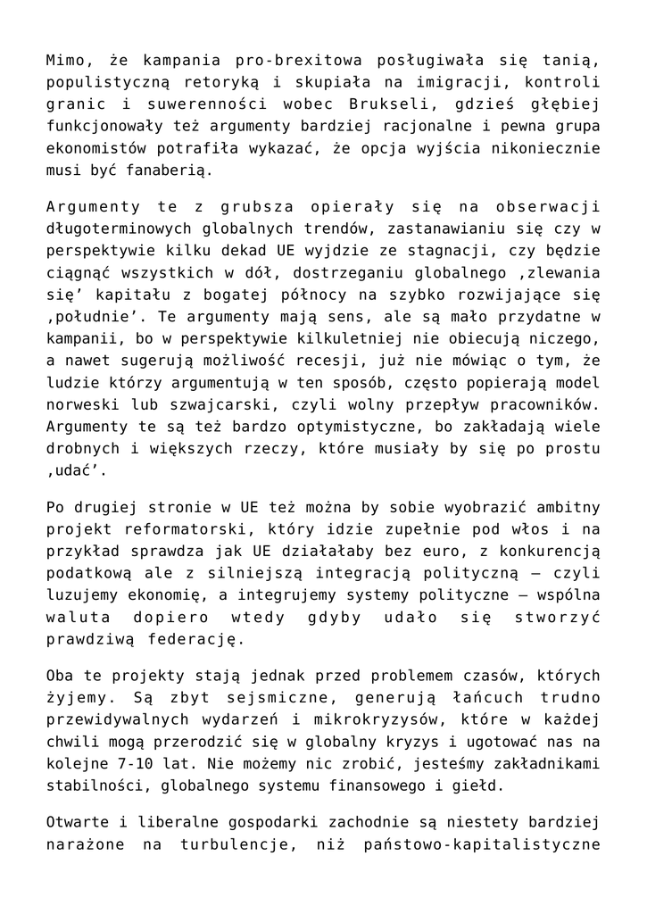 Mimo, że kampania pro-brexitowa posługiwała się tanią, populistyczną retoryką i skupiała na imigracji, kontroli granic i suwerenności wobec Brukseli, gdzieś głębiej funkcjonowały też argumenty bardziej racjonalne i pewna grupa ekonomistów potrafiła wykazać, że opcja wyjścia nikoniecznie musi być fanaberią. Argumenty te z grubsza opierały się na obserwacji długoterminowych globalnych trendów, zastanawianiu się czy w perspektywie kilku dekad UE wyjdzie ze stagnacji, czy będzie ciągnąć wszystkich w dół, dostrzeganiu globalnego ‚zlewania się’ kapitału z bogatej północy na szybko rozwijające się ‚południe’. Te argumenty mają sens, ale są mało przydatne w kampanii, bo w perspektywie kilkuletniej nie obiecują niczego, a nawet sugerują możliwość recesji, już nie mówiąc o tym, że ludzie którzy argumentują w ten sposób, często popierają model norweski lub szwajcarski, czyli wolny przepływ pracowników. Argumenty te są też bardzo optymistyczne, bo zakładają wiele drobnych i większych rzeczy, które musiały by się po prostu ‚udać’. Po drugiej stronie w UE też można by sobie wyobrazić ambitny projekt reformatorski, który idzie zupełnie pod włos i na przykład sprawdza jak UE działałaby bez euro, z konkurencją podatkową ale z silniejszą integracją polityczną – czyli luzujemy ekonomię, a integrujemy systemy polityczne – wspólna waluta dopiero wtedy gdyby udało się stworzyć prawdziwą federację. Oba te projekty stają jednak przed problemem czasów, których żyjemy. Są zbyt sejsmiczne, generują łańcuch trudno przewidywalnych wydarzeń i mikrokryzysów, które w każdej chwili mogą przerodzić się w globalny kryzys i ugotować nas na kolejne 7-10 lat. Nie możemy nic zrobić, jesteśmy zakładnikami stabilności, globalnego systemu finansowego i giełd. Otwarte i liberalne gospodarki zachodnie są niestety bardziej narażone na turbulencje, niż państowo-kapitalistyczne sterowane odgórnie molochy. Na tym polega właśnie największy paradoks naszych czasów – że jako liberalna cywilizacja zachodnia stworzyliśmy globalny system, w którym na dzień dzisiejszy lepiej wydają sobie radzić państwa nieliberalne, które z naszego punktu widzenia uprawiają nieuczciwą, brudną formę kapitalizmu. Wszelkie chwyty dozwolone – protekcjonizm, bezpośrednie wsparcie państwa dla pewnych firm, ostra interwencja walutowa i giełdowa. Zostajemy trochę na lodzie, jak romantycy kapitalizmu ze swoim 2-3 procentowym wzrostem. Wielka Brytania doświadcza dziś kryzysu władzy, rozpadu opozycji, zapaści giełdowej i wstrzymania a i wycofywania inwestycji. I to nie tylko przemysłowych – wiele prywatnych transakcji takich jak kupno domu zostało wstrzymanych. Zupełnie poza dyskusją czy brexit jest dobry czy zły – taki efekt domina świadczy być może o tym, że nasz głęboko spleciony globalny system finansowy i ekonomiczny, nad którym nikt nie panuje, którego większość nie rozumie i który cały czas rośnie i to bardzo, jest chorym człowiekiem – psychopatą, który zamknął nas w klatce bardzo ograniczonych możliwości. Psychopatą, który co roku rosnąc zdobywa nad nami większą władzę.