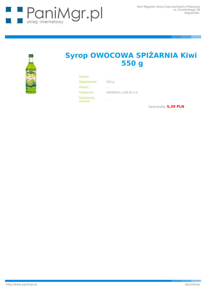 Pani Magister Anna Czerniachowicz-Piskorska ul. Krasińskiego 2B Stąporków Syrop OWOCOWA SPIŻARNIA Kiwi 550 g Dawka: - Opakowanie: 550 g Postać: - Producent: HERBAPOL-LUBLIN S.A. Substancja czynna: Cena brutto: http://www.panimgr.pl 5,39 PLN AptusShop