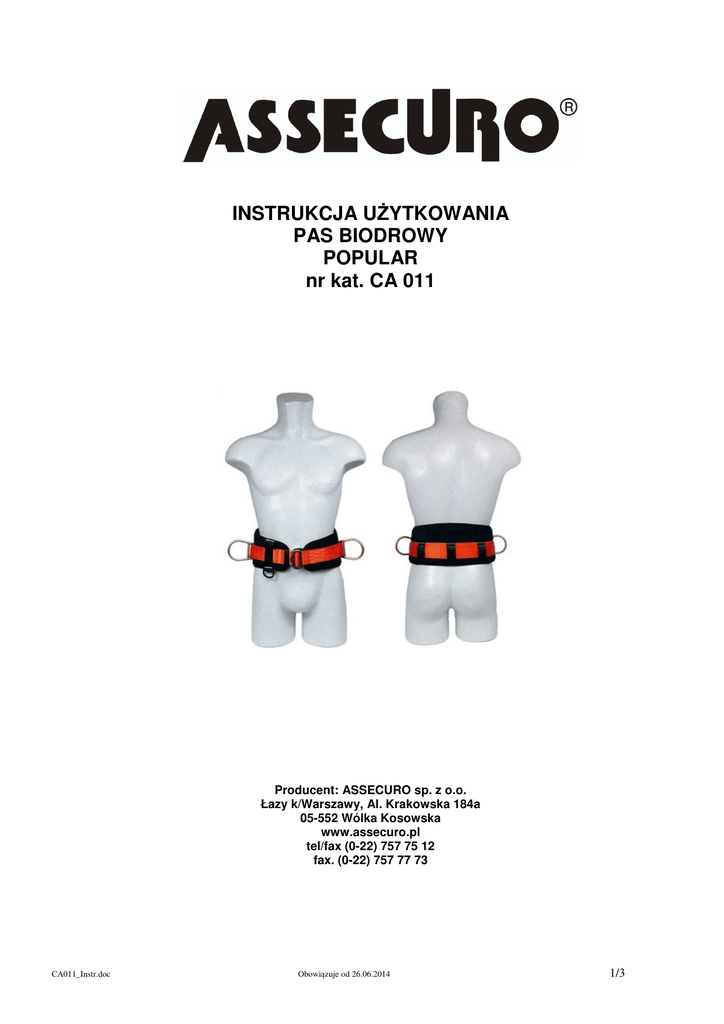 INSTRUKCJA UŻYTKOWANIA PAS BIODROWY POPULAR nr kat. CA 011 Producent: ASSECURO sp. z o.o. Łazy k/Warszawy, Al. Krakowska 184a 05-552 Wólka Kosowska www.assecuro.pl tel/fax (0-22) 757 75 12 fax. (0-22) 757 77 73 CA011_Instr.doc Obowiązuje od 26.06.2014 1/3 ZASTOSOWANIE Pas biodrowy do pracy w podparciu może być wykorzystywany samodzielnie jako narzędzie pracy lub jako dodatkowe wyposażenie szelek bezpieczeństwa ASSECURO. Pas spełnia wymagania normy EN 358. UWAGA: Stosowany samodzielnie pas biodrowy może być wykorzystywany przy pracach w podparciu tylko tam, gdzie nie istnieje zagrożenie upadku z wysokości. Nie stanowi on zabezpieczenia przed upadkiem z wysokości. KONSTRUKCJA Pas biodrowy wykonany jest z taśmy poliamidowej, metalowych klamer bocznych typu „ASSECURO” oraz klamry spinająco-regulacyjnej. Zamocowany jest na szerokiej wkładce wykonanej z lekkiego, sztywnego, nie chłonącego wody tworzywa. Dzięki ergonomicznym kształtom wkładka znakomicie podpiera okolice lędźwiowe kręgosłupa i poprzez rozłożenie nacisku na dużej powierzchni czyni go nieuciążliwym dla użytkownika pracującego w niewygodnej pozycji nawet przez długi okres czasu. Dwie symetrycznie rozmieszczone po obu bokach klamry pomocnicze służą do przyłączania linki opasującej np. słup, drzewo lub element konstrukcyjny. UWAGA: Nie wolno dokonywać samodzielnie żadnych zmian lub poprawek w konstrukcji pasa biodrowego. Wszelkie uwagi dotyczące konstrukcji pasa należy zgłaszać do producenta. SPOSÓB UŻYTKOWANIA Przed rozpoczęciem użytkowania pasa należy zapoznać się z instrukcją producenta. W trakcie eksploatacji zaleca się bezwzględne jej przestrzeganie. Przed oddaniem pasa biodrowego do użytkowania, osoba odpowiedzialna w zakładzie za Sprzęt Ochrony Osobistej (SOO) powinna poddać pas wstępnej kontroli polegającej na: 1. sprawdzeniu zgodności danych tj daty produkcji oraz numeru fabrycznego, znajdujących się na Karcie Użytkowania (w karcie użytkowania ostatnie siedem cyfr oznacza nr seryjny) i wszywce informacyjnej pasa; 2. ocenie wizualnej całego pasa w celu stwierdzenia czy nie uległ uszkodzeniu w czasie transportu. Pas, w którym stwierdzono niezgodność danych lub uszkodzenie nie może być dopuszczony do użytkowania i powinien być przekazany do oceny dostawcy. Pozytywny wynik kontroli oraz datę jej wykonania należy wpisać na Karcie Użytkowania i metce w pozycji „Potwierdzenie pierwszego wydania do użytkowania”. Wpisu na metce dokonać pisakiem wodoodpornym. Kartę Użytkowania należy przechowywać przez cały okres użytkowania pasa. UWAGA: Wszelkie naprawy sprzętu mogą być przeprowadzone jedynie przez ASSECURO. Dopuszcza się użytkowanie sprzętu jedynie przez osoby przeszkolone. Użytkownik powinien również zapoznać się z zasadami prowadzenia akcji ratunkowej (ewakuacyjnej). Pas przed każdym użyciem powinien być dokładnie sprawdzony przez samego użytkownika. Kontroli należy poddać wszystkie taśmy, klamry i szwy. Należy również sprawdzać zapięcia klamer i zaczepów w trakcie wykonywania pracy. Ponadto pas powinien być poddawany corocznej kontroli okresowej przez upoważnioną osobę. Przeprowadzenie kontroli okresowej należy odnotować w Karcie Użytkowania, wpisując datę i podpis osoby upoważnionej do wykonywania kontroli. Stwierdzenie jakichkolwiek uszkodzeń elementów włókienniczych polegających na przetarciu, rozerwaniu, rozpruciu eliminuje pas z dalszego użytkowania. Pas, w którym stwierdzono pęknięcia, deformacje lub ślady korozji na elementach metalowych również nie może być dalej użytkowany. ZASADY POSŁUGIWANIA SIĘ WYROBEM • Założenie pasa następuje poprzez opasanie nim bioder i spięcie klamry spinająco-regulacyjnej. Dla umożliwienia pracy w podparciu pracownik powinien połączyć obie boczne klamry pasa biodrowego z linką opasującą (np. MANUBLOK, MANUSTOP) według zasad zawartych w odpowiednich instrukcjach użytkowania. Linka powinna być opasana wokół stałej konstrukcji (linka opasująca powinna opasywać element kotwiczący przechodząc od jednej klamry zaczepowej pasa biodrowego do drugiej, w taki sposób aby droga swobodnego spadania była ograniczona do 0,5m.). ZALECENIA, NAKAZY I ZAKAZY DOTYCZĄCE UŻYTKOWANIA • Pas biodrowy nie powinny być używany inaczej niż zgodnie z przeznaczeniem. • Przed użyciem pas biodrowego należy zapoznać się z instrukcją użytkowania. • Pas biodrowy przed każdym użyciem powinien być dokładnie sprawdzony przez samego użytkownika. Kontroli należy poddać wszystkie taśmy, klamry i szwy. • Należy również sprawdzać zapięcia klamer i zaczepów w trakcie pracy. • Stwierdzenie jakichkolwiek uszkodzeń elementów włókienniczych polegające na przetarciu, rozerwaniu, rozpruciu eliminuje pas z dalszego użytkowania. • Pas, w którym stwierdzono pęknięcia, deformacje lub ślady korozji na elementach metalowych również nie mogą być użytkowane. W trakcie użytkowania pas biodrowy należy chronić przed kontaktem z: CA011_Instr.doc Obowiązuje od 26.06.2014 2/3 • środkami chemicznymi takimi jak : 1. farby i rozpuszczalniki 2. smary i oleje 3. kwasy, ługi, alkohole • otwartym ogniem, źródłami ciepła i wysokimi temperaturami, • przedmiotami o ostrych krawędziach. W razie zaistnienia kontaktu pasa biodrowego z ww. czynnikami należy wycofać go z użytkowania i zniszczyć. Pas nie powinien być użytkowany w środowisku zagrożonym wybuchem. UWAGA: W przypadku wątpliwości co do stanu technicznego pasa biodrowego, należy wycofać go z użytkowania i przekazać osobie kompetentnej, do stwierdzenia co do dalszej przydatności. OKRES UŻYTKOWANIA, KONTROLE OKRESOWE, WYCOFANIE WYROBU Z UŻYTKOWANIA Okres bezpiecznego użytkowania pasa biodrowego uzależniony jest przede wszystkim od stopnia jego zużycia, ale nie powinien przekraczać 5 lat od daty wydania jego do użytkowania pod warunkiem, że od momentu z