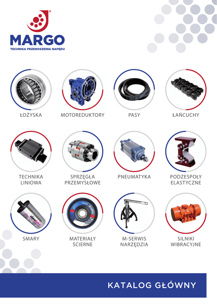ŁOŻYSKA MOTOREDUKTORY PASY ŁAŃCUCHY TECHNIKA LINIOWA SPRZĘGŁA PRZEMYSŁOWE PNEUMATYKA PODZESPOŁY ELASTYCZNE SMARY MATERIAŁY ŚCIERNE M-SERWIS NARZĘDZIA SILNIKI WIBRACYJNE KATALOG GŁÓWNY Kim jesteśmy? Jesteśmy ogólnopolską firmą z centralą w Toruniu. Posiadamy oddziały w Katowicach, Koszalinie i Olsztynie oraz 13 biur handlowych na terenie całego kraju. Działamy na rynku od 1995 roku będąc jednocześnie jednym z potentatów rynku w zakresie techniki przenoszenia napędu opartą w pełni na polskim kapitale. W naszym magazynie w ciągłej dostępności mamy ponad 40 tysięcy pozycji produktowych. Gdańsk Koszalin Olsztyn Białystok Bydgoszcz Toruń Gorzów Wielkopolski Poznań Legnica Lublin Wrocław Częstochowa Katowice Żory Dąbrowa Górnicza Rzeszów Tychy Naszym klientom oferujemy Wsparcie sztab specjalistów i doradców produktowych o dużym doświadczeniu nieodpłatne szkolenia dla działów utrzymania ruchu w zakresie technik montażu i demontażu łożysk oraz ich eksploatacji serwis diagnostyczny pomoc ze strony producenta Mobilność pomoc regionalnego doradcy oraz specjalistów ds. produktu prezentacje produktów u klientów własny transport oraz współpraca z firmami kurierskimi zapewniająca ekspresowe dostawy do klienta realizacja zamówień drogą elektroniczną składy konsygnacyjne u klientów Audyty energetyczne wymierne oszczędności finansowe obniżenie kosztów produkcji poprzez modernizacje oraz usprawnienie istniejących aplikacji przeprojektowywanie przekładni eliminacja wad konstrukcyjnych Wieloasortymentowość i komplementarność dostaw możliwość realizacji wielu potrzeb u jednego dostawcy bezpośrednie dostawy od producentów współpraca z dostawcami oraz dystrybutorami z całego świata Autoryzowane dystrybucje wielu producentów każdy dział produktowy w każdej półce cenowej zawsze posiada produkty kilku producentów na zasadzie autoryzacji bez pośredników Oszczędność czasu i pieniędzy nie musicie Państwo wysyłać wielu ofert i zamówień do różnych dostawców - wszystko w jednym miejscu i czasie 02 TECHNIKA PRZENIESIENIA NAPĘDU Zakres działania łożyska, zespoły łożyskowe, oprawy łożyskowe silniki elektryczne, reduktory, wariatory, falowniki pasy i koła pasowe taśmy transportowe i napędowe łańcuchy i koła łańcuchowe sprzęgła technika liniowa pneumatyka, hydraulika, automatyka podzespoły elastyczne silniki wibracyjne szczotki techniczne smary i smarownice, chemia przemysłowa uszczelnienia, zabezpieczenia narzędzia do montażu i demontażu łożysk i innych elementów urządzenia pomiarowe, serwis, diagnostyka materiały ścierne Oferujemy także pomoc techniczną w zakresie doboru łożysk, techniki liniowej, pasów, motoreduktorów oraz smarownic automatycznych. Świadczymy również usługi profesjonalnego cięcia prowadnic, wałków precyzyjnych oraz pasów z rękawa. Nasz serwis diagnostyczny oferuje szeroki zakres diagnostyki węzłów łożyskowych w zakresie: diagnostyki drganiowej, osiowania laserowego, wyważania dynamicznego i doradztwa technicznego. Autoryzacje TIMKEN, NSK, FAG, INA – światowi liderzy produkcji łożysk ABB, CAG, STM, GSM, VELA – reduktory, silniki AVENTICS – światowy producent pneumatyki BANDO, OPTIBELT, STRONGBELT – producenci pasów napędowych BOSCH REXROTH – pneumatyka, hydraulika i technika przeniesienia napędu liniowego BRL, FERSA, KINEX, PERMAGLIDE, ROLLWAY – producenci łożysk tocznych DURBAL – producent główek cięgła KTR – sprzęgła i przeguby DODGE (ABB), LBC – producenci opraw łożyskowych LOCTITE – światowy dostawca chemii przemysłowej MCGILL – producent rolek tocznych NSK PRECISION – liniowa technika przeniesienia napędu PBF – polska fabryka łożysk RENOLD – producent łańcuchów napędowych i transportowych oraz asortymentu towarzyszącego SAINT GOBAIN – producent materiałów ściernych SIMATEC – smarownice, narzędzia montażowe i demontażowe Ponadto oferujemy naszym partnerom produkty takich marek jak: AZ PNEUMATICA, SIMRIT, SMC, SKF, KOYO, NACHI, NTN, SNR, ZKL, ZVL i inne. www.phumargo.pl 03 ŁOŻYSKA POPRZECZNE ŁOŻYSKA WZDŁUŻNE Łożyska kulkowe Łożyska kulkowe zwykłe zwykłe - jednokierunkowe (składają się z podkładek jako pierścieni łożyskowych z rowkami bieżni, pierścień związany z wałkiem nazywany jest pierścieniem wewnętrznym lub podkładką wałka, a związany z obudową pierścieniem zewnętrznym lub podkładką obudowy), serii: 511, 512, 512, 514, 532, 533, 534 - dwukierunkowe (występują trzy pierścienie z jednym środkowym pierścień centralny, który zamocowany jest na wałku, występują również łożyska kulkowe wzdłużne z podkładką kulistą U poniżej pierścienia zewnętrznego kulistego, pozwala to na kompensowanie błędów niewspółosiowości wałka czy błędów montażu), serii: 522, 523, 524, 542, 543, 544 - jednorzędowe - dwurzędowe jednorzędowe rozłączne skośne - jednorzędowe - dwurzędowe - sparowane - skośne o styku trzy i czteropunktowym wahliwe do zespołów łożyskowych Łożyska wałeczkowe Łożyska wałeczkowe walcowe baryłkowe - łożyska te mają bieżnie kulistą w podkładce obudowy oraz wałeczki w kształcie baryłek ukośnie ułożonych dookoła tej oprawy; ponieważ bieżnia w podkładce obudowy jest kulista, to łozyska te są wahliwe, posiadają one bardzo wysoką zdolność obciążenia osiowego i są zdolne przenieść nieznaczne występujące obciążenia promieniowe - jednorzędowe - dwurzędowe z długimi wałeczkami igiełkowe - masywne - cienkościenne - złożenia igiełkowe - sprzęgła jednokierunkowe - przelotowe - kompletne łożysko - nieprzelotowe - złożenie walcowe stożkowe igiełkowe - jednorzędowe - kompletne łożysko - dwurzędowe - złożenie igiełkowe - wielorzędowe stożkowe baryłkowe - jednorzędowe - dwurzędowe 04 walcowe TECHNIKA PRZENIESIENIA NAPĘDU ŁOŻYSKA SPECYFICZNEGO PRZEZNACZENI