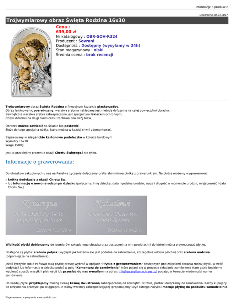 Informacje o produkcie Utworzono 08-03-2017 Trójwymiarowy obraz Święta Rodzina 16x30 Cena : 639,00 zł Nr katalogowy : OBR-SOV-R324 Producent : Sovrani Dostępność : Dostępny (wysyłamy w 24h) Stan magazynowy : niski Średnia ocena : brak recenzji Trójwymiarowy obraz Święta Rodzina o finezyjnym kształcie płaskorzeźby. Obraz laminowany, posrebrzany, warstwa srebrna nakładana jest metodą dyfuzyjną na całej powierzchni obrazka. Zewnętrzna warstwa srebra zabezpieczona jest specjalnym lakierem ochronnym, dzięki któremu na długi okres czasu zachowa ona swój blask. Obrazek można zawiesić na ścianie lub postawić. Służy do tego specjalna nóżka, którą można w każdej chwili zdemontować. Zapakowany w eleganckie kartonowe pudełeczko w kolorze bordowym Wymiary 16x30 Waga 1500g Jest to przepiękny prezent z okazji Chrztu Świętego.i nie tylko. Informacje o grawerowaniu: Do obrazków zakupionych u nas na Państwa życzenie dołączamy gratis aluminiową płytkę z grawerunkiem. Na płytce możemy wygrawerować: ● ● krótką dedykację z okazji Chrztu Św. lub informację o nowonarodzonym dziecku (polecamy: imię dziecka, data i godzina urodzin, waga i długość w momencie urodzin, miejscowość i data Chrztu Św.) Wielkość płytki dobierzemy do rozmiarów zakupionego obrazka oraz dostępnej na nim powierzchni do której można przymocować płytkę. Dostępne są płytki: srebrna połysk (wygląda jak lusterko ale jest podatna na zabrudzenia, szczególnie odciski palców) oraz srebrna matowa (odporniejsza na zabrudzenia). Jeżeli życzycie sobie Państwo taką płytkę proszę wybrać w opcjach "Płytka z grawerowaniem" dostępnych pod zdjęciami obrazka rodzaj płytki, a treść dedykacji lub informacje o dziecku podać w polu "Komentarz do zamówienia" które pojawi się w procesie składania zamówienia (tam gdzie będziemy wybierać sposób wysyłki i płatności) lub przesłać do nas e-mailem na adres: [email protected] podając w temacie wiadomości numer zamówienia. Do każdej płytki przyklejamy mocną cienką taśmę dwustronną zabezpieczoną od zewnątrz i w takiej postaci dołączamy do zamówienia. Każdy kupujący po otrzymaniu przesyłki po ściągnięciu z taśmy warstwy zabezpieczającej (proponujemy użyć ostrego nożyka) mocuje płytkę do produktu samodzielnie. Wygenerowano w programie www.oscGold.com Zgodnie z obowiązującym prawem oraz naszymi procedurami, możecie Państwo zwrócić zakupiony u nas towar bez podawania przyczyny przez 10 dni od dnia dostarczenia przesyłki. Ważne: przyjmujemy jedynie te produkty do których płytka nie została jeszcze przyklejona. Prosimy zatem o dokładne obejrzenie towaru i podjęcie decyzji o ewentualnym zwrocie przed przyklejeniem dostarczonej płytki. Zgodnie z art. 10 pkt. 4 ustawy z dnia 2 marca 2002 roku o ochronie praw konsumentów przy sprzedaży na odległość informujemy, że produkty z grawerunkiem (także z przyklejoną już płytką) są przygotowywane indywidualnie na "zamówienie specjalne", z tego powodu nie ma możliwości ich zwrotu lub anulowania zamówienia. Potrzebujesz więcej informacji? Zobacz: opis płytki z grawerunkiem do obrazków. PRZYKŁADOWE DEDYKACJE NA PŁYTKACH Ze względu na niewielkie rozmiary obrazka tekst grawerowany na płytce powinien być możliwie krótki. Przykładowe dedykacje: Piotrusiowi Piotrusiowi w dniu Chrztu Św. chrzestna Anna z okazji Chrztu Św. Ania i Tomek Kowalscy Warszawa 15.04.2014 Warszawa 15.04.2014 W dniu Chrztu Św. Piotrusiowi wszelkich pomyślności dziadek Tomek Piotruś ur. 01.11.2013, godz. 14:15 waga 3450g, dł. 53cm Warszawa 15.04.2014 Uwaga: nie należy zbyt mocno uciskać powierzchni obrazka, może to spowodować jego wgniecenie. Sposób pielęgnacji: 1. Obrazek należy czyścić wyłącznie czystą i delikatną ściereczką flanelową. 2. Stosować wyłącznie letnią wodę, by nie uszkodzić powłoki ochronnej. Gorąca woda może powodować rozpuszczenie się lakieru chroniącego powierzchnię. 3. Nie używać do czyszczenia zakupionego produktu detergentów, alkoholu i ściernych środków czyszczących, jak też ściereczek przeznaczonych do czyszczenia srebra. Próba srebra: 925 Waga [g]: 1500 g Szerokość [cm]: 16 Wysokość [cm]: 30 Kraj pochodzenia: włochy W komplecie: nóżka Dostępne opcje Trójwymiarowy obraz Święta Rodzina 16x30 » Płytka z grawerowaniem: bez grawerowania, płytka srebrna matowa + grawer gratis, płytka srebrna połysk + grawer gratis.
