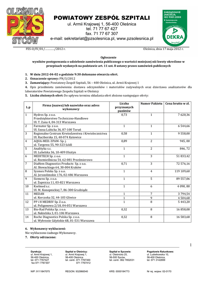 POWIATOWY ZESPÓŁ SZPITALI ul. Armii Krajowej 1, 56-400 Oleśnica tel. 71 77 67 427 fax. 71 77 67 307 e-mail: [email protected], www.pzsolesnica.pl PZS-O/IV/01/…………/2012 r. Oleśnica, dnia 17 maja 2012 r. Ogłoszenie wyników postępowania o udzielenie zamówienia publicznego o wartości mniejszej niż kwoty określone w przepisach wydanych na podstawie art. 11 ust. 8 ustawy prawo zamówień publicznych 1. W dniu 2012-04-02 o godzinie 9:30 dokonano otwarcia ofert. 2. Oznaczenie sprawy: PN/3/2012 3. Zamawiający: Powiatowy Zespół Szpitali, 56 – 400 Oleśnica, ul. Armii Krajowej 1 4. Opis przedmiotu zamówienia: dostawa odczynników i materiałów zużywalnych oraz dzierżawa analizatorów dla laboratoriów Powiatowego Zespołu Szpitali w Oleśnicy 5. Liczba złożonych ofert: Do upływu terminu składania ofert złożono następujące oferty: L.p 1 2 3 4 5 6 7 8 9 10 11 12 13 14 Firma (nazwa) lub nazwisko oraz adres wykonawcy Hydrex Sp. z o.o. Przedsiębiorstwo Techniczno-Handlowe Ul. T. Zana 4, 04-313 Warszawa Farmator Sp. z o.o. Ul. Szosa Lubicka 36, 87-100 Toruń Regionalne Centrum Krwiodawstwa i Krwiolecznictwa Ul. Raciborska 15, 40-074 Katowice AQUA-MED. ZPAM- Sp. j. ul. Targowa 55, 90-323 Łódź Analityka s.c. Ul. Lubelska 36, 10-409 Olsztyn MEDITECH Sp. z o.o. ul. Rzemieślnicza 54, 62-081 Przeźmierowo DiaHem Diagnostics Products Sp. z o.o. Al. Słowackiego 64, 30-004 Kraków Sysmex Polska Sp. z o.o. Al. Jerozolimskie 176, 02-486 Warszawa Siemens Sp. z o.o. ul. Żupnicza 11, 03-821 Warszawa Kselmed s.c. Ul. M. Konopnickiej 7, 86-300 Grudziądz MEDAN ul. Korczoka 32, 44-103 Gliwice PP i H MEDRIV Sp. Z o.o. ul. Poligonowa 2/18, 04-051 Warszawa Bio-Rad Polska Sp. z o.o. ul. Nakielska 3, 01-106 Warszawa Roche Diagnostics Polska Sp. z o.o. ul. Wybrzeże Gdyńskie 6B, 01-531 Warszawa Liczba przyznanych punktów 0,73 Numer Pakietu Cena brutto w zł. 1 7 620,36 1 1 6 544,66 0,58 1 9 558,00 0,89 2 945, 00 1 2 846, 72 1 3 51 833,42 0,71 3 72 576,16 1 4 119 109,60 1 5 89 557,06 1 6 4 090, 80 1 1 1 7 9 8 3 794,54 4 504,68 5 443,20 0,32 8 16 858,08 0,32 8 16 583,68 6. Wykonawcy wykluczeni: Nie wykluczono żadnego Wykonawcy. 7. Oferty odrzucone: 1 Dyrekcja: ul. Armii Krajowej 1, 56-400 Oleśnica, tel. 071 7767427 fax 071 7767307 Szpital w Oleśnicy: ul. Armii Krajowej 1, 56-400 Oleśnica tel. centr. 071 7767300 071 7767412 Szpital w Sycowie: ul. Oleśnicka 25, 56-500 Syców, tel. centr. 062 7852031 Pogotowie Ratunkowe: ul. Ludwikowska 10, 56-400 Oleśnica, tel. 071 3142899 NIP: 9111847075 REGON: 932966540 KRS: 0000184773 Nr rej. wojew: 02-0170 POWIATOWY ZESPÓŁ SZPITALI ul. Armii Krajowej 1, 56-400 Oleśnica tel. 71 77 67 427 fax. 71 77 67 307 e-mail: [email protected], www.pzsolesnica.pl Nie odrzucono żadnej oferty. 8. Ogłoszenie zostało zamieszczone w: siedzibie Zamawiającego oraz na stronie internetowej 9. Jako najkorzystniejszą wybrano ofertę: W zakresie Pakietu nr 1 Farmator Sp. z o.o., Ul. Szosa Lubicka 36, 87-100 Toruń Cena oferty brutto: 6 544,66 zł. Uzasadnienie: Treść oferty odpowiada treści SIWZ, Wykonawca spełnia warunki udziału w postępowaniu. Liczba otrzymanych punktów: 1 W zakresie Pakietu nr 2 Analityka s.c., Ul. Lubelska 36, 10-409 Olsztyn Cena oferty brutto: 846,72 zł. Uzasadnienie: Treść oferty odpowiada treści SIWZ, Wykonawca spełnia warunki udziału w postępowaniu. Liczba otrzymanych punktów: 1 W zakresie Pakietu nr 3 MEDITECH Sp. z o.o., ul. Rzemieślnicza 54, 62-081 Przeźmierowo Cena oferty brutto: 51 833,42 zł. Uzasadnienie: Treść oferty odpowiada treści SIWZ, Wykonawca spełnia warunki udziału w postępowaniu. Liczba otrzymanych punktów: 1 W zakresie Pakietu nr 4 Sysmex Polska Sp. z o.o., Al. Jerozolimskie 176, 02-486 Warszawa Cena oferty brutto: 119 109,60 zł. Uzasadnienie: Treść oferty odpowiada treści SIWZ, Wykonawca spełnia warunki udziału w postępowaniu. Liczba otrzymanych punktów: 1 W zakresie Pakietu nr 5 Siemens Sp. z o.o., ul. Żupnicza 11, 03-821 Warszawa Cena oferty brutto: 89 557,06 zł. Uzasadnienie: Treść oferty odpowiada treści SIWZ, Wykonawca spełnia warunki udziału w postępowaniu. Liczba otrzymanych punktów: 1 W zakresie Pakietu nr 6 Kselmed s.c., Ul. M. Konopnickiej 7, 86-300 Grudziądz Cena oferty brutto: 4 090,80 zł. Uzasadnienie: Treść oferty odpowiada treści SIWZ, Wykonawca spełnia warunki udziału w postępowaniu. Liczba otrzymanych punktów: 1 W zakresie Pakietu nr 7 MEDAN , ul. Korczoka 32, 44-103 Gliwice Cena oferty brutto: 3 794,54 zł. Uzasadnienie: Treść oferty odpowiada treści SIWZ, Wykonawca spełnia warunki udziału w postępowaniu. Liczba otrzymanych punktów: 1 W zakresie Pakietu nr 8 PP i H MEDRIV Sp. z o.o., ul. Poligonowa 2/18, 04-051 Warszawa 2 Dyrekcja: ul. Armii Krajowej 1, 56-400 Oleśnica, tel. 071 7767427 fax 071 7767307 Szpital w Oleśnicy: ul. Armii Krajowej 1, 56-400 Oleśnica tel. centr. 071 7767300 071 7767412 Szpital w Sycowie: ul. Oleśnicka 25, 56-500 Syców, tel. centr. 062 7852031 Pogotowie Ratunkowe: ul. Ludwikowska 10, 56-400 Oleśnica, tel. 071 3142899 NIP: 9111847075 REGON: 932966540 KRS: 0000184773 Nr rej. wojew: 02-0170 POWIATOWY ZESPÓŁ SZPITALI ul. Armii Krajowej 1, 56-400 Oleśnica tel. 71 77 67 427 fax. 71 77 67 307 e-mail: [email protected], www.pzsolesnica.pl Cena oferty brutto: 5 443,20 zł. Uzasadnienie: Treść oferty odpowiada treści SIWZ, Wykonawca spełnia warunki udziału w postępowaniu. Liczba otrzymanych punktów: 1 W zakresie Pakietu nr 9 MEDAN, ul. Korczoka 32, 44-103 Gliwice Cena oferty brutto: 4 504,68 zł. Uzasadnienie: Treść oferty odpowiada treści SIWZ, Wykonawca spełnia warunki udziału w postępowaniu. Liczba otrzymanych punktów: 1 10. Termin zawarcia umowy: Umowy zostaną podpisane przez Strony z datą – 23 maja 2012 r. na podstawie art. 94 ust. 1 pkt 1 ustawy Prawo zamówień publicznych. 11. Wykonawcom, jeżeli ich interes prawny w uzyskaniu zamówienia doznał lub może doznać uszczerbku, w wyniku naruszenia