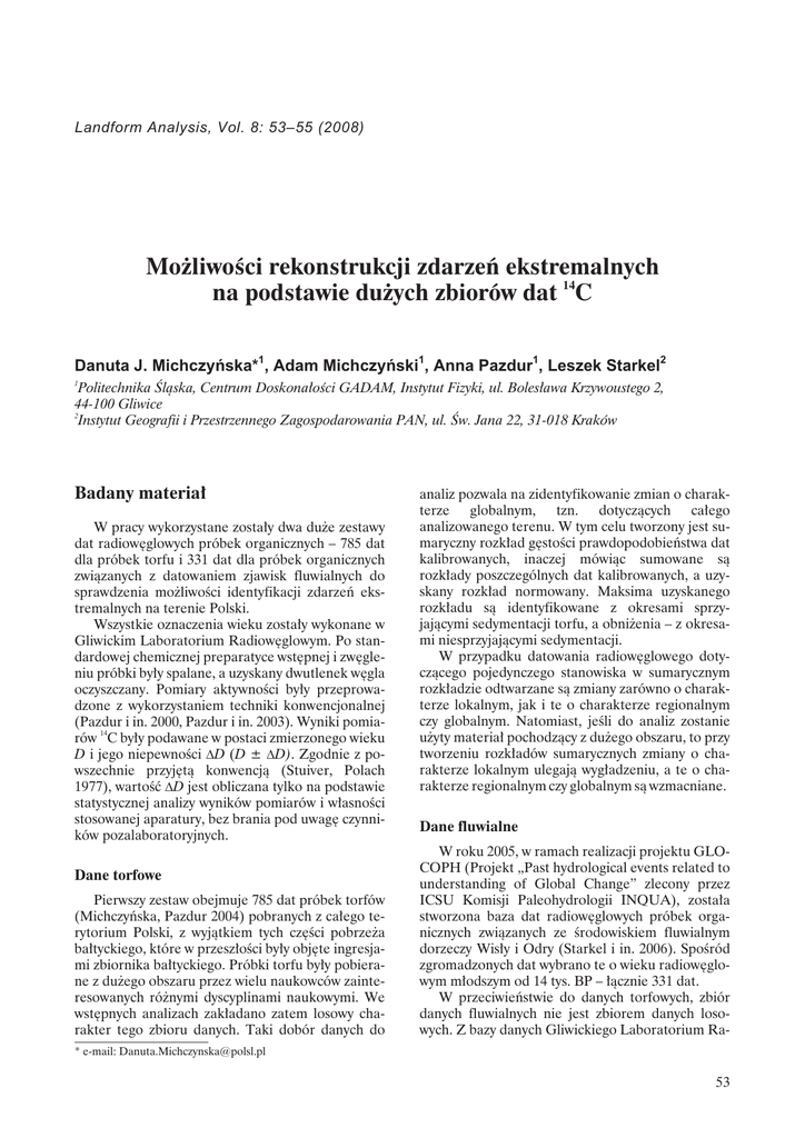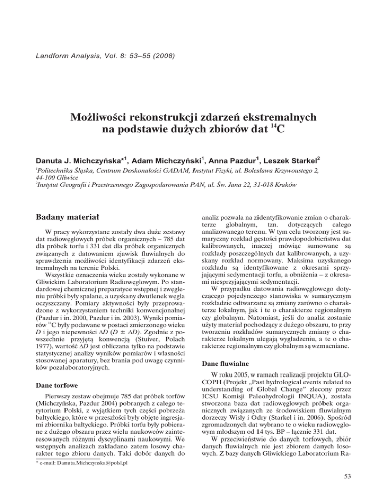 Landform Analysis, Vol. 8: 53–55 (2008) Możliwości rekonstrukcji zdarzeń ekstremalnych na podstawie dużych zbiorów dat 14C Danuta J. Michczyñska*1, Adam Michczyñski1, Anna Pazdur1, Leszek Starkel2 1 Politechnika Śląska, Centrum Doskonałości GADAM, Instytut Fizyki, ul. Bolesława Krzywoustego 2, 44-100 Gliwice 2 Instytut Geografii i Przestrzennego Zagospodarowania PAN, ul. Św. Jana 22, 31-018 Kraków Badany materiał W pracy wykorzystane zostały dwa duże zestawy dat radiowęglowych próbek organicznych – 785 dat dla próbek torfu i 331 dat dla próbek organicznych związanych z datowaniem zjawisk fluwialnych do sprawdzenia możliwości identyfikacji zdarzeń ekstremalnych na terenie Polski. Wszystkie oznaczenia wieku zostały wykonane w Gliwickim Laboratorium Radiowęglowym. Po standardowej chemicznej preparatyce wstępnej i zwęgleniu próbki były spalane, a uzyskany dwutlenek węgla oczyszczany. Pomiary aktywności były przeprowadzone z wykorzystaniem techniki konwencjonalnej (Pazdur i in. 2000, Pazdur i in. 2003). Wyniki pomia14 rów C były podawane w postaci zmierzonego wieku D i jego niepewności DD (D ± DD). Zgodnie z powszechnie przyjętą konwencją (Stuiver, Polach 1977), wartość DD jest obliczana tylko na podstawie statystycznej analizy wyników pomiarów i własności stosowanej aparatury, bez brania pod uwagę czynników pozalaboratoryjnych. Dane torfowe Pierwszy zestaw obejmuje 785 dat próbek torfów (Michczyńska, Pazdur 2004) pobranych z całego terytorium Polski, z wyjątkiem tych części pobrzeża bałtyckiego, które w przeszłości były objęte ingresjami zbiornika bałtyckiego. Próbki torfu były pobierane z dużego obszaru przez wielu naukowców zainteresowanych różnymi dyscyplinami naukowymi. We wstępnych analizach zakładano zatem losowy charakter tego zbioru danych. Taki dobór danych do analiz pozwala na zidentyfikowanie zmian o charakterze globalnym, tzn. dotyczących całego analizowanego terenu. W tym celu tworzony jest sumaryczny rozkład gęstości prawdopodobieństwa dat kalibrowanych, inaczej mówiąc sumowane są rozkłady poszczególnych dat kalibrowanych, a uzyskany rozkład normowany. Maksima uzyskanego rozkładu są identyfikowane z okresami sprzyjającymi sedymentacji torfu, a obniżenia – z okresami niesprzyjającymi sedymentacji. W przypadku datowania radiowęglowego dotyczącego pojedynczego stanowiska w sumarycznym rozkładzie odtwarzane są zmiany zarówno o charakterze lokalnym, jak i te o charakterze regionalnym czy globalnym. Natomiast, jeśli do analiz zostanie użyty materiał pochodzący z dużego obszaru, to przy tworzeniu rozkładów sumarycznych zmiany o charakterze lokalnym ulegają wygładzeniu, a te o charakterze regionalnym czy globalnym są wzmacniane. Dane fluwialne W roku 2005, w ramach realizacji projektu GLOCOPH (Projekt „Past hydrological events related to understanding of Global Change” zlecony przez ICSU Komisji Paleohydrologii INQUA), została stworzona baza dat radiowęglowych próbek organicznych związanych ze środowiskiem fluwialnym dorzeczy Wisły i Odry (Starkel i in. 2006). Spośród zgromadzonych dat wybrano te o wieku radiowęglowym młodszym od 14 tys. BP – łącznie 331 dat. W przeciwieństwie do danych torfowych, zbiór danych fluwialnych nie jest zbiorem danych losowych. Z bazy danych Gliwickiego Laboratorium Ra- * e-mail: [email protected] 53 Danuta J. Michczyñska, Adam Michczyñski, Anna Pazdur, Leszek Starkel diowęglowego (Piotrowska i in. 2004) dane fluwialne zostały wybrane w sposób celowy. Wszystkie próbki zostały przypisane do jednego z poniżej wymienionych ośmiu typów środowisk depozycyjnych: 1. szczątki organiczne zachowane w osadach korytowych w formie soczewek lub drobnych fragmentów materii organicznej (sedymentacja fluwialna Z i data D są równowiekowe, Z = D), 2. szczątki organiczne w spągu wypełnień odciętych paleokoryt (zdarzenie, czyli odcięcie koryta rzeki jest starsze od wieku datowanego materiału organicznego, Z > D), 3. materia organiczna (torf, mułki organiczne) ze stropu osadu facji pozakorytowej, przykryta przez osady korytowe (Z < D), 4. torf lub gleba kopalna przykryta przez osady facji pozakorytowej związane z powodzią (Z < D), 5. osad facji korytowej przykryty przez osady pozakorytowe zawierające szczątki organiczne (Z < D), 6. wkładki mineralne w sekwencji torfów (Z = D), 7. spąg torfu leżącego nad osadami pozakorytowymi (Z > D), 8. wkładki organiczne w osadach pozakorytowych (Z = D). Ze względu na możliwość redepozycji, z analiz zostały wykluczone daty uzyskane dla pni drzew. Uzyskane wyniki i ich dyskusja Sumaryczne rozkłady gęstości prawdopodobieństwa dla obu analizowanych zestawów dat przedstawione są na rycinie 1a i b. Przy analizie wykresów szczególną uwagę zwracają następujące fakty: – cechą charakterystyczną obu wykresów jest występowanie wysokich, wąskich maksimów; – obydwa wykresy są dobrze skorelowane ze sobą; – ocieplenie klimatu, które rozpoczęło się po okresie zlodowacenia znajduje swoje odzwierciedlenie w stopniowo narastającej wysokości rozkładów sumarycznych, przy czym wyraźny wzrost notuje się od 14 tys. cal BP – warunki klimatyczne sprzyjają sedymentacji torfów, jak i zmianom reżimu hydrologicznego rzek; – okres młodszego dryasu zaznaczony jest na obu wykresach przez obniżenie; był to okres chłodny i suchy, niesprzyjający ani sedymentacji torfów, ani zachowaniu szczątków organicznych w osadach rzecznych; – okres preborealny rozpoczyna się wzrostem wysokości obu wykresów, przy czym dane fluwialne rejestrują maksimum związane z nagłą zmianą reżimu hydrologicznego; – początek i koniec okresu borealnego zaznaczony jest dla danych torfowych wysokimi wąskimi maksimami, a dla danych fluwialnych wyraźny wzrost Ryc. 1. Sumaryczne rozkłady gęstości prawdopodobieństwa dla danych torfowych i fluwialnych 54 Mo¿liwoœci rekonstrukcj