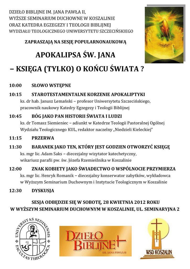 DZIEŁO BIBLIJNE IM. JANA PAWŁA II, WYŻSZE SEMINARIUM DUCHOWNE W KOSZALINIE ORAZ KATEDRA EGZEGEZY I TEOLOGII BIBLIJNEJ WYDZIAŁU TEOLOGICZNEGO UNIWERSYTETU SZCZECIŃSKIEGO ZAPRASZAJĄ NA SESJĘ POPULARNONAUKOWĄ APOKALIPSA ŚW. JANA − KSIĘGA (TYLKO) O KOŃCU ŚWIATA ? 10:00 SŁOWO WSTĘPNE 10:15 STAROTESTAMENTALNE KORZENIE APOKALIPTYKI ks. dr hab. Janusz Lemański − profesor Uniwersytetu Szczecińskiego, pracownik naukowy Katedry Egzegezy i Teologii Biblijnej 10:45 BÓG JAKO PAN HISTORII ŚWIATA I LUDZI ks. dr Tomasz Siemieniec − adiunkt w Katedrze Teologii Pastoralnej Ogólnej Wydziału Teologicznego KUL, redaktor naczelny „Niedzieli Kieleckiej” 11:15 PRZERWA 11:30 BARANEK JAKO TEN, KTÓRY JEST GODZIEN OTWORZYĆ KSIĘGĘ ks. mgr lic. Adam Saks − diecezjalny wizytator katechetyczny, wikariusz parafii pw. św. Józefa Rzemieślnika w Koszalinie 12:00 ZNAK KOBIETY JAKO ŚWIADECTWO O WSPÓLNOCIE PRZYMIERZA ks. mgr lic. Henryk Romanik − diecezjalny konserwator zabytków, wykładowca w Wyższym Seminarium Duchownym i Instytucie Teologicznym w Koszalinie 12:30 DYSKUSJA SESJA ODBĘDZIE SIĘ W SOBOTĘ, 28 KWIETNIA 2012 ROKU W WYŻSZYM SEMINARIUM DUCHOWNYM W KOSZALINIE, UL. SEMINARYJNA 2