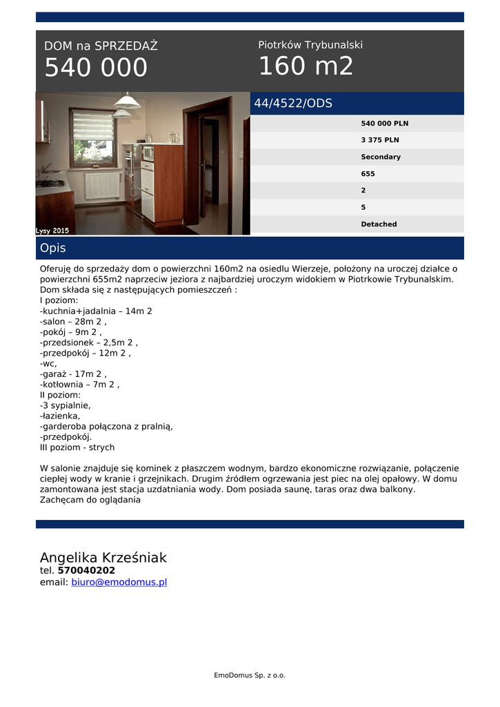 DOM na SPRZEDAŻ 540 000 Piotrków Trybunalski 160 m2 44/4522/ODS 540 000 PLN 3 375 PLN Secondary 655 2 5 Detached Opis Oferuję do sprzedaży dom o powierzchni 160m2 na osiedlu Wierzeje, położony na uroczej działce o powierzchni 655m2 naprzeciw jeziora z najbardziej uroczym widokiem w Piotrkowie Trybunalskim. Dom składa się z następujących pomieszczeń : I poziom: -kuchnia+jadalnia – 14m 2 -salon – 28m 2 , -pokój – 9m 2 , -przedsionek – 2,5m 2 , -przedpokój – 12m 2 , -wc, -garaż - 17m 2 , -kotłownia – 7m 2 , II poziom: -3 sypialnie, -łazienka, -garderoba połączona z pralnią, -przedpokój. III poziom - strych W salonie znajduje się kominek z płaszczem wodnym, bardzo ekonomiczne rozwiązanie, połączenie ciepłej wody w kranie i grzejnikach. Drugim źródłem ogrzewania jest piec na olej opałowy. W domu zamontowana jest stacja uzdatniania wody. Dom posiada saunę, taras oraz dwa balkony. Zachęcam do oglądania Angelika Krześniak tel. 570040202 email: [email protected] EmoDomus Sp. z o.o. Powered by TCPDF (www.tcpdf.org)