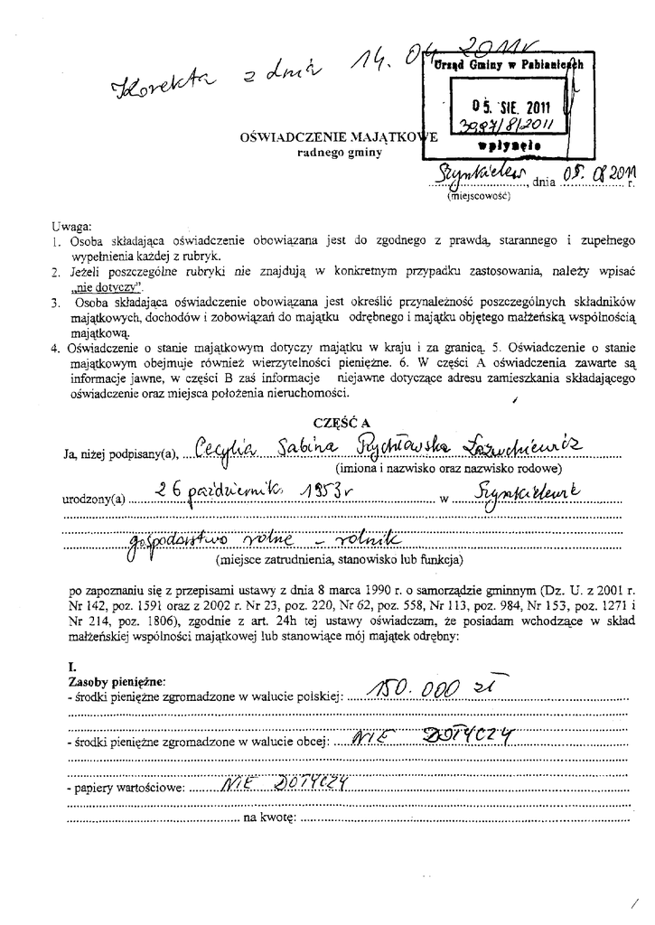 korekta oświadczenia majątkowego za rok 2010 składanego do