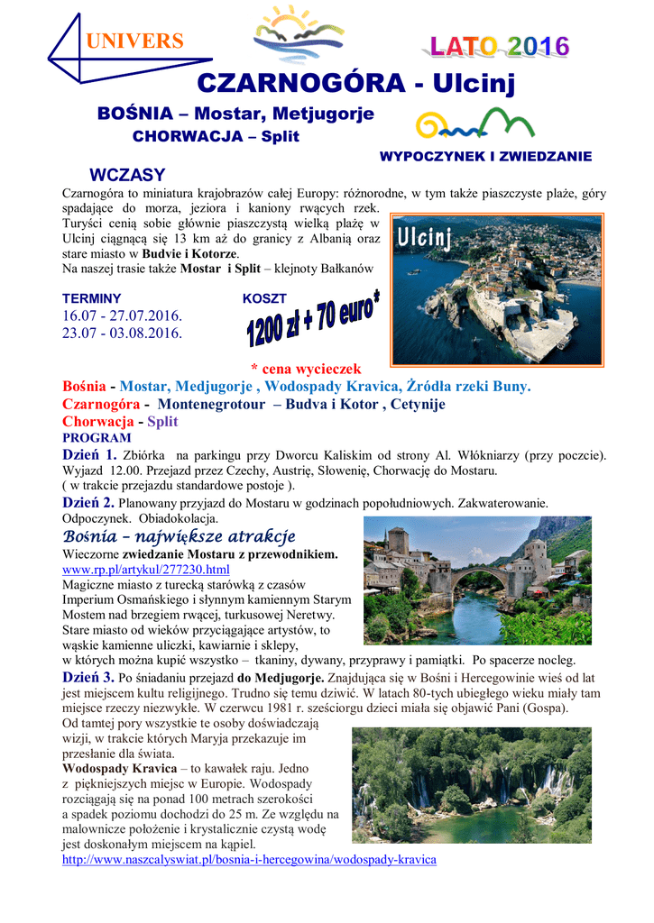 UNIVERS CZARNOGÓRA - Ulcinj BOŚNIA – Mostar, Metjugorje CHORWACJA – Split WYPOCZYNEK I ZWIEDZANIE WCZASY Czarnogóra to miniatura krajobrazów całej Europy: różnorodne, w tym także piaszczyste plaże, góry spadające do morza, jeziora i kaniony rwących rzek. Turyści cenią sobie głównie piaszczystą wielką plażę w Ulcinj ciągnącą się 13 km aż do granicy z Albanią oraz stare miasto w Budvie i Kotorze. Na naszej trasie także Mostar i Split – klejnoty Bałkanów TERMINY KOSZT 16.07 - 27.07.2016. 23.07 - 03.08.2016. * cena wycieczek Bośnia - Mostar, Medjugorje , Wodospady Kravica, Żródła rzeki Buny. Czarnogóra - Montenegrotour – Budva i Kotor , Cetynije Chorwacja - Split PROGRAM Dzień 1. Zbiórka na parkingu przy Dworcu Kaliskim od strony Al. Włókniarzy (przy poczcie). Wyjazd 12.00. Przejazd przez Czechy, Austrię, Słowenię, Chorwację do Mostaru. ( w trakcie przejazdu standardowe postoje ). Dzień 2. Planowany przyjazd do Mostaru w godzinach popołudniowych. Zakwaterowanie. Odpoczynek. Obiadokolacja. Bośnia – największe atrakcje Wieczorne zwiedzanie Mostaru z przewodnikiem. www.rp.pl/artykul/277230.html Magiczne miasto z turecką starówką z czasów Imperium Osmańskiego i słynnym kamiennym Starym Mostem nad brzegiem rwącej, turkusowej Neretwy. Stare miasto od wieków przyciągające artystów, to wąskie kamienne uliczki, kawiarnie i sklepy, w których można kupić wszystko – tkaniny, dywany, przyprawy i pamiątki. Po spacerze nocleg. Dzień 3. Po śniadaniu przejazd do Medjugorje. Znajdująca się w Bośni i Hercegowinie wieś od lat jest miejscem kultu religijnego. Trudno się temu dziwić. W latach 80-tych ubiegłego wieku miały tam miejsce rzeczy niezwykłe. W czerwcu 1981 r. sześciorgu dzieci miała się objawić Pani (Gospa). Od tamtej pory wszystkie te osoby doświadczają wizji, w trakcie których Maryja przekazuje im przesłanie dla świata. Wodospady Kravica – to kawałek raju. Jedno z piękniejszych miejsc w Europie. Wodospady rozciągają się na ponad 100 metrach szerokości a spadek poziomu dochodzi do 25 m. Ze względu na malownicze położenie i krystalicznie czystą wodę jest doskonałym miejscem na kąpiel. http://www.naszcalyswiat.pl/bosnia-i-hercegowina/wodospady-kravica Żródła rzeki Buny - Niedaleko Mostaru znajduje się przeuroczy Blagaj. Rzeka Buna (vrelo Bune) wypływa tutaj spod 200-metrowego wapiennego klifu, a tuż obok pulsującej wodnej otchłani, przycupnięta do skały znajduje się XVI-wieczna tekija - dom derwiszów. http://www.youtube.com/watch?v=KN4A52iB1uM Po zwiedzaniu przejazd do miejsca zakwaterowania. Obiadokolacja. Nocleg. Dzień 4. Po śniadaniu przejazd do miejsca zakwaterowania w Ulcinj. Nocleg. Dzień 5-10. Pobyt w Ulcinj - to miejscowość wypoczynkowa położona w południowej części czarnogórskiego wybrzeża Adriatyku. Historia miasta liczy sobie 3 tysiące lat. Na przestrzeni wieków miastem władali między innymi: Grecy, Rzymianie, Wenecjanie i Turcy. Piaszczysta Wielka Plaża nazywana także Saharą to najbardziej popularne miejsce na tym wybrzeżu. Ulcinj to również miejsce, w którym odbywają się różnego rodzaju imprezy kulturalne i rozrywkowe. Realizacja programu wypoczynkowego i krajoznawczego, w tym między innymi : Wyjścia na starówkę, spacery po okolicy. Plażowanie i kąpiele. Montenegro Tour. Kotor. Spośród wielu miejscowości zlokalizowanych na brzegach Boki Kotorskiej – największego fiordu Europy Południowej szczególnie zachwyca sam Kotor. Starówkę otaczają potężne mury obronne. Spacer średniowiecznymi krętymi uliczkami, wręcz stworzonymi do spacerów. Mijamy nieregularne place, wspaniałe świątynie i budynki świadczące o bogactwie jego mieszkańców. Budva - to jedno z najstarszych i najpiękniejszych miast na wybrzeżu adriatyckim. Wizytówką miasta są dziś rzymskie budowle, śródziemnomorska architektura i cerkwie. Średniowieczna starówka, nad którą góruje cytadela to prawdziwy labirynt wąskich uliczek i usłanych kawiarniami placyków. Dzień 11. Wykwaterowanie, wyjazd do Polski Chorwacja – Split . Po drodze zapraszamy do Splitu. Zwiedzanie z przewodnikiem. Split to wspaniałe miasto, zwłaszcza jego nadmorska część: piękna aleja wysadzana drzewami, zacienione tarasy, niesamowita zatoka otoczona wzgórzami. Największą atrakcją są pozostałości pałacu cesarza Dioklecjana. Pałac z biegiem czasu zamienił się w element Starego Miasta - dawne korytarze i komnaty pałacu są dziś uliczkami i placykami centrum Splitu. Pałac można opuścić jedną z dwóch bram: Złotą lub Srebrną. Wyjazd ze Splitu w godzinach wieczornych Dzień 12. Przyjazd do Polski w godzinach wieczornych. ŚWIADCZENIA: Zakwaterowanie : Mostar – hotel. Ulcinj - Apartamenty prywatne zlokalizowane blisko najdłuższej plaży w Czarnogórze.. Pokoje 2 - 3 osobowe z pełnym węzłem sanitarnym. Klimatyzacja w cenie. Wyżywienie : Mostar - 2 śniadania i 2 obiadokolacje Transport: autokar o podwyższonym standardzie (klimatyzacja, wc, barek – możliwość zakupienia napojów ) Opieka: polskojęzycznego rezydenta, Uwaga ! na wyjazd konieczny jest paszport lub dowód osobisty Cena nie obejmuje: - ubezpieczenia KL i NNW, (KL: 10.000 euro, NNW: 5.000 euro ) - 50 zł (płatne obowiązkowo w biurze) - opłaty klimatycznej 10 euro/pobyt (płatne w autokarze) UNIVERS – Biuro Turystyczne 90-307 Łódź Al. J. Piłsudskiego 35 tel. (42) 630 52 12 [email protected] fax (42) 633 79 00 www.btunivers.pl