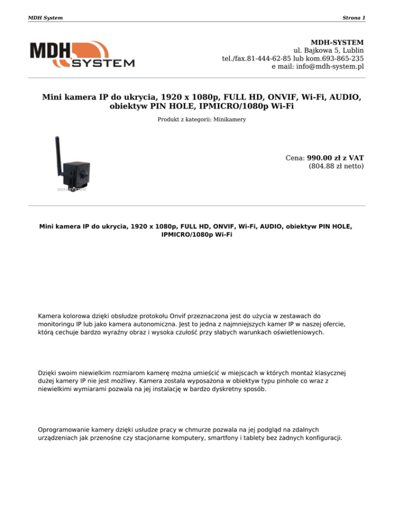 MDH System Strona 1 MDH-SYSTEM ul. Bajkowa 5, Lublin tel./fax.81-444-62-85 lub kom.693-865-235 e mail: [email protected] Mini kamera IP do ukrycia, 1920 x 1080p, FULL HD, ONVIF, Wi-Fi, AUDIO, obiektyw PIN HOLE, IPMICRO/1080p Wi-Fi Produkt z kategorii: Minikamery Cena: 990.00 zł z VAT (804.88 zł netto) Mini kamera IP do ukrycia, 1920 x 1080p, FULL HD, ONVIF, Wi-Fi, AUDIO, obiektyw PIN HOLE, IPMICRO/1080p Wi-Fi Kamera kolorowa dzięki obsłudze protokołu Onvif przeznaczona jest do użycia w zestawach do monitoringu IP lub jako kamera autonomiczna. Jest to jedna z najmniejszych kamer IP w naszej ofercie, którą cechuje bardzo wyraźny obraz i wysoka czułość przy słabych warunkach oświetleniowych. Dzięki swoim niewielkim rozmiarom kamerę można umieścić w miejscach w których montaż klasycznej dużej kamery IP nie jest możliwy. Kamera została wyposażona w obiektyw typu pinhole co wraz z niewielkimi wymiarami pozwala na jej instalację w bardzo dyskretny sposób. Oprogramowanie kamery dzięki usłudze pracy w chmurze pozwala na jej podgląd na zdalnych urządzeniach jak przenośne czy stacjonarne komputery, smartfony i tablety bez żadnych konfiguracji. MDH System Strona 2 Aby uruchomić zdalny podgląd z tej kamery nie jest wymagany stały adres IP czy przekierowywanie portów co znacznie upraszcza jej obsługę. ● ● ● ● ● ● ● ● ● ● ● ● ● ● ● ● ● ● ● ● ● ● ● ● STANDARD ONVIF 2.0 standard pozwalający na wpółpracę kamery z innymi urządzeniami ONVIF OBRAZ FULL HD WYSOKIEJ JAKOŚCI - 1920 x 1080 @ 25kl/s WYGODNY INTERFACE WEB Kompresja h.264 Funkcja Cloud - P2P AUDIO - wbudowany mikrofon Serwisy DDNS: CN99, DynDns, Oray, NO-IP.COM, Myq-See.com Obsługa na smartfonie Android/iPhone przez popularne aplikacje: vMeye, vMeye Cloud Dodatkowe oprogramowanie CMS Windows do obsługi 64 kamer w wersji polskiej Przetwornik: 1/2,5" CMOS Max rozdzielczość: 1920x1080 Minimalne oświetlenie: 0,5 LUX Obiektyw typu pinhole 3,7 mm Funkcja Mirror i Flip Kompresja: h.264 (BitRate regulowany) Transmisja od 1 do 25kl/s Port sieciowy: RJ45/10-100 Standard ONVIF 2.0 Protokół sieciowy: TCP/IP, RTSP, UDP/IP, HTTP, SMTP, DHCP, DDNS, UPNP, NTP Automatyczny balans bieli Zasilanie: 12V 1A (zasilacz nie wchodzi w skład zestawu) Zakres temperatur pracy: od -10 do 50 st. C Zastosowanie: Kamera przeznaczona jest do pracy wewnątrz pomieszczeń, ze względu na możliwość kondensacji pary wodnej. Wymiary: ok .40x40x35 mm ( moduł kamery bez złączy i uchwytu) Zapraszamy do naszego sklepu internetowego www.mdh-system.pl Dokument wygenerowany 2017-03-08 o godzinie 21:38