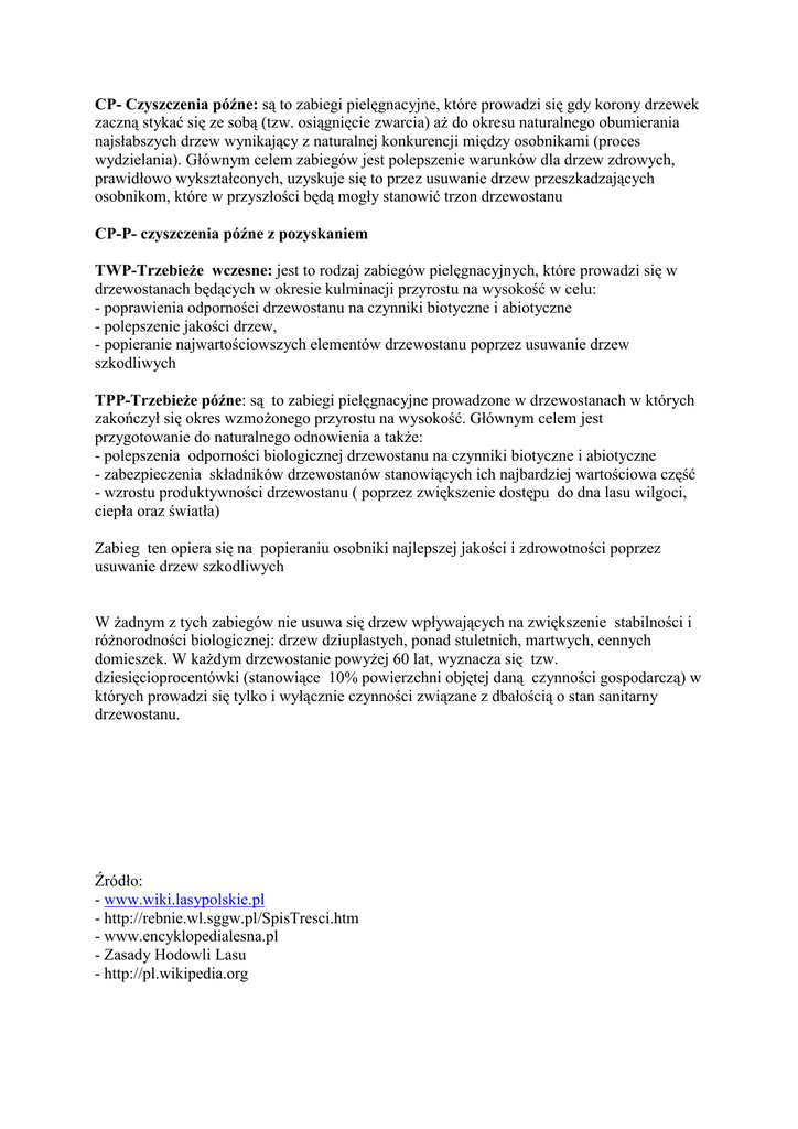 CP- Czyszczenia późne: są to zabiegi pielęgnacyjne, które prowadzi się gdy korony drzewek zaczną stykać się ze sobą (tzw. osiągnięcie zwarcia) aŜ do okresu naturalnego obumierania najsłabszych drzew wynikający z naturalnej konkurencji między osobnikami (proces wydzielania). Głównym celem zabiegów jest polepszenie warunków dla drzew zdrowych, prawidłowo wykształconych, uzyskuje się to przez usuwanie drzew przeszkadzających osobnikom, które w przyszłości będą mogły stanowić trzon drzewostanu CP-P- czyszczenia późne z pozyskaniem TWP-TrzebieŜe wczesne: jest to rodzaj zabiegów pielęgnacyjnych, które prowadzi się w drzewostanach będących w okresie kulminacji przyrostu na wysokość w celu: - poprawienia odporności drzewostanu na czynniki biotyczne i abiotyczne - polepszenie jakości drzew, - popieranie najwartościowszych elementów drzewostanu poprzez usuwanie drzew szkodliwych TPP-TrzebieŜe późne: są to zabiegi pielęgnacyjne prowadzone w drzewostanach w których zakończył się okres wzmoŜonego przyrostu na wysokość. Głównym celem jest przygotowanie do naturalnego odnowienia a takŜe: - polepszenia odporności biologicznej drzewostanu na czynniki biotyczne i abiotyczne - zabezpieczenia składników drzewostanów stanowiących ich najbardziej wartościowa część - wzrostu produktywności drzewostanu ( poprzez zwiększenie dostępu do dna lasu wilgoci, ciepła oraz światła) Zabieg ten opiera się na popieraniu osobniki najlepszej jakości i zdrowotności poprzez usuwanie drzew szkodliwych W Ŝadnym z tych zabiegów nie usuwa się drzew wpływających na zwiększenie stabilności i róŜnorodności biologicznej: drzew dziuplastych, ponad stuletnich, martwych, cennych domieszek. W kaŜdym drzewostanie powyŜej 60 lat, wyznacza się tzw. dziesięcioprocentówki (stanowiące 10% powierzchni objętej daną czynności gospodarczą) w których prowadzi się tylko i wyłącznie czynności związane z dbałością o stan sanitarny drzewostanu. Źródło: - www.wiki.lasypolskie.pl - http://rebnie.wl.sggw.pl/SpisTresci.htm - www.encyklopedialesna.pl - Zasady Hodowli Lasu - http://pl.wikipedia.org