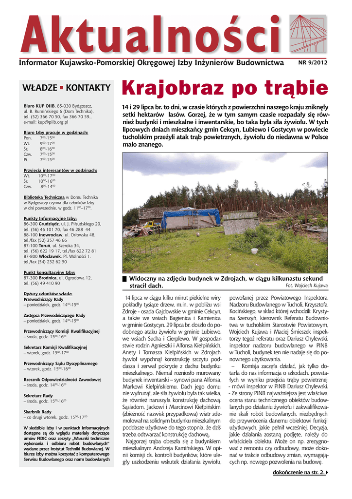 Informator Kujawsko-Pomorskiej Okręgowej Izby Inżynierów Budownictwa WŁADZE KONTAKTY Biuro KUP OIIB, 85-030 Bydgoszcz, ul. B. Rumińskiego 6 (Dom Technika), tel. (52) 366 70 50, fax 366 70 59., e-mail: [email protected] Biuro Izby pracuje w godzinach: Pon. 700-1500 Wt. 900-1700 Śr. 800-1600 Czw. 700-1500 Pt. 700-1500 NR 9/2012 Krajobraz po trąbie 14 i 29 lipca br. to dni, w czasie których z powierzchni naszego kraju zniknęły setki hektarów lasów. Gorzej, że w tym samym czasie rozpadały się również budynki i mieszkalne i inwentarskie, bo taka była siła żywiołu. W tych lipcowych dniach mieszkańcy gmin Cekcyn, Lubiewo i Gostycyn w powiecie tucholskim przeżyli atak trąb powietrznych, żywiołu do niedawna w Polsce mało znanego. Przyjęcia interesantów w godzinach: Wt. 1000-1700 Śr. 1000-1600 Czw. 800-1400 Biblioteka Techniczna w Domu Technika w Bydgoszczy czynna dla członków Izby w dni powszednie, w godz. 1100–1700. Punkty Informacyjne Izby: 86-300 Grudziądz, ul. J. Piłsudskiego 20, tel. (56) 46 101 70, fax 46 288 44 88-100 Inowrocław, ul. Orłowska 48, tel./fax (52) 357 46 66 87-100 Toruń, ul. Szeroka 34, tel. (56) 622 19 17, tel./fax 622 72 81 87-800 Włocławek, Pl. Wolności 1, tel./fax (54) 232 62 50 Punkt konsultacyjny Izby: 87-300 Brodnica, ul. Ogrodowa 12, tel. (56) 49 410 90 Dyżury członków władz: Przewodniczący Rady – poniedziałek, godz. 1400-1500 Zastępca Przewodniczącego Rady – poniedziałek, godz. 1400-1500 Przewodniczący Komisji Kwalifikacyjnej – środa, godz. 1500-1600 Sekretarz Komisji Kwalifikacyjnej – wtorek, godz. 1500-1700 Przewodniczący Sądu Dyscyplinarnego – wtorek, godz. 1500-1600 Rzecznik Odpowiedzialności Zawodowej – środa, godz. 1400-1600 Sekretarz Rady – środa, godz. 1500-1600 Skarbnik Rady – co drugi wtorek, godz. 1500-1700 W siedzibie Izby i w punktach informacyjnych dostępne są do wglądu materiały dotyczące umów FIDIC oraz zeszyty „Warunki techniczne wykonania i odbioru robót budowlanych” wydane przez Instytut Techniki Budowlanej. W biurze Izby można korzystać z komputerowego Serwisu Budowlanego oraz norm budowlanych Widoczny na zdjęciu budynek w Zdrojach, w ciągu kilkunastu sekund Fot. Wojciech Kujawa stracił dach. 14 lipca w ciągu kilku minut piekielne wiry pokładły tysiące drzew, m.in. w pobliżu wsi Zdroje - osada Gajdowskie w gminie Cekcyn, a także we wsiach Bagienica i Kamienica w gminie Gostycyn. 29 lipca br. doszło do podobnego ataku żywiołu w gminie Lubiewo, we wsiach Sucha i Cierplewo. W gospodarstwie rodzin Agnieszki i Alfonsa Kiełpińskich, Anety i Tomasza Kiełpińskich w Zdrojach żywioł wypchnął konstrukcję szczytu poddasza i zerwał pokrycie z dachu budynku mieszkalnego. Niemal rozniosło murowany budynek inwentarski – synowi pana Alfonsa, Markowi Kiełpińskiemu. Dach jego domu nie wyfrunął, ale siła żywiołu była tak wielka, że również naruszyła konstrukcję dachową. Sąsiadom, Jackowi i Marcinowi Kiełpińskim (zbieżność nazwisk przypadkowa) wiatr zdemolował na solidnym budynku mieszkalnym poddasze użytkowe do tego stopnia, że dziś trzeba odtwarzać konstrukcję dachową. Najgorzej trąba obeszła się z budynkiem mieszkalnym Andrzeja Kamińskiego. W opinii komisji ds. kontroli budynków, które uległy uszkodzeniu wskutek działania żywiołu, powołanej przez Powiatowego Inspektora Nadzoru Budowlanego w Tucholi, Krzysztofa Kocińskiego, w skład której wchodzili: Krystyna Szerszyń, kierownik Referatu Budownictwa w tucholskim Starostwie Powiatowym, Wojciech Kujawa i Maciej Śmieszek inspektorzy tegoż referatu oraz Dariusz Chylewski, inspektor nadzoru budowlanego w PINB w Tucholi, budynek ten nie nadaje się do ponownego użytkowania. –– Komisja zaczęła działać, jak tylko dotarła do nas informacja o szkodach, powstałych w wyniku przejścia trąby powietrznej - mówi inspektor w PINB Dariusz Chylewski. - Ze strony PINB najważniejsza jest właściwa ocena stanu technicznego obiektów budowlanych po działaniu żywiołu i zakwalifikowanie skali robót budowlanych, niezbędnych do przywrócenia danemu obiektowi funkcji użytkowych, jakie pełnił wcześniej. Decyzja, jakie działania zostaną podjęte, należy do właściciela obiektu. Może on np. zrezygnować z remontu czy odbudowy, może dokonać w trakcie odbudowy zmian, wymagających np. nowego pozwolenia na budowę. dokończenie na str. 2. Informator Kujawsko-Pomorskiej Okręgowej Izby Inżynierów Budownictwa wrzesień 2012 dokończenie ze str. 1. Krystyna Szerszyń przy zniszczonym budynku Andrzeja Kamińskiego w Zdrojach. PINB orzekł tu stan katastrofy budowlanej. Fot. Tadeusz Kozłowski –– Kwalifikacji, co trzeba zrobić, w celu zabezpieczenia obiektu czy budynku, dokonaliśmy na podstawie oględzin na miejscu zdarzenia, zrobionych tam zdjęć i sporządzonych w oparciu o szczegółowe kontrole protokołów z oględzin - mówi Krystyna Szerszyń. –– Na podstawie protokołów można było stwierdzić, czy np. budynek jest w stanie katastrofy budowlanej, czyli nie da się przywrócić mu pierwotnych funkcji użytkowych. PINB zobowiązuje wówczas właściciela do zabezpieczenia takiego budynku. Możemy też stwierdzić, czy ocena stanu technicznego wymaga dodatkowych ekspertyz rzeczoznawców. Na podstawie tych wszystkich ocen ustalamy, czy wystarczy dokonanie remontu uszkodzonego budynku, czy też konieczne są roboty o większym zakresie, mieszczące się w zakresie odbudowy i wymagające w normalnym trybie już nowego pozwolenia na budowę. –– Jak wygląda bilans strat po przejściu trąb powietrznych, sporządzony przez PINB i komisję w powiecie tucholskim? Dariusz Chylewski wylicza po kolei. W Zdrojach - Gajdowskie (gmina Cekcyn) - zostało uszkodzonych 6 budynków mieszkalnych, z czego jeden nie nadaje się do zamieszkania. Uszkodzone zostały też 3 budynki inwentarskie, jeden garaż i 5 budynków składowych, z czego jeden jest zniszczony w 100%