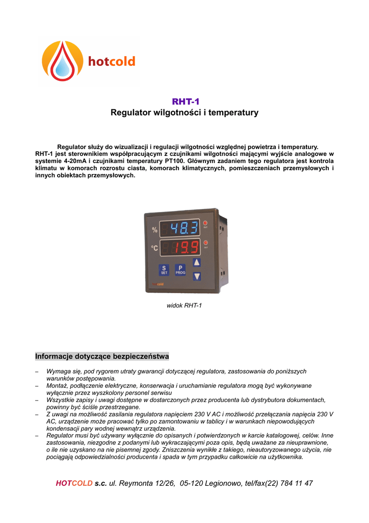 RHT-1 Regulator wilgotności i temperatury Regulator służy do wizualizacji i regulacji wilgotności względnej powietrza i temperatury. RHT-1 jest sterownikiem współpracującym z czujnikami wilgotności mającymi wyjście analogowe w systemie 4-20mA i czujnikami temperatury PT100. Głównym zadaniem tego regulatora jest kontrola klimatu w komorach rozrostu ciasta, komorach klimatycznych, pomieszczeniach przemysłowych i innych obiektach przemysłowych. widok RHT-1 Informacje dotyczące bezpieczeństwa – – – – – Wymaga się, pod rygorem utraty gwarancji dotyczącej regulatora, zastosowania do poniższych warunków postępowania. Montaż, podłączenie elektryczne, konserwacja i uruchamianie regulatora mogą być wykonywane wyłącznie przez wyszkolony personel serwisu Wszystkie zapisy i uwagi dostępne w dostarczonych przez producenta lub dystrybutora dokumentach, powinny być ściśle przestrzegane. Z uwagi na możliwość zasilania regulatora napięciem 230 V AC i możliwość przełączania napięcia 230 V AC, urządzenie może pracować tylko po zamontowaniu w tablicy i w warunkach niepowodujących kondensacji pary wodnej wewnątrz urządzenia. Regulator musi być używany wyłącznie do opisanych i potwierdzonych w karcie katalogowej, celów. Inne zastosowania, niezgodne z podanymi lub wykraczającymi poza opis, będą uważane za nieuprawnione, o ile nie uzyskano na nie pisemnej zgody. Zniszczenia wynikłe z takiego, nieautoryzowanego użycia, nie pociągają odpowiedzialności producenta i spada w tym przypadku całkowicie na użytkownika. HOTCOLD s.c. ul. Reymonta 12/26, 05-120 Legionowo, tel/fax(22) 784 11 47 Transport i magazynowanie – – – – Urządzenie musi być transportowane w opakowaniu uniemożliwiającym uszkodzenie mechaniczne i dostęp do zewnętrznych warunków atmosferycznych. Szczególną uwagę należy zwrócić na uszkodzenie opakowania lub przyrządu. Magazynowanie przyrządu powinno odbywać się w suchym pomieszczeniu, bez narażania na warunki atmosferyczne, a w innym przypadku należy pamiętać o ochronie przed zabrudzeniem i wpływem warunków atmosferycznych do chwili ostatecznego zamontowania. W czasie transportowania, magazynowania jak i pracy należy unikać narażania przyrządu na działanie bardzo wysokich i bardzo niskich temperatur. – Parametry podlegające programowaniu: Programowaniu podlegają następujące parametry, oznaczone symbolami: P1 – wartość nastawy temperatury P2 – histereza przełączania przekaźnika TEMP ustawiana w zakresie +/-0,1°C...+/-10°C P3 – offset ( odchyłka wskazania temperatury ustawiana w zakresie +/-10°C P4 – tryb pracy przekaźnika TEMP, ustaw 1 – grzanie, 2 – chłodzenie P5 – wartość nastawy wilgotności P6 – histereza przełączania przekaźnika RH ustawiana w zakresie +/-0,1%...+/-10% P7 – offset ( odchyłka wskazania wilgotności ustawiana w zakresie +/-10% P8 – tryb pracy przekaźnika RH, ustaw 1 – nawilżanie, 2 – osuszanie Programowanie – postępowanie: Programowanie regulatora zaczynamy od przyciśnięcia klawisza PROG. Na górnym wyświetlaczu pokaże się wartość cyfrowa parametru, którego nazwa wyświetlona jest na wyświetlaczu dolnym. Należy przycisnąć ponownie klawisz PROG, zacznie mrugać wartość cyfrowa i można wtedy zmienić klawiszami strzałek jej wartość, którą zapamiętujemy ponownie przyciskiem PROG. Następnie klawiszem strzałki GÓRA przechodzimy do następnego parametru i powtarzamy czynność programowania i zapamiętania lub wychodzimy klawiszem SET z programowania. UWAGA! Dostępne jest szybkie programowanie progów zadziałania przekaźnika dla wilgotności po naciśnięciu klawisza strzałki DÓŁ, a temperatury klawisza strzałki GÓRA. Po przyciśnięciu strzałki DÓŁ zacznie migać górny wyświetlacz i w tym momencie strzałkami ustawiamy żądaną wartość wilgotności i zatwierdzamy klawiszem PROG. Aby ustawić wartość progu temperatury, naciskamy klawisz strzałki GÓRA i postępujemy jak wyżej. HOTCOLD s.c. ul. Reymonta 12/26, 05-120 Legionowo, tel/fax(22) 784 11 47 Opis podłączeń : Dane techniczne: wejście czujnikowe temperatury: zakres mierzonej temperatury: wejście czujnikowe wilgotności: zakres mierzonej wilgotności: dokładność kalibracji: zasilanie: sygnalizacja błędów: temperatura pracy: wilgotność względna otoczenia: wymiary zewnętrzne: otwór do mocowania: stopień i klasa ochrony: kompatybilność EMC : Pt100, 2-przewodowo -50...99,9°C 4-20mA, aktywne 15 VDC 0...100% 0,15% 230 V AC lub 24 V AC na wyświetlaczu -20...80°C 0-90% bez kondensacji 96x96x72 mm 92x92 mm IP65 ( od frontu ), 2 kV odporność: PN-EN 61000-6-1:2002(U) emisyjność: PN-EN 61000-6-3:2002(U) Wymiary i montaż: HOTCOLD s.c. ul. Reymonta 12/26, 05-120 Legionowo, tel/fax(22) 784 11 47