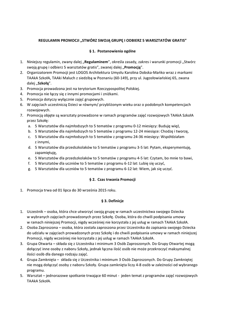 REGULAMIN PROMOCJI „STWÓRZ SWOJĄ GRUPĘ I ODBIERZ 5 WARSZTATÓW GRATIS” 1. 2. 3. 4. 5. 6. 7. 1. 1. 2. 3. 4. 5. § 1. Postanowienia ogólne Niniejszy regulamin, zwany dalej „Regulaminem”, określa zasady, zakres i warunki promocji „Stwórz swoją grupę i odbierz 5 warsztatów gratis”, zwanej dalej „Promocją”. Organizatorem Promocji jest LOGOS Architektura Umysłu Karolina Dobska-‐Mańko wraz z markami TAAkA SzkołA, TAAki Maluch z siedzibą w Poznaniu (60-‐149), przy ul. Jugosłowiańskiej 65, zwana dalej „Szkołą”. Promocja prowadzona jest na terytorium Rzeczypospolitej Polskiej. Promocja nie łączy się z innymi promocjami i zniżkami. Promocja dotyczy wyłącznie zajęć grupowych. W zajęciach uczestniczą Dzieci w równym/ przybliżonym wieku oraz o podobnych kompetencjach rozwojowych. Promocją objęte są warsztaty prowadzone w ramach programów zajęć rozwojowych TAAkA SzkołA przez Szkołę: a. 5 Warsztatów dla najmłodszych to 5 tematów z programu 0-‐12 miesięcy: Buduję więź, b. 5 Warsztatów dla najmłodszych to 5 tematów z programu 12-‐24 miesiące: Chodzę i tworzę, c. 5 Warsztatów dla najmłodszych to 5 tematów z programu 24-‐36 miesięcy: Współdziałam z innymi, d. 5 Warsztatów dla przedszkolaków to 5 tematów z programu 3-‐5 lat: Pytam, eksperymentuję, zapamiętuję, e. 5 Warsztatów dla przedszkolaków to 5 tematów z programu 4-‐5 lat: Czytam, bo mnie to bawi, f. 5 Warsztatów dla uczniów to 5 tematów z programu 6-‐12 lat: Lubię się uczyć, g. 5 Warsztatów dla uczniów to 5 tematów z programu 6-‐12 lat: Wiem, jak się uczyć. § 2. Czas trwania Promocji Promocja trwa od 01 lipca do 30 września 2015 roku. § 3. Definicje Uczestnik – osoba, która chce utworzyć swoją grupę w ramach uczestnictwa swojego Dziecka w wybranych zajęciach prowadzonych przez Szkołę. Osoba, która do chwili podpisania umowy w ramach niniejszej Promocji, nigdy wcześniej nie korzystała z jej usług w ramach TAAkA SzkołA. Osoba Zaproszona – osoba, która została zaproszona przez Uczestnika do zapisania swojego Dziecka do udziału w zajęciach prowadzonych przez Szkołę i do chwili podpisania umowy w ramach niniejszej Promocji, nigdy wcześniej nie korzystała z jej usług w ramach TAAkA SzkołA. Grupa Otwarta – składa się z Uczestnika i minimum 3 Osób Zaproszonych. Do Grupy Otwartej mogą dołączyć inne osoby z naboru Szkoły, jednak łączna ilość osób nie może przekroczyć maksymalnej ilości osób dla danego rodzaju zajęć. Grupa Zamknięta – składa się z Uczestnika i minimum 3 Osób Zaproszonych. Do Grupy Zamkniętej nie mogą dołączyć osoby z naboru Szkoły. Grupa zamknięta liczy 4-‐8 osób w zależności od wybranego programu. Warsztat – jednorazowe spotkanie trwające 60 minut -‐ jeden temat z programów zajęć rozwojowych TAAkA SzkołA. 1. 2. 1. 2. § 4. Osoby korzystające z Promocji Uczestnikiem oraz Osobą Zaproszoną mogą zostać pełnoletnie osoby fizyczne, posiadające pełną zdolność do czynności prawnych oraz zamieszkałe na terytorium Rzeczypospolitej Polskiej. Wzięcie udziału w Promocji jest równoznaczne z zapoznaniem się przez Uczestnika z treścią Regulaminu i jego akceptacją. § 5. Zasady uczestnictwa w Promocji Warunkiem uczestnictwa w Promocji jest: a. Zaproszenie przez Uczestnika minimum 3 Osób Zaproszonych, których Dzieci wezmą udział w wybranych warsztatach. b. W przypadku wybrania przez Uczestnika oraz Osoby Zaproszone programów dla Dzieci w wieku 3-‐12 lat, konieczne jest odbycie bezpłatnej konsultacji z Pedagogiem lub Psychologiem każdego Uczestnika z Dzieckiem, w celu weryfikacji prawidłowego doboru programu warsztatów. c. Potwierdzenie przez Psychologa lub Pedagoga możliwości stworzenia proponowanej przez Uczestnika grupy. d. Zapisanie przez Uczestnika i Osoby Zaproszone swojego Dziecka na warsztaty z danego programu edukacyjnego wskazanego na stronie www.taaakaszkola.pl, w zakładce „Dla dzieci”: i. 0-‐12 miesięcy: Buduję więź, ii. 12-‐24 miesiące: Chodzę i tworzę, iii. 24-‐36 miesięcy: Współdziałam z innymi, iv. 3-‐5 lat: Pytam, eksperymentuję, zapamiętuję, v. 4-‐5 lat: Czytam, bo mnie to bawi, vi. 6-‐12 lat: Lubię się uczyć, vii. 6-‐12 lat: Wiem, jak się uczyć. e. Podpisanie przez Uczestnika oraz Osoby Zaproszone umowy na uczestniczenie Dziecka w wybranych warsztatach prowadzonych przez Szkołę. f. Dokonanie przez Osoby Zaproszone płatności zgodnie z umową -‐ w całości lub ratach. Koszt uczestnictwa w warsztacie dla Dzieci w wieku 0-‐36 miesięcy wynosi 35 zł / 60 minut. Koszt uczestnictwa w warsztacie dla Dzieci w wieku 3-‐12 lat wynosi 45 zł / 60 minut. W przypadku Grupy Otwartej możliwe dwie raty: • Warsztaty dla Dzieci w wieku 0-‐36m.: I rata – 100zł, uregulowana w dniu podpisania umowy. II rata – 75zł, uregulowana w ciągu dwóch tygodni od dnia podpisania umowy. • Warsztaty dla Dzieci w wieku 3-‐12lat: I rata – 150zł, uregulowana w dniu podpisania umowy. II rata – 75zł, uregulowana w ciągu dwóch tygodni od dnia podpisania umowy. W przypadku Grupy Zamkniętej obowiązuje płatność w całości w dniu podpisania umowy. • Warsztaty dla Dzieci w wieku 0-‐36 miesięcy – koszt całkowity dla 5 warsztatów wynosi 175zł. • Warsztaty dla Dzieci w wieku 3-‐12 lat – koszt całkowity dla 5 warsztatów wynosi 225zł. Jeśli warunki opisane powyżej w pkt 1. zostaną spełnione, Uczestnik otrzyma 5 Warsztatów dla swojego Dziecka gratis. 3. W przypadku Grupy Otwartej, Szkoła może skierować do utworzonej grupy kolejnych chętnych, jednak ilość Dzieci nie może przekroczyć maksymalnej ilości osób przewidzianej dla danego programu zajęć. 4. W przypadku Grupy Zamkniętej, Szkoła nie może skierować do utworzonej grupy kolejnych chętnych. § 6. Rezygnacja z umowy 1. W przypadku chęci rezygnacji z umowy, Uczestnik lub Osoba Zaproszona mogą odstąpić