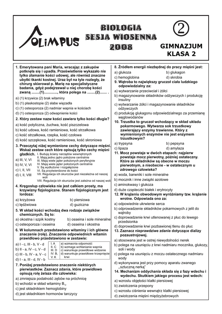 OLIMPUS GIMNAZJUM KLASA 2 8. ród³em energii niezbêdnej do pracy miêœni jest: a) glukoza b) glukagon c) hemoglobina d) skrobia 9. W¹troba to najwiêkszy gruczo³ cia³a ludzkiego odpowiedzialny za: a) wytwarzanie przeciwcia³ i ¿ó³ci b) magazynowanie sk³adników od¿ywczych i produkcjê a) (1) krzywica (2) brak witaminy insuliny b) (1) p³askostopie (2) s³abe wiêzad³a c) wytwarzanie ¿ó³ci i magazynowanie sk³adników c) (1) osteoporoza (2) nadmiar wapnia w koœciach od¿ywczych d) produkcjê glukagonu odpowiedzialnego za przemianê d) (1) osteoporoza (2) odwapnienie koœci wêglowodanów 2. Który zestaw nazw koœci zawiera tylko koœci d³ugie? 10. Trzustka to gruczo³ wchodz¹cy w sk³ad uk³adu a) koœæ potyliczna, ¿uchwa, koœæ piszczelowa pokarmowego. Wytwarza sok trzustkowy b) koœæ udowa, koœæ ramieniowa, koœæ strza³kowa zawieraj¹cy enzymy trawienne. Który z wymienionych enzymów nie jest enzymem c) koœæ strza³kowa, rzepka, koœæ czo³owa trzustkowym? d) koœæ szczêkowa, koœæ ramieniowa, koœæ skroniowa a) trypsyna b) pepsyna 3. Przeczytaj ni¿ej wymienione cechy dotycz¹ce miêœni. c) lipaza d) amylaza Wska¿ zestaw cech które opisuj¹ tylko cechy miêœni 11. Mocz powstaje w dwóch etapach: najpierw I. Buduj¹ œciany narz¹dów wewnêtrznych g³adkich. powstaje mocz pierwotny, póŸniej ostateczny. II. Maj¹ jedno j¹dro po³o¿one centralnie a) III, V, VI III. Maj¹ wiele j¹der po³o¿onych peryferyjnie Które ze sk³adników s¹ obecne w moczu b) IV, V, VI IV. Maj¹ wiele j¹der po³o¿onych centralnie pierwotnym, a nieobecne - w ostatecznym u V. S¹ wyd³u¿one i rozga³êzione zdrowego cz³owieka? c) I, II, VII VI. S¹ przytwierdzone do koœci VII. Regulacja ich skurczów jest niezale¿na od naszej a) woda, barwniki i sole mineralne d) I, II, VIII woli VIII. Regulacja ich skurczów jest zale¿na od naszej woli b) mocznik i inne zwi¹zki azotowe c) aminokwasy i glukoza 4. Krêgos³up cz³owieka nie jest ca³kiem prosty, ma d) du¿e cz¹steczki bia³ek i erytrocyty krzywizny fizjologiczne. Stanem fizjologicznym jest lordoza: 12. W kr¹¿eniu obwodowym wyró¿niamy tzw. kr¹¿enie wrotne. Odpowiada ono za: a) krzy¿owa b) piersiowa a) odpowiednie ukrwienie serca c) lêdŸwiowa d) guziczna b) odprowadzenie sk³adników pokarmowych z jelit do 5. W sk³ad koœci wchodz¹ dwa rodzaje zwi¹zków w¹troby chemicznych. S¹ to: c) doprowadzenie krwi utlenowanej z p³uc do lewego a) okostna i szpik kostny b) osseina i sole mineralne przedsionka c) osteoporoza i osseina d) osseina i okostna d) doprowadzenie krwi pozbawionej tlenu do p³uc 6. W kolumnach przedstawiono witaminy i ich g³ówne 13. Zaznacz nieprawdziwe zdanie dotycz¹ce dializy znaczenie (rolê). Znaczenie odpowiednich witamin pozaustrojowej. prawid³owo przedstawiono w zestawie: a) stosowana jest w ostrej niewydolnoœci nerek I. A a) wzmacnia odpornoœæ a) I - c, III - b, V - d b) polega na usuniêciu z krwi nadmiaru mocznika, glukozy, b) wzmaga wch³anianie wapnia II.. C soli i wody b) II - a, IV - c, V - d III. D c) warunkuje prawid³owe widzenie d) warunkuje prawid³owe krzepniêcie IV. B c) polega na usuniêciu z moczu ostatecznego nadmiaru c) III - b, IV - a, V - c krwi V. K wody d) I - a, III - d, IV - b d) wykonywana jest przy pomocy aparatu zwanego 7. Poni¿ej przedstawiono znaczenie niektórych ,,sztuczn¹ nerk¹” pierwiastków. Zaznacz zdania, które prawid³owo 14. Mechanizm oddychania sk³ada siê z fazy wdechu i opisuj¹ rolê ¿elaza dla cz³owieka: wydechu. Skutkiem jakiego procesu jest wdech: a) zmniejsza podatnoœæ zêbów na próchnicê a) wzrostu objêtoœci klatki piersiowej b) wchodzi w sk³ad witaminy B12 b) zwiotczenia przepony c) jest sk³adnikiem hemoglobiny c) wzrostu ciœnienia wewn¹trz klatki piersiowej d) jest sk³adnikiem hormonów tarczycy d) zwiotczenia miêœni miêdzy¿ebrowych 1. Emerytowana pani Maria, wracaj¹c z zakupów potknê³a siê i upad³a. Przeœwietlenie wykaza³o nie tylko z³amanie koœci udowej, ale równie¿ znaczne ubytki tkanki kostnej. Uraz by³ na tyle rozleg³y, ¿e chirurg skierowa³ p. Mariê na specjalistyczne badania, gdy¿ podejrzewa³ u niej chorobê koœci zwan¹ ........(1)............., która polega na ........(2)....... . 1 15. Wymiana gazowa w pêcherzykach p³ucnych zachodzi na drodze: a) transportu aktywnego b) osmozy c) absorbcji d) dyfuzji prostej 16. Ze wzglêdu na zakres wykonywanych ruchów, miêœnie dziel¹ siê na zginacze, prostowniki, przywodziciele i odwodziciele. Miêsieñ trójg³owy ramienia to: a) przywodziciel b) odwodziciel c) zginacz d) prostownik 17. Zaznacz prawid³ow¹ kolejnoœæ elementów dróg oddechowych: a) krtañ, oskrzela, tchawica, p³uca b) oskrzela, tchawica, krtañ, p³uca c) krtañ, tchawica, oskrzela, p³uca d) krtañ, tchawica, p³uca, oskrzela 18. G³ównymi miêœniami oddechowymi bior¹cymi udzia³ w procesie oddychania s¹: a) przepona i miêsieñ najszerszy grzbietu b) przepona i miêœnie miêdzy¿ebrowe c) miêsieñ czworoboczny i miêsieñ piersiowy wiêkszy d) miêsieñ piersiowy wiêkszy i miêœnie miêdzy¿ebrowe 19. Krtañ zbudowana jest z 9 chrz¹stek. Jedna z nich zamyka wejœcie do krtani w czasie po³ykania pokarmu. Jak nazywa siê ta chrz¹stka? a) g³oœnia c) chrz¹stka tarczowa b) nag³oœnia d) koœæ gnykowa 20. Do dwóch próbek krwi dodano przeciwcia³a. Do próbki nr 1 dodano przeciwcia³a anty A a do próbki nr 2 przeciwcia³a anty B. Po tej czynnoœci wygl¹d próbki 2 zmieni³ siê wyraŸnie (nast¹pi³a aglutynacja). Wygl¹d próbki 1 pozosta³ bez zmian. Na podstawie wygl¹du próbki nr 2 mo¿na wywnioskowaæ, ¿e badana osoba mia³a grupê krwi: a) A b) AB c) O d) B 21. Zaznacz zestaw, w którym znajduj¹ siê wszystkie zdania fa³szywe, odnosz¹ce siê do budowy i funkcji erytrocytów cz³owieka. Dojrza³e erytrocyty cz³owieka: I. Maj¹ jedno j¹dro komórkowe II. Nie maja j¹dra komórkowego a) V, VI III. S¹ kuliste b) II, IV IV. S¹ dwuwkl