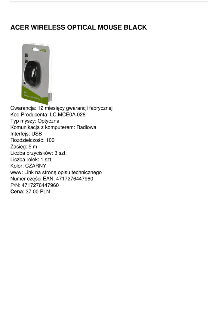 ACER WIRELESS OPTICAL MOUSE BLACK Gwarancja: 12 miesięcy gwarancji fabrycznej Kod Producenta: LC.MCE0A.028 Typ myszy: Optyczna Komunikacja z komputerem: Radiowa Interfejs: USB Rozdzielczość: 100 Zasięg: 5 m Liczba przycisków: 3 szt. Liczba rolek: 1 szt. Kolor: CZARNY www: Link na stronę opisu technicznego Numer części EAN: 4717276447960 P/N: 4717276447960 Cena: 37.00 PLN Powered by TCPDF (www.tcpdf.org)