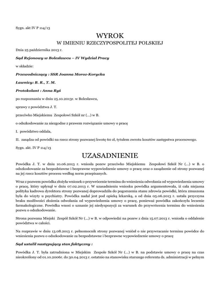 Sygn. akt IV P 114/13 WYROK W IMIENIU RZECZYPOSPOLITEJ POLSKIEJ Dnia 25 października 2013 r. Sąd Rejonowy w Bolesławcu – IV Wydział Pracy w składzie: Przewodniczący : SSR Joanna Moroz-Korycka Ławnicy: B. R., T. M. Protokolant : Anna Ryś po rozpoznaniu w dniu 25.10.2013r. w Bolesławcu, sprawy z powództwa J. T. przeciwko Miejskiemu Zespołowi Szkół nr (...) w B. o odszkodowanie za niezgodne z prawem rozwiązanie umowy o pracę I. powództwo oddala, II. zasądza od powódki na rzecz strony pozwanej kwotę 60 zł, tytułem zwrotu kosztów zastępstwa procesowego. Sygn. akt. IV P 114/13 UZASADNIENIE Powódka J. T. w dniu 10.06.2013 r. wniosła pozew przeciwko Miejskiemu Zespołowi Szkół Nr (...) w B. o odszkodowanie za bezpodstawne i bezprawne wypowiedzenie umowy o pracę oraz o zasądzenie od strony pozwanej na jej rzecz kosztów procesu według norm przepisanych. Wraz z pozwem powódka złożyła wniosek o przywrócenie terminu do wniesienia odwołania od wypowiedzenia umowy o pracę, który upłynął w dniu 07.02.2013 r. W uzasadnieniu wniosku powódka argumentowała, iż cała niejasna polityka kadrowa dyrektora strony pozwanej doprowadziła do pogorszenia stanu zdrowia powódki, która zmuszona była do wizyty u psychiatry. Powódka nadal jest pod opieką lekarską, a od dnia 05.06.2013 r. ustała przyczyna braku możliwości złożenia odwołania od wypowiedzenia umowy o pracę, ponieważ powódka zakończyła leczenie farmakologiczne. Powódka wnosi o uznanie jej niedyspozycji za warunek do przywrócenia terminu do wniesienia pozwu o odszkodowanie. Strona pozwana Miejski Zespół Szkół Nr (...) w B. w odpowiedzi na pozew z dnia 15.07.2013 r. wniosła o oddalenie powództwa w całości. Na rozprawie w dniu 13.08.2013 r. pełnomocnik strony pozwanej wniósł o nie przywracanie terminu powódce do wniesienia pozwu o odszkodowanie za bezpodstawne i bezprawne wypowiedzenie umowy o pracę Sąd ustalił następujący stan faktyczny : Powódka J. T. była zatrudniona w Miejskim Zespole Szkół Nr (...) w B. na podstawie umowy o pracę na czas nieokreślony od 01.10.2006r. do 30.04.2013 r. ostatnio na stanowisku starszego referenta ds. administracji w pełnym wymiarze czasu pracy. Wynagrodzenie powódki brutto za okres 01/2013 do 04/2013 wynosiło przeciętnie 3290,29 zł brutto i 2617,61 zł netto. dowód : kserokopia umowy o pracę k. 5,15, zaświadczenie o zarobkach powódki k. 25, akta osobowe powódki, zeznania powódki k. 88-88v. Dnia 30.01.2013 r. powódka otrzymała pismo o rozwiązaniu umowy o pracę z zachowaniem trzymiesięcznego okresu wypowiedzenia, który upływał w dniu 30.04.2013 r. Powodem wypowiedzenia umowy o pracę były przyczyny ekonomiczne dotyczące zakładu pracy. W piśmie tym powódka została poinformowana, iż w terminie 7 dniu od dnia doręczenia jej tego pisma, przysługuje jej prawo wniesienia odwołania do Sądu Rejonowego w Bolesławcu – Sądu Pracy w B.. dowód: kserokopia wypowiedzenia umowy o prace k. 16, akta osobowe powódki, zeznania dyrektora W. B. k. 88v-89. Do dnia 26.02.2013 r. powódka świadczyła pracę u strony pozwanej. J. T. w okresach od 27.02.2013 r. do 17.03.2013 r. , od 21.03.2013 r. do 07.04.2013 r., od 17.04.2013 r. do 06.05.2015 r. i od 05.06.2013 r. do 02.09.2013 r. przebywała na zwolnieniu lekarskim. dowód: kserokopia wydruku wizyty lekarskiej k. 17, zaświadczenia lekarskie k. 60,61, zeznania powódki k. 88-88v. Sąd zważył co następuje : Stosownie do treści art. 264 § 1 k.p. odwołanie od wypowiedzenia umowy o pracę wnosi się do sądu pracy w ciągu 7 dni od dnia doręczenia pisma wypowiadającego umowę o pracę. Jest to termin zawity, tzn., że istnieje możliwość jego przywrócenia. Sądowe przywrócenie terminu przewiduje art. 265 k.p., który stanowi, że jeżeli pracownik nie dokonał bez swojej winy w terminie czynności takiej jak odwołanie od wypowiedzenia umowy o pracę, sąd pracy na jego wniosek postanowi przywrócić termin. Zgodnie z zasadą prawną zawartą w uchwale Sądu Najwyższego z dnia 14.03.1986r. ( III PZP 8/86 OSNC P 1986/12/194) terminy przewidziane w art. 264 k.p. są terminami prawa materialnego, do których nie mają zastosowania przepisy kodeksu postępowania cywilnego dotyczące uchybienia i przywrócenia terminu, gdyż przywrócenie terminów przewidzianych w art. 264 k.p. następuje w ramach unormowania zawartego w art. 265 k.p, co wskazuje na to, że nie są to terminy ściśle prekluzyjne, lecz do takich podobne. Z mocy powołanego powyżej przepisu przywrócenie terminu następuje na wniosek pracownika złożony w terminie 7 dni od dnia ustania przyczyny uchybienia terminu, jeżeli pracownik nie wniósł pozwu do sądu w terminie bez swej winy. Pracownik obowiązany jest uprawdopodobnić okoliczności uzasadniające przywrócenie terminu. W niniejszej sprawie jest bezsporne, że powódka J. T. otrzymała pismo o rozwiązaniu umowy o pracę za wypowiedzeniem w dniu 30.01.2013r., z prawidłowym pouczeniem o terminie i sposobie wniesienia odwołania, natomiast pozew o odszkodowanie za za bezpodstawne i bezprawne wypowiedzenie umowy o pracę wraz z wnioskiem o przywrócenie terminu do wniesienia odwołania powódka złożyła w Sądzie Rejonowym w Bolesławcu w dniu 10.06.2013 r. W uzasadnieniu wniosku o przywrócenie terminu do wniesienia odwołania J. T. podała, że cała niejasna polityka kadrowa dyrektora strony pozwanej doprowadziła do pogorszenia stanu zdrowia powódki, która zmuszona była do wizyty u psychiatry. Dodatkowo zeznała, że w dacie doręczenia jej wypowiedzenia umowy o pracę nie była ona w stanie ocenić sytuacji, która się zdarzyła. Powódka od dnia otrzymania pisma wypowiadającego jej umowę o pracę tj. od dnia 30.01.2013 r. do dnia 26.02.2013 r. świadczyła pracę u strony pozwanej. Analizując materiał dowodowy zebrany w sprawie, Sad stwierdza, iż powódka nie uprawdopodobniła okoliczności uzasadniających przywrócenie jej terminu
