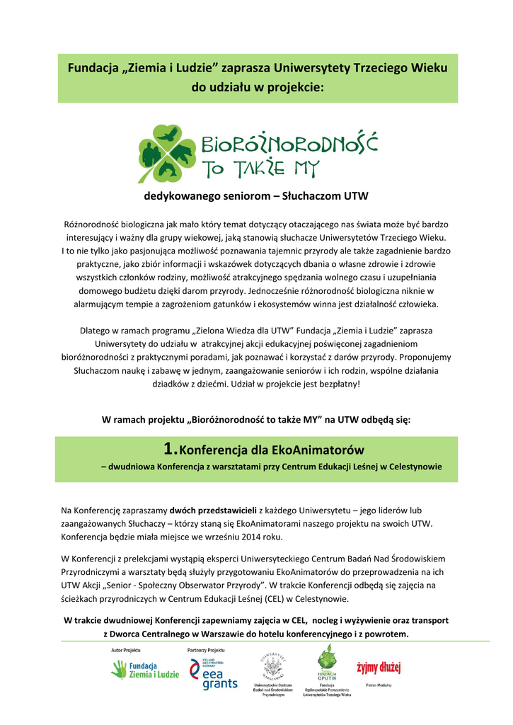 Fundacja „Ziemia i Ludzie” zaprasza Uniwersytety Trzeciego Wieku do udziału w projekcie: dedykowanego seniorom – Słuchaczom UTW Różnorodność biologiczna jak mało który temat dotyczący otaczającego nas świata może być bardzo interesujący i ważny dla grupy wiekowej, jaką stanowią słuchacze Uniwersytetów Trzeciego Wieku. I to nie tylko jako pasjonująca możliwość poznawania tajemnic przyrody ale także zagadnienie bardzo praktyczne, jako zbiór informacji i wskazówek dotyczących dbania o własne zdrowie i zdrowie wszystkich członków rodziny, możliwość atrakcyjnego spędzania wolnego czasu i uzupełniania domowego budżetu dzięki darom przyrody. Jednocześnie różnorodność biologiczna niknie w alarmującym tempie a zagrożeniom gatunków i ekosystemów winna jest działalność człowieka. Dlatego w ramach programu „Zielona Wiedza dla UTW” Fundacja „Ziemia i Ludzie” zaprasza Uniwersytety do udziału w atrakcyjnej akcji edukacyjnej poświęconej zagadnieniom bioróżnorodności z praktycznymi poradami, jak poznawać i korzystać z darów przyrody. Proponujemy Słuchaczom naukę i zabawę w jednym, zaangażowanie seniorów i ich rodzin, wspólne działania dziadków z dziećmi. Udział w projekcie jest bezpłatny! W ramach projektu „Bioróżnorodność to także MY” na UTW odbędą się: 1. Konferencja dla EkoAnimatorów – dwudniowa Konferencja z warsztatami przy Centrum Edukacji Leśnej w Celestynowie Na Konferencję zapraszamy dwóch przedstawicieli z każdego Uniwersytetu – jego liderów lub zaangażowanych Słuchaczy – którzy staną się EkoAnimatorami naszego projektu na swoich UTW. Konferencja będzie miała miejsce we wrześniu 2014 roku. W Konferencji z prelekcjami wystąpią eksperci Uniwersyteckiego Centrum Badań Nad Środowiskiem Przyrodniczymi a warsztaty będą służyły przygotowaniu EkoAnimatorów do przeprowadzenia na ich UTW Akcji „Senior - Społeczny Obserwator Przyrody”. W trakcie Konferencji odbędą się zajęcia na ścieżkach przyrodniczych w Centrum Edukacji Leśnej (CEL) w Celestynowie. W trakcie dwudniowej Konferencji zapewniamy zajęcia w CEL, nocleg i wyżywienie oraz transport z Dworca Centralnego w Warszawie do hotelu konferencyjnego i z powrotem. 2. Akcja „Senior - Społeczny Obserwator Przyrody” - wyjątkowa aktywność dla Słuchaczy na Uniwersytetach Trzeciego Wieku EkoAnimatorzy wraz ze Słuchaczami organizują atrakcyjne przedsięwzięcie na rzecz promowania bioróżnorodności w semestrze letnim lub zimowym 2015r. Należeć do nich mogą np.: festyn rodzinny i jarmark własnych wyrobów, konkurs przydomowych ogródków, wyprawy przyrodnicze do ciekawych miejsc itd. W efekcie Słuchacze zaczną dostrzegać wokół dużo ważnych dla siebie obszarów, na które wpływa zachowanie różnorodności biologicznej. W przedsięwzięciu pomagają materiały edukacyjne i promocyjne oraz propozycje scenariuszy otrzymane od Organizatora. Licząc na kreatywność EkoAnimatorów i Słuchaczy przewidzieliśmy nagrody dla 3 najciekawszych przedsięwzięć – nagrody wartości 2000, 1500 i 1000 zł dla Uniwersytetu! Zachęcamy do wspólnej zabawy z dziećmi! 3. „Wykład o bioróżnorodności” - tradycyjny wykład audytoryjny dla Słuchaczy Równolegle do czasu trwania Akcji przeprowadzamy na Uniwersytetach wykład audytoryjny na jeden z poniższych tematów: Czy jesteśmy bogaci czy biedni? Różnorodność biologiczna Polski na tle świata Czy możemy żyć bez przyrody? Korzyści codzienne i usługi świadczone przez ekosystemy Różnorodność biologiczna na talerzu. Co zawierają gatunki z których przygotowujemy nasze posiłki i od jakich gatunków zależy wyżywienie świata Nasze zdrowie zależy od różnorodności biologicznej. Od malin na poty po bakterie… na trawienie. Po co nam stare chwasty i „niemodne” rośliny w ogródkach. Dawne odmiany dla zachowania tradycji i różnorodności genetycznej Dla wykładu Organizator angażuje wykładowcę i pokrywa jego honorarium. Warunki przystąpienia do projektu przez UTW Od Uniwersytetów wymagamy pełnego zaangażowania we wszystkie działania projektu, koordynacji Akcji na swoich UTW oraz sprawozdawczości z jej przebiegu. Szczegółowe warunki rekrutacji i uczestnictwa znajdą Państwo w Regulaminie projektu. Uwaga – ilość miejsc jest ograniczona a im wcześniejsza rejestracja tym większy wybór terminów realizacji „Wykładu o bioróżnorodności”!