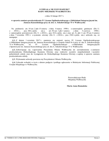 UCHWAŁA NR XXXVII/455/2017 RADY MIEJSKIEJ WAŁBRZYCHA z dnia 16 lutego 2017 r. w sprawie zamiaru przekształcenia IV Liceum Ogólnokształcącego z Oddziałami Integracyjnymi im. Janusza Kusocińskiego przy ul. dra A. Sokołowskiego 75 w Wałbrzychu Na podstawie art. 18 ust. 2 pkt 15 ustawy z dnia 8 marca 1990 r. o samorządzie gminnym (Dz. U. z 2016 r., poz. 446 z późn. zm.), art. 92 ust. 1 pkt 1 ustawy z dnia 5 czerwca 1998 r. o samorządzie powiatowym (Dz. U. z 2016 r., poz. 814 z późn. zm.) oraz art. 5c pkt 1 i art. 59 ust. 6 ustawy z dnia 7 września 1991 r. o systemie oświaty (Dz. U. z 2016 r., poz. 1943 z późn. zm.) uchwala się, co następuje: § 1. Z dniem 1 września 2017 r. zamierza się zmienić nazwę IV Liceum Ogólnokształcącego z Oddziałami Integracyjnymi im. Janusza Kusocińskiego w Zespole Szkół Nr 4 przy ul. dra A. Sokołowskiego 75 w Wałbrzychu, na IV Liceum Ogólnokształcące z Oddziałami Integracyjnymi i Sportowymi im. Janusza Kusocińskiego przy ul. dra A. Sokołowskiego 75 w Wałbrzychu. § 2. Zobowiązuje się i upoważnia Prezydenta Miasta Wałbrzycha do zawiadomienia o zamiarze przekształcenia Dolnośląskiego Kuratora Oświaty oraz rodziców uczniów niepełnoletnich i uczniów pełnoletnich szkoły oraz do wystąpienia do Dolnośląskiego Kuratora Oświaty o opinię w sprawie zamiaru przekształcenia szkoły. § 3. Wykonanie uchwały powierza się Prezydentowi Miasta Wałbrzycha. § 4. Uchwała wchodzi w życie z dniem podjęcia i podlega ogłoszeniu w Biuletynie Informacji Publicznej Urzędu Miejskiego w Wałbrzychu. Przewodnicząca Rady Miejskiej Wałbrzycha Maria Anna Romańska Id: 75088B18-1EC1-47BE-B66D-86B195F65866. Podpisany Strona 1 Uzasadnienie W skład Zespołu Szkół nr 4 w Wałbrzychu wchodzą obecnie: - Gimnazjum Sportowe Nr 11; - IV Liceum Ogólnokształcące z Oddziałami Integracyjnymi im. Janusza Kusocińskiego; - Liceum Sportowe im. Janusza Kusocińskiego. W związku z tym, że w Zespole Szkół nr 4 funkcjonują szkoły tego samego typu, tj. 2 licea, przygotowano uchwałę w sprawie zamiaru likwidacji Liceum Sportowego im. Janusza Kusocińskiego. W celu zachowania specyfiki kształcenia realizowanej w dotychczasowych szkołach wchodzących w skład Zespołu Szkół nr 4, należy oddziały sportowe włączyć do IV Liceum Ogólnokształcącego z Oddziałami Integracyjnymi im. Janusza Kusocińskiego, co wiąże się jednocześnie ze zmianą nazwy szkoły na IV Liceum Ogólnokształcące z Oddziałami Integracyjnymi i Sportowymi im. Janusza Kusocińskiego, przy ul. dra A. Sokołowskiego 75. Od 1 września 2017 r. nie będzie już funkcjonował Zespół Szkół Nr 4 z uwagi na likwidację Liceum Sportowego im. Janusza Kusocińskiego i włączenie Gimnazjum Sportowego Nr 11 do IV Liceum Ogólnokształcącego z Oddziałami Integracyjnymi i Sportowymi im. Janusza Kusocińskiego. Dorobek sportowy Liceum Sportowego będzie kontynuowany bez zakłócania cyklu edukacyjnego i wychowawczego w IV Liceum Ogólnokształcącym z Oddziałami Integracyjnymi i Sportowymi im. Janusza Kusocińskiego. Biorąc powyższe pod uwagę, zasadne jest podjęcie uchwały w sprawie zamiaru przekształcenia z dniem 1 września 2017 r. IV Liceum Ogólnokształcącego z Oddziałami Integracyjnymi im. Janusza Kusocińskiego w Wałbrzychu. Przewodnicząca Rady Miejskiej Wałbrzycha Maria Anna Romańska Id: 75088B18-1EC1-47BE-B66D-86B195F65866. Podpisany Strona 1