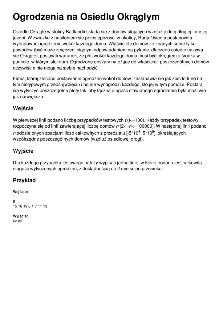 Ogrodzenia na Osiedlu Okrągłym Osiedle Okrągłe w stolicy Bajtlandii składa się z domów stojących wzdłuż jednej długiej, prostej jezdni. W związku z nasileniem się przestępczości w okolicy, Rada Osiedla postanowiła wybudować ogrodzenie wokół każdego domu. Właściciele domów ze znanych sobie tylko powodów (być może zmęczeni ciągłym odpowiadaniem na pytanie, dlaczego osiedle nazywa się Okrągłe), postawili warunek, że płot wokół każdego domu musi być okręgiem o środku w punkcie, w którym stoi dom. Ogrodzone obszary należące do właścicieli poszczególnych domów oczywiście nie mogą na siebie nachodzić. Firma, której zlecono postawienie ogrodzeń wokół domów, zastanawia się jak zbić fortunę na tym nietypowym przedsięwzięciu i hojnie wynagrodzi każdego, kto jej w tym pomoże. Postaraj się wytyczyć poszczególne płoty tak, aby łączna długość stawianego ogrodzenia była możliwie jak największa. Wejście W pierwszej linii podano liczbę przypadków testowych t (t<=100). Każdy przypadek testowy rozpoczyna się od linii zawierającej liczbę domów n (2<=n<=100000). W następnej linii podano n oddzielonych spacjami liczb całkowitych z przedziału [-5*108, 5*108], określających współrzędne poszczególnych domów (wzdłuż osiedlowej drogi). Wyjście Dla każdego przypadku testowego należy wypisać jedną linię, w której podana jest całkowita długość wytyczonych ogrodzeń, z dokładnością do 2 miejsc po przecinku. Przykład Wejście: 1 8 15 16 19 0 1 7 11 13 Wyjście: 62.83