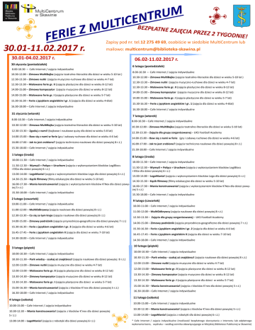 M U R T N E C I T L U M Z E FERI 30.01-11.02.2017 r. BEZPŁATNE ZA JĘCIA PRZEZ 2 TYGODNIE! Zapisy pod nr. tel.12 275 49 69, osobiście w siedzibie MultiCentrum lub mailowo: [email protected] 30.01-04.02.2017 r. 30 stycznia (poniedziałek) 06.02-11.02.2017 r. 6 lutego (poniedziałek) 8.00-10.30 – Cafe Internet / zajęcia indywidualne 10.30-12.00 – Zimowa MultiBajka (zajęcia teatralno-literackie dla dzieci w wieku 5-10 lat ) 12.30-13.30 – Zimowe nutki (zajęcia muzyczno-ruchowe dla dzieci w wieku 4-7 lat) 12.30-13.30 – Malowane ferie gr. II (zajęcia plastyczne dla dzieci w wieku 8-12 lat) 14.00-15.00 – Zimowy kompozytor (zajęcia muzyczne dla dzieci w wieku 8-12 lat) 8.00-10.30 – Cafe Internet / zajęcia indywidualne 10.30-12.00 – Zimowa MultiBajka (zajęcia teatralno-literackie dla dzieci w wieku 5-10 lat ) 12.30-13.30 – Zimowe nutki (zajęcia muzyczno-ruchowe dla dzieci w wieku 4-7 lat) 12.30-13.30 – Malowane ferie gr. II (zajęcia plastyczne dla dzieci w wieku 8-12 lat) 14.00-15.00 – Zimowy kompozytor (zajęcia muzyczne dla dzieci w wieku 8-12 lat) 14.00-15.00 – Malowane ferie gr. I (zajęcia plastyczne dla dzieci w wieku 5-7 lat) 14.00-15.00 – Malowane ferie gr. I (zajęcia plastyczne dla dzieci w wieku 5-7 lat) 15.30-16.30 – Ferie z językiem angielskim I gr. 1 (zajęcia dla dzieci w wieku 4-6lat) 15.30-16.30 – Ferie z językiem angielskim I gr. 1 (zajęcia dla dzieci w wieku 4-6lat) 16.30-18.00 – Cafe Internet / zajęcia indywidualne 16.30-18.00 – Cafe Internet / zajęcia indywidualne 31 stycznia (wtorek) 8.00-10.30 – Cafe Internet / zajęcia indywidualne 10.30-12.00 – Zimowa MultiBajka (zajęcia teatralno-literackie dla dzieci w wieku 5-10 lat) 12.30-13.30 – Zgaduj z nami! (bajkowe i naukowe quizy dla dzieci w wieku 5-8 lat) 14.00-15.00 – Baw się z nami w ferie (gry i zabawy ruchowe dla dzieci w wieku 4-6 lat) 16.00-17.00 – Jak to jest zrobione? (zajęcia techniczno-naukowe dla dzieci powyżej 8 r.ż.) 15.30-18.00 – Cafe Internet / zajęcia indywidualne 1 lutego (środa) 10.00-11.30 – Cafe Internet / zajęcia indywidualne 11.30-12.30 – Wymyśl + Połącz = Uruchom (zajęcia z wykorzystaniem klocków LogiBlocs i ElGo dla dzieci powyżej 6 r.ż.) 13.00-14.00 – LegoMania! (zajęcia z wykorzystaniem klocków Lego dla dzieci powyżej 6 r.ż.) 7 lutego (wtorek) 8.00-10.30 – Cafe Internet / zajęcia indywidualne 10.30-12.00 – Zimowa MultiBajka (zajęcia teatralno-literackie dla dzieci w wieku 5-10 lat) 12.30-13.30 – Zajęcia dla grupy zorganizowanej – UKS Football Academy 14.00-15.00 – Baw się z nami w ferie (gry i zabawy ruchowe dla dzieci w wieku 4-6 lat) 16.00-17.00 – Jak to jest zrobione? (zajęcia techniczno-naukowe dla dzieci powyżej 8 r.ż.) 15.30-18.00 – Cafe Internet / zajęcia indywidualne 8 lutego (środa) 10.00-11.30 – Cafe Internet / zajęcia indywidualne 11.30-12.30 – Wymyśl + Połącz = Uruchom (zajęcia z wykorzystaniem klocków LogiBlocs i ElGo dla dzieci powyżej 6 r.ż.) 13.00-14.00 – LegoMania! (zajęcia z wykorzystaniem klocków Lego dla dzieci powyżej 6 r.ż.) 14.30-15.30 – Kącik filmowy (filmy edukacyjne dla dzieci w wieku 5-10 lat) 14.30-15.30 – Kącik filmowy (filmy edukacyjne dla dzieci w wieku 5-10 lat) 16.00-17.30 – Mania konstruowania! (zajęcia z wykorzystaniem klocków K’Nex dla dzieci powy16.00-17.30 – Mania konstruowania! (zajęcia z wykorzystaniem klocków K’Nex dla dzieci powyżej 5 r.ż.) żej 5 r.ż.) 15.30-18.00 – Cafe Internet / zajęcia indywidualne 15.30-18.00 – Cafe Internet / zajęcia indywidualne 2 lutego (czwartek) 10.00-11.00 – Cafe Internet / zajęcia indywidualne 11.00-12.00 – MultiOdkrywcy (zajęcia naukowe dla dzieci powyżej 8 r.ż.) 12.30-13.30 – Co się za tym kryje (zajęcia naukowe dla dzieci powyżej 8 r.ż.) 14.00-15.00 – Zimowy podróżnik (zajęcia przyrodniczo-geograficzne dla dzieci powyżej 7 r.ż.) 15.30-16.30 – Ferie z językiem angielskim I gr. 2 (zajęcia dla dzieci w wieku 4-6 lat) 16.45-17.45 – Ferie z językiem angielskim II (zajęcia dla dzieci w wieku 7-10 lat) 14.30-18.00 – Cafe Internet / zajęcia indywidualne 3 lutego (piątek) 10.00-10.30 – Cafe Internet / zajęcia indywidualne 10.30-11.30 – Park wiedzy - szukaj aż znajdziesz! (zajęcia naukowe dla dzieci powyżej 8 r.ż.) 12.00-13.00 – Zimowe nutki (zajęcia muzyczne dla dzieci w wieku 4-7 lat) 12.00-13.00 – Malowane ferie gr. II (zajęcia plastyczne dla dzieci w wieku 8-12 lat) 13.30-14.30 – Zimowy kompozytor (zajęcia muzyczne dla dzieci w wieku 8-12 lat) 13.30-14.30 – Malowane ferie gr. I (zajęcia plastyczne dla dzieci w wieku 5-7 lat) 15.00-16.30 – Mania konstruowania! (zajęcia z klocków K’nex dla dzieci powyżej 5 r.ż.) 16.30-18.00 – Cafe Internet / zajęcia indywidualne 4 lutego (sobota) 10.00-15.00 – Cafe Internet / zajęcia indywidualne 10.30-12.30 – Mania konstruowania! (zajęcia z klocków K’nex dla dzieci powyżej 5 r.ż.) 13.00-14.00 – LegoMania! (zajęcia z robotyki dla dzieci powyżej 6 r.ż.) 9 lutego (czwartek) 10.00-11.00 – Cafe Internet / zajęcia indywidualne 11.00-12.00 – MultiOdkrywcy (zajęcia naukowe dla dzieci powyżej 8 r.ż.) 12.30-13.30 – Zajęcia dla grupy zorganizowanej – UKS Football Academy 14.00-15.00 – Zimowy podróżnik (zajęcia przyrodniczo-geograficzne dla dzieci powyżej 7 r.ż.) 15.30-16.30 – Ferie z językiem angielskim I gr. 2 (zajęcia dla dzieci w wieku 4-6 lat) 16.45-17.45 – Ferie z językiem angielskim II (zajęcia dla dzieci w wieku 7-10 lat) 14.30-18.00 – Cafe Internet / zajęcia indywidualne 10 lutego (piątek) 10.00-10.30 – Cafe Internet / zajęcia indywidualne 10.30-11.30 – Park wiedzy - szukaj aż znajdziesz! (zajęcia naukowe dla dzieci powyżej 8 r.ż.) 12.00-13.00 – Zimowe nutki (zajęcia muzyczne dla dzieci w wieku 4-7 lat) 12.00-13.00 – Malowane ferie gr. II (zajęcia plastyczne dla dzieci w wieku 8-12 lat) 13.30-14.30 – Zimowy kompozytor (zajęci