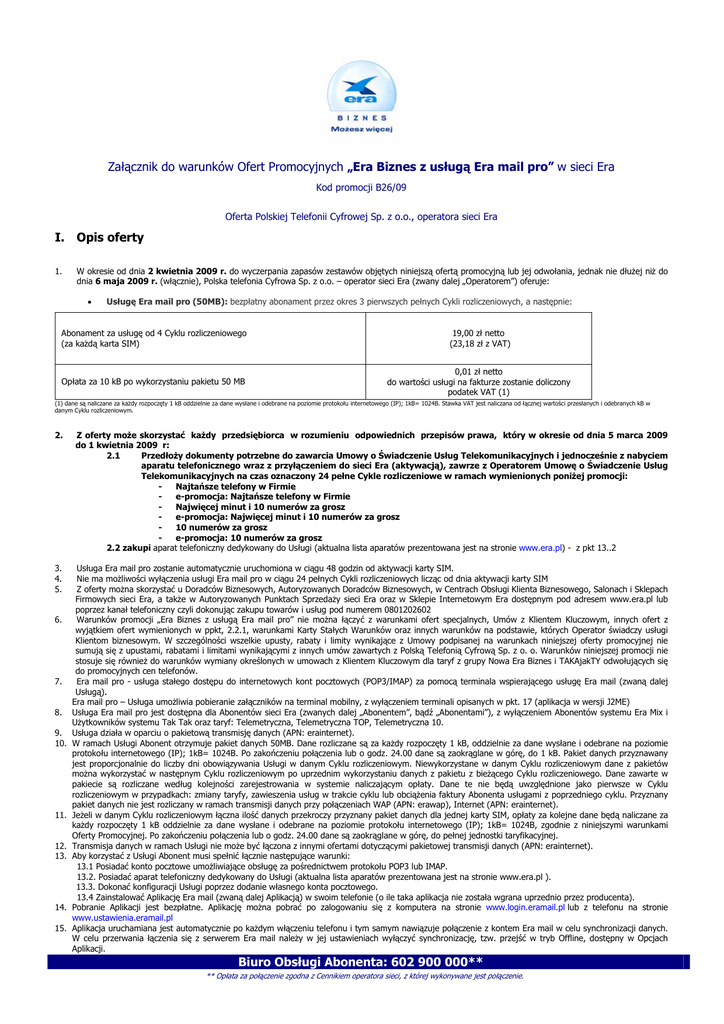 Załącznik do warunków Ofert Promocyjnych „Era Biznes z usługą Era mail pro” w sieci Era Kod promocji B26/09 Oferta Polskiej Telefonii Cyfrowej Sp. z o.o., operatora sieci Era I. Opis oferty 1. W okresie od dnia 2 kwietnia 2009 r. do wyczerpania zapasów zestawów objętych niniejszą ofertą promocyjną lub jej odwołania, jednak nie dłużej niż do dnia 6 maja 2009 r. (włącznie), Polska telefonia Cyfrowa Sp. z o.o. – operator sieci Era (zwany dalej „Operatorem”) oferuje: • Usługę Era mail pro (50MB): bezpłatny abonament przez okres 3 pierwszych pełnych Cykli rozliczeniowych, a następnie: Abonament za usługę od 4 Cyklu rozliczeniowego (za każdą karta SIM) 19,00 zł netto (23,18 zł z VAT) Opłata za 10 kB po wykorzystaniu pakietu 50 MB 0,01 zł netto do wartości usługi na fakturze zostanie doliczony podatek VAT (1) (1) dane są naliczane za każdy rozpoczęty 1 kB oddzielnie za dane wysłane i odebrane na poziomie protokołu internetowego (IP); 1kB= 1024B. Stawka VAT jest naliczana od łącznej wartości przesłanych i odebranych kB w danym Cyklu rozliczeniowym. 2. Z oferty może skorzystać każdy przedsiębiorca w rozumieniu odpowiednich przepisów prawa, który w okresie od dnia 5 marca 2009 do 1 kwietnia 2009 r: 2.1 Przedłoży dokumenty potrzebne do zawarcia Umowy o Świadczenie Usług Telekomunikacyjnych i jednocześnie z nabyciem aparatu telefonicznego wraz z przyłączeniem do sieci Era (aktywacją), zawrze z Operatorem Umowę o Świadczenie Usług Telekomunikacyjnych na czas oznaczony 24 pełne Cykle rozliczeniowe w ramach wymienionych poniżej promocji: Najtańsze telefony w Firmie e-promocja: Najtańsze telefony w Firmie Najwięcej minut i 10 numerów za grosz e-promocja: Najwięcej minut i 10 numerów za grosz 10 numerów za grosz e-promocja: 10 numerów za grosz 2.2 zakupi aparat telefoniczny dedykowany do Usługi (aktualna lista aparatów prezentowana jest na stronie www.era.pl) - z pkt 13..2 3. 4. 5. Usługa Era mail pro zostanie automatycznie uruchomiona w ciągu 48 godzin od aktywacji karty SIM. Nie ma możliwości wyłączenia usługi Era mail pro w ciągu 24 pełnych Cykli rozliczeniowych licząc od dnia aktywacji karty SIM Z oferty można skorzystać u Doradców Biznesowych, Autoryzowanych Doradców Biznesowych, w Centrach Obsługi Klienta Biznesowego, Salonach i Sklepach Firmowych sieci Era, a także w Autoryzowanych Punktach Sprzedaży sieci Era oraz w Sklepie Internetowym Era dostępnym pod adresem www.era.pl lub poprzez kanał telefoniczny czyli dokonując zakupu towarów i usług pod numerem 0801202602 Warunków promocji „Era Biznes z usługą Era mail pro” nie można łączyć z warunkami ofert specjalnych, Umów z Klientem Kluczowym, innych ofert z wyjątkiem ofert wymienionych w ppkt, 2.2.1, warunkami Karty Stałych Warunków oraz innych warunków na podstawie, których Operator świadczy usługi Klientom biznesowym. W szczególności wszelkie upusty, rabaty i limity wynikające z Umowy podpisanej na warunkach niniejszej oferty promocyjnej nie sumują się z upustami, rabatami i limitami wynikającymi z innych umów zawartych z Polską Telefonią Cyfrową Sp. z o. o. Warunków niniejszej promocji nie stosuje się również do warunków wymiany określonych w umowach z Klientem Kluczowym dla taryf z grupy Nowa Era Biznes i TAKAjakTY odwołujących się do promocyjnych cen telefonów. Era mail pro - usługa stałego dostępu do internetowych kont pocztowych (POP3/IMAP) za pomocą terminala wspierającego usługę Era mail (zwaną dalej Usługą). Era mail pro – Usługa umożliwia pobieranie załączników na terminal mobilny, z wyłączeniem terminali opisanych w pkt. 17 (aplikacja w wersji J2ME) Usługa Era mail pro jest dostępna dla Abonentów sieci Era (zwanych dalej „Abonentem”, bądź „Abonentami”), z wyłączeniem Abonentów systemu Era Mix i Użytkowników systemu Tak Tak oraz taryf: Telemetryczna, Telemetryczna TOP, Telemetryczna 10. Usługa działa w oparciu o pakietową transmisję danych (APN: erainternet). W ramach Usługi Abonent otrzymuje pakiet danych 50MB. Dane rozliczane są za każdy rozpoczęty 1 kB, oddzielnie za dane wysłane i odebrane na poziomie protokołu internetowego (IP); 1kB= 1024B. Po zakończeniu połączenia lub o godz. 24.00 dane są zaokrąglane w górę, do 1 kB. Pakiet danych przyznawany jest proporcjonalnie do liczby dni obowiązywania Usługi w danym Cyklu rozliczeniowym. Niewykorzystane w danym Cyklu rozliczeniowym dane z pakietów można wykorzystać w następnym Cyklu rozliczeniowym po uprzednim wykorzystaniu danych z pakietu z bieżącego Cyklu rozliczeniowego. Dane zawarte w pakiecie są rozliczane według kolejności zarejestrowania w systemie naliczającym opłaty. Dane te nie będą uwzględnione jako pierwsze w Cyklu rozliczeniowym w przypadkach: zmiany taryfy, zawieszenia usług w trakcie cyklu lub obciążenia faktury Abonenta usługami z poprzedniego cyklu. Przyznany pakiet danych nie jest rozliczany w ramach transmisji danych przy połączeniach WAP (APN: erawap), Internet (APN: erainternet). Jeżeli w danym Cyklu rozliczeniowym łączna ilość danych przekroczy przyznany pakiet danych dla jednej karty SIM, opłaty za kolejne dane będą naliczane za każdy rozpoczęty 1 kB oddzielnie za dane wysłane i odebrane na poziomie protokołu internetowego (IP); 1kB= 1024B, zgodnie z niniejszymi warunkami Oferty Promocyjnej. Po zakończeniu połączenia lub o godz. 24.00 dane są zaokrąglane w górę, do pełnej jednostki taryfikacyjnej. Transmisja danych w ramach Usługi nie może być łączona z innymi ofertami dotyczącymi pakietowej transmisji danych (APN: erainternet). Aby korzystać z Usługi Abonent musi spełnić łącznie następujące warunki: 13.1 Posiadać konto pocztowe umożliwiające obsługę za pośrednictwem protokołu POP3 lub IMAP. 13.2. Posiadać aparat telefoniczny dedykowany do Usługi (aktualna lista aparatów prezentowana jest na stronie www.era.p
