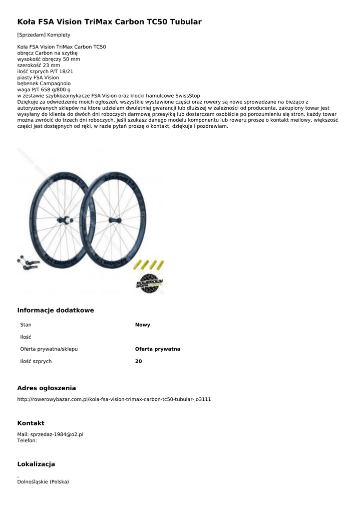 Koła FSA Vision TriMax Carbon TC50 Tubular [Sprzedam] Komplety Koła FSA Vision TriMax Carbon TC50 obręcz Carbon na szytkę wysokość obręczy 50 mm szerokość 23 mm ilość szprych P/T 18/21 piasty FSA Vision bębenek Campagnolo waga P/T 658 g/800 g w zestawie szybkozamykacze FSA Vision oraz klocki hamulcowe SwissStop Dziękuje za odwiedzenie moich ogłoszeń, wszystkie wystawione części oraz rowery są nowe sprowadzane na bieżąco z autoryzowanych sklepów na ktore udzielam dwuletniej gwarancji lub dłuższej w zależności od producenta, zakupiony towar jest wysyłany do klienta do dwóch dni roboczych darmową przesyłką lub dostarczam osobiście po porozumieniu się stron, każdy towar można zwrócić do trzech dni roboczych, jeśli szukasz danego modelu komponentu lub roweru prosze o kontakt meilowy, większość części jest dostępnych od ręki, w razie pytań proszę o kontakt, dziękuje i pozdrawiam. Informacje dodatkowe Stan Nowy Ilość Oferta prywatna/sklepu Oferta prywatna Ilość szprych 20 Adres ogłoszenia http://rowerowybazar.com.pl/kola-fsa-vision-trimax-carbon-tc50-tubular-,o3111 Kontakt Mail: [email protected] Telefon: Lokalizacja , Dolnośląskie (Polska) Ogłoszenie dodano: 2015-12-08 17:12:52 Ogłoszenie wygasa: 2017-03-07 17:12:52 Powered by TCPDF (www.tcpdf.org)
