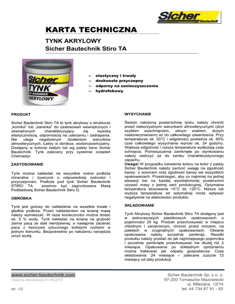 KARTA TECHNICZNA TYNK AKRYLOWY Sicher Bautechnik Stiro TA • • • • elastyczny i trwały doskonale przyczepny odporny na zanieczyszczenia hydrofobowy PRODUKT WYSYCHANIE Sicher Bautechnik Stiro TA to tynk akrylowy o strukturze „kornika” lub „baranka” do zastosowań wewnętrznych i zewnętrznych charakteryzujący się wysoką elastycznością, odpornością na uderzeniu i zadrapania. Nie ulega negatywnym działaniom warunków atmosferycznych. Łatwy w obróbce, wodorozcieńczalny. Dostępny w kolorze białym lub wg palety barw Sicher Bautechnik. Tynk zalecany przy systemie ociepleń Chemastyr. Świeżo nałożoną powierzchnię tynku należy chronić przed niekorzystnymi warunkami atmosferycznymi (zbyt szybkim wyschnięciem, silnym wiatrem, dużym nasłonecznieniem) aż do całkowitego utwardzenia. Przy temperaturze ok. 20°C i wilgotności powietrza ok. 65% czas całkowitego wysychania wynosi ok. 24 godziny. Większa wilgotność i niższa temperatura wydłużają czas schnięcia. Pomieszczenia zamknięte po otynkowaniu należy wietrzyć aż do zaniku charakterystycznego zapachu. Uwaga! W przypadku barwienia koloru na kolor z palety Sicher Bautechnik należy zwrócić uwagę na zgodność barwy z wzorcem oraz zgodność barwy we wszystkich opakowaniach. Przestrzegać, aby co najmniej na jednej elewacji lub na każdej wyodrębnionej powierzchni używać masy z jednej serii produkcyjnej. Optymalna temperatura stosowania +5°C do +25°C. Niższa lub wyższa temperatura od optymalnej może wpływać negatywnie na właściwości produktu. ZASTOSOWANIE Tynk można nakładać na wszystkie nośne podłoża mineralne i żywiczne o odpowiedniej nośności i przyczepności. Podłoże pod tynk Sicher Bautechnik STIRO TA powinno być zagruntowane Masą Podkładową Sicher Bautechnik Stiro G. OBRÓBKA Tynk jest gotowy do nakładania na wszelkie trwałe i gładkie podłoża. Przed nakładaniem na ścianę masę należy wymieszać. W razie konieczności można dodać ok. 5 % wody. Tynk nakładać na ścianę na grubość ziarna pacą ze stali nierdzewnej, a następnie zacierać pacą z tworzywa sztucznego kolistymi ruchami w jednym kierunku. Bezpośrednio po nałożeniu narzędzia umyć wodą. www.sicher-bautechnik.com Ostatnia aktualizacja 01.06.2012 str. 1/2 SKŁADOWANIE Tynk Akrylowy Sicher Bautechnik Stiro TA dostępny jest w jednorazowych plastikowych opakowaniach o pojemności 25 kg. Produkt przechowywać w miejscu chłodnym i zacienionym, chronić przed mrozem, na paletach w oryginalnych opakowaniach. Otwarte opakowania należy szczelnie zamknąć. Resztki produktu należy przelać do jak najmniejszego pojemnika i szczelnie zamknięte przechowywać nie dłużej niż 3 miesiące. Opakowanie po dokładnym opróżnieniu można traktować jak odpady gospodarcze. Czas składowania: 24 miesiące – zalecane zużycie 12 miesięcy od daty produkcji. Sicher Bautechnik Sp. z o. o. 97-200 Tomaszów Mazowiecki ul. Milenijna 12/14 tel: 44 734 67 91 - 93 KARTA TECHNICZNA TYNK AKRYLOWY Sicher Bautechnik Stiro TA DANE TECHNICZNE I WYKONAWCZE Temp. użytkowania: temp. podłoża i powietrza w granicach +5oC ÷ +25oC dotyczy także wysychania Uziarnienie: ziarno 1,5 mm, 2,0 mm, 3,0 mm Zużycie 2,5 – 2,8 kg/m2 dla grubości ziarna 1,5 mm 2,7 – 3,1 kg/m2 dla grubości ziarna 2,0 mm 3,5 – 3,9 kg/m2 dla grubości ziarna 3,0 mm Czas całkowitego wysychania: po 24 godz. przy temp. 20o C i wilgotności powietrza ok. 65%. Między zabiegami co najmniej 12 godz. Przy chłodnej i wilgotnej pogodzie zachować dłuższy czas między zabiegami Kolorystyka: biały oraz dowolnie dobrany z PALETY BARW Sicher Bautechnik Baza: wodna dyspersja akrylowo – styrenowa Gęstość: ok. 1,9 kg/litr Rozcieńczanie: w razie konieczności rozcieńczyć z wodą ok. 5% Składowanie: 24 m-ce w miejscach chłodnych, powyżej +5°C, wyłącznie w szczelnych opakowaniach, chronić przed nasłonecznieniem i przemarznięciem Zalecane zużycie: w ciągu 12 m-cy od daty produkcji ŚRODKI OSTROŻNOŚCI Należy unikać kontaktu ze skórą oraz chronić oczy. W przypadku kontaktu z oczami przemyć je obficie czystą wodą i zasięgnąć porady lekarza. W przypadku kontaktu ze skórą zmyć ją wodą. Zaleca się używanie rękawic i odzieży ochronnej. OPAKOWANIA Jednostkowe: worki papierowe 25 kg Zbiorcze: paleta 24 szt x 25 kg = 6600 kg WYRÓB ZGODNY Z Aprobata techniczna ITB: AT-15-8017/2009 Sicher Bautechnik Sp. z o. o. odpowiada za właściwą jakość wyrobu. Nie mamy wpływu na stosowanie nie zgodne z jego przeznaczeniem oraz zaleceniami z karty technicznej. Przedstawione w karcie informacje podano w dobrej wierze zgodnie z najnowszym stanem wiedzy. Nie mogą one zastąpić rzeczowego przygotowania uczestników procesu budowlanego oraz przestrzegania przepisów BHP i zasad sztuki budowlanej. W przypadku wątpliwości należy skontaktować się z Doradcą Technicznym Sicher Bautechnik Sp z o. o. lub przeprowadzić odpowiednie próby. www.sicher-bautechnik.com Ostatnia aktualizacja 01.06.2012 str. 2/2 Sicher Bautechnik Sp. z o. o. 97-200 Tomaszów Mazowiecki ul. Milenijna 12/14 tel: 44 734 67 91 - 93