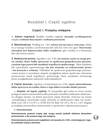 Rozdział I. Część ogólna Część I. Przepisy wstępne 1. Zakres regulacji. Kodeks cywilny reguluje stosunki cywilnoprawne między osobami fizycznymi i osobami prawnymi. 2. Nieretroakcja. Według art. 3 KC ustawa nie ma mocy wstecznej, chyba że co innego wynika z jej brzmienia lub celu (lex retro non agit). Stosowanie retroakcji jest dopuszczalne tylko wyjątkowo, gdy wynika to z brzmienia lub celu nowej ustawy. 3. Nadużycie prawa. Zgodnie z art. 5 KC nie można czynić ze swego pra- wa użytku, który byłby sprzeczny ze społeczno-gospodarczym przezna czeniem tego prawa lub zasadami współżycia społecznego. Takie działanie lub zaniechanie uprawnionego nie jest uważane za wykonywanie prawa i nie korzysta z ochrony. Odesłanie do społeczno-gospodarczego przeznaczenia prawa w wyraźnym stopniu uwzględnia interes społeczny, natomiast przytoczenie zasad współżycia społecznego słu ży uzyskaniu równowagi przez uwzględnienie interesów indywidualnych. 4. Ciężar dowodu. Zgodnie z brzmieniem art. 6 KC ciężar udowodnienia faktu spoczywa na osobie, która z tego faktu wywodzi skutki prawne. a. Wyjątek od reguły ogólnej. W przypadku gdy jedna ze stron swoim postępowaniem uniemożliwia albo poważnie utrudnia wskazanie okoliczności drugiej stronie, na której spoczywa ciężar dowodu, wówczas na stronę „utrudniającą” przechodzi ciężar dowodu, że okoliczności takie nie zachodziły (wyr. SN z 3.3.1971 r., II PR 453/70, Biul. SN 1971, Nr 9, s. 147). Reguła ta znajduje powszechne zastosowanie w sprawach z zakresu prawa pracy. b. Domniemania Domniemania prawne wiążą sąd, mogą zostać jednak obalone dowodem przeciwnym, o ile ustawa tego nie wyłącza. Domniemanie prawne jest wyjątkiem od zasady art. 6 KC, zmieniającym regu łę rozkładu ciężaru dowodu. 2 Rozdział I. Część ogólna DOMNIEMANIA faktyczne (praesumptio facti) to uznanie pewnego faktu za udowodniony na podstawie innych ustalonych faktów, pozostających w tym związku prawne (praesumptio iuris) występuje wówczas, gdy przepisy prawne nakazują w określonych okolicznościach uznać pewne fakty za prawnie ustalone FORMALNE Nakazują przyjąć, że określony fakt zachodzi lub zaszedł, dopóki nie zostanie wykazane, że tak nie było, np. tak długo jak nie zostanie wykazane, że nastąpiło urodzenie martwe, przyjmuje się, że dziecko urodziło się żywe (art. 9 KC). MATERIALNE Na podstawie udowodnienia innego prawnie relewantnego faktu lub stanu faktycznego nakazuje przyjąć dany fakt za uznany, np. jeśli dziecko urodziło się w trakcie małżeństwa lub do 300. dnia po jego ustaniu lub unieważnieniu, domniemywa się, że pochodzi ono od męża matki (art. 62 § 1 KRO). WZRUSZALNE (praesumptio iuris tantum) Mogą być obalone, jeżeli zostanie wykazane w przewidziany prawem sposób, że pomimo tego, iż miał miejsce inny fakt, to jednak poszukiwany fakt nie wystąpił. NIEWZRUSZALNE (praesumptio iuris ac de iure) Wykluczony jest przeciwdowód. Ustalenie poszukiwanego faktu w drodze domniemania prawnego jest niepodważalne. Domniemania takie stanowią w polskim prawie wyjątki; są to najczęściej tzw. fikcje prawne. Przykład stanowi rękojmia wiary publicznej ksiąg wieczystych. 5. Dobra i zła wiara. W ustawodawstwie brak jest ogólnej definicji dobrej lub złej wiary. Przyjmuje się, że w złej wierze jest podmiot, który wie, że dane prawo lub stosunek prawny nie istnieje, lub też wprawdzie nie wie, ale należy przyjąć, że wiedziałby, gdyby się zachował należycie, tzn. gdyby w danej sytuacji postępował rozsądnie i zgodnie z zasadami współżycia społecznego. Dobra wiara jest określonym stanem psychicznym, który polega na istnieniu u danego podmiotu pewnej świadomości. Dla oceny istnienia dobrej lub złej wiary miarodajny jest moment wskazany w przepisie ustanawiającym ochronę dobrej wiary. W razie wątpliwości należy przyjąć, że jest to moment podjęcia zachowania, którego skutki zależą od istnienia omawianego stanu psychicznego. Późniejsza utrata dobrej wiary nie uchyla, co do zasady, skutków zdarzenia prawnego – malafides superveniens non nocet. Wyjątkowo tylko skutki prawne zależne są od istnienia dobrej wiary przez pewien czas (np. art. 174 KC). Część II. Osoby fizyczne 3 Istnienie dobrej wiary objęte jest domniemaniem z art. 7 KC. Zgodnie z tym przepisem, jeżeli ustawa uzależnia skutki prawne od dobrej lub złej wiary, domniemywa się istnienie dobrej wiary. Domniemanie to można obalić, wykazując że dany podmiot wiedział o okolicznościach wskazanych w poszczególnych przepisach prawa. Ciężar dowodu, zgodnie z regułą wyrażoną w art. 6 KC, spoczywa na stronie kwestionującej istnienie dobrej wiary. Część II. Osoby fizyczne 1. Pojęcie osoby fizycznej. Osoba fizyczna jest to prawne określenie każ- dego człowieka, który występuje jako podmiot w stosunku cywilnoprawnym. O kwalifikacji człowieka do podmiotów praw i obowiązków z zakresu prawa cywilnego decyduje przypisana mu zdolność prawna. 2. Zdolność prawna. Jest to zdolność do bycia podmiotem praw i obo- wiązków. Stanowi ona podstawową cechę normatywną podmiotów prawa cywilnego. a. Podmioty posiadające zdolność prawną. Są to: • osoby fizyczne, • osoby prawne, • jednostki organizacyjne niebędące osobami prawnymi, którym ustawa przyznaje zdolność prawną. Każda żyjąca osoba fizyczna posiada bezwarunkową zdolność prawną. Od chwili urodzenia może być podmiotem praw i obowiązków wynikających ze stosunków cywilnoprawnych. Początkiem zdolności prawnej człowieka jest zatem chwila urodzenia, czyli moment oddzielenia od ciała matki. Warunkiem nabycia zdolności prawnej jest, by dziecko urodziło się żywe. Nie ma przy tym znaczenia czy organizm dziecka jest zdolny spełniać samodzielnie funkcje życiowe. b. Nasciturus. Jest to dziecko poczęte, ale nie urodzone. Posiada ono warunkową zdolność prawną, tzn. przysług