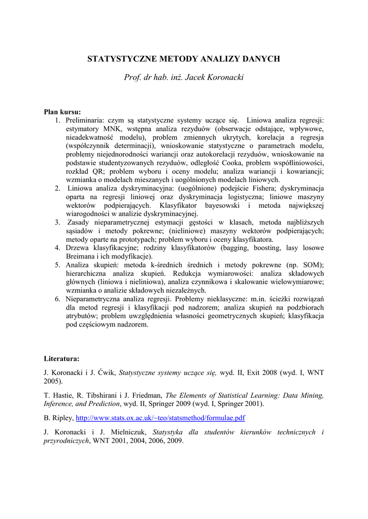 STATYSTYCZNE METODY ANALIZY DANYCH Prof. dr hab. inż. Jacek Koronacki Plan kursu: 1. Preliminaria: czym są statystyczne systemy uczące się. Liniowa analiza regresji: estymatory MNK, wstępna analiza rezyduów (obserwacje odstające, wpływowe, nieadekwatność modelu), problem zmiennych ukrytych, korelacja a regresja (współczynnik determinacji), wnioskowanie statystyczne o parametrach modelu, problemy niejednorodności wariancji oraz autokorelacji rezyduów, wnioskowanie na podstawie studentyzowanych rezyduów, odległość Cooka, problem współliniowości, rozkład QR; problem wyboru i oceny modelu; analiza wariancji i kowariancji; wzmianka o modelach mieszanych i uogólnionych modelach liniowych. 2. Liniowa analiza dyskryminacyjna: (uogólnione) podejście Fishera; dyskryminacja oparta na regresji liniowej oraz dyskryminacja logistyczna; liniowe maszyny wektorów podpierających. Klasyfikator bayesowski i metoda największej wiarogodności w analizie dyskryminacyjnej. 3. Zasady nieparametrycznej estymacji gęstości w klasach, metoda najbliższych sąsiadów i metody pokrewne; (nieliniowe) maszyny wektorów podpierających; metody oparte na prototypach; problem wyboru i oceny klasyfikatora. 4. Drzewa klasyfikacyjne; rodziny klasyfikatorów (bagging, boosting, lasy losowe Breimana i ich modyfikacje). 5. Analiza skupień: metoda k-średnich średnich i metody pokrewne (np. SOM); hierarchiczna analiza skupień. Redukcja wymiarowości: analiza składowych głównych (liniowa i nieliniowa), analiza czynnikowa i skalowanie wielowymiarowe; wzmianka o analizie składowych niezależnych. 6. Nieparametryczna analiza regresji. Problemy nieklasyczne: m.in. ścieżki rozwiązań dla metod regresji i klasyfikacji pod nadzorem; analiza skupień na podzbiorach atrybutów; problem uwzględnienia własności geometrycznych skupień; klasyfikacja pod częściowym nadzorem. Literatura: J. Koronacki i J. Ćwik, Statystyczne systemy uczące się, wyd. II, Exit 2008 (wyd. I, WNT 2005). T. Hastie, R. Tibshirani i J. Friedman, The Elements of Statistical Learning: Data Mining, Inference, and Prediction, wyd. II, Springer 2009 (wyd. I, Springer 2001). B. Ripley, http://www.stats.ox.ac.uk/~teo/statsmethod/formulae.pdf J. Koronacki i J. Mielniczuk, Statystyka dla studentów kierunków technicznych i przyrodniczych, WNT 2001, 2004, 2006, 2009.