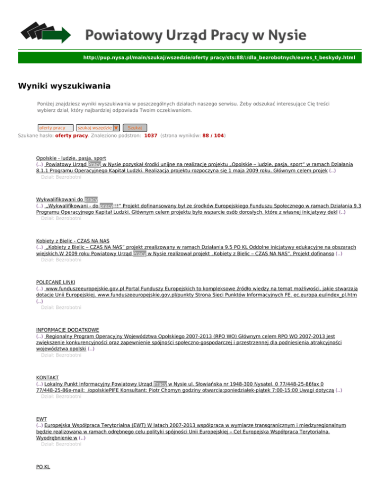http://pup.nysa.pl/main/szukaj/wszedzie/oferty pracy/sts:88/:/dla_bezrobotnych/eures_t_beskydy.html Wyniki wyszukiwania Poniżej znajdziesz wyniki wyszukiwania w poszczególnych działach naszego serwisu. Żeby odszukać interesujące Cię treści wybierz dział, który najbardziej odpowiada Twoim oczekiwaniom. oferty pracy szukaj wszędzie ▼ Szukaj Szukane hasło: oferty pracy. Znaleziono podstron: 1037 (strona wyników: 88 / 104) 871 Opolskie - ludzie, pasja, sport (..) Powiatowy Urząd Pracy w Nysie pozyskał środki unijne na realizację projektu „Opolskie – ludzie, pasja, sport” w ramach Działania 8.1.1 Programu Operacyjnego Kapitał Ludzki. Realizacja projektu rozpoczyna się 1 maja 2009 roku. Głównym celem projek (..) Dział: Bezrobotni 872 Wykwalifikowani do pracy (..) „Wykwalifikowani - do pracy!!!” Projekt dofinansowany był ze środków Europejskiego Funduszu Społecznego w ramach Działania 9.3 Programu Operacyjnego Kapitał Ludzki. Głównym celem projektu było wsparcie osób dorosłych, które z własnej inicjatywy dekl (..) Dział: Bezrobotni 873 Kobiety z Bielic - CZAS NA NAS (..) „Kobiety z Bielic – CZAS NA NAS” projekt zrealizowany w ramach Działania 9.5 PO KL Oddolne inicjatywy edukacyjne na obszarach wiejskich.W 2009 roku Powiatowy Urząd Pracy w Nysie realizował projekt „Kobiety z Bielic – CZAS NA NAS”. Projekt dofinanso (..) Dział: Bezrobotni 874 POLECANE LINKI (..) www.funduszeeuropejskie.gov.pl Portal Funduszy Europejskich to kompleksowe źródło wiedzy na temat możliwości, jakie stwarzają dotacje Unii Europejskiej. www.funduszeeuropejskie.gov.pl/punkty Strona Sieci Punktów Informacyjnych FE. ec.europa.eu/index_pl.htm (..) Dział: Bezrobotni 875 INFORMACJE DODATKOWE (..) Regionalny Program Operacyjny Województwa Opolskiego 2007-2013 (RPO WO) Głównym celem RPO WO 2007-2013 jest zwiększenie konkurencyjności oraz zapewnienie spójności społeczno-gospodarczej i przestrzennej dla podniesienia atrakcyjności województwa opolski (..) Dział: Bezrobotni 876 KONTAKT (..) Lokalny Punkt Informacyjny Powiatowy Urząd Pracy w Nysie ul. Słowiańska nr 1948-300 Nysatel. 0 77/448-25-86fax 0 77/448-25-86e-mail: /opolskiePIFE Konsultant: Piotr Chomyn godziny otwarcia:poniedziałek-piątek 7:00-15:00 Uwagi dotyczą (..) Dział: Bezrobotni 877 EWT (..) Europejska Współpraca Terytorialna (EWT) W latach 2007-2013 współpraca w wymiarze transgranicznym i międzyregionalnym będzie realizowana w ramach odrębnego celu polityki spójności Unii Europejskiej – Cel Europejska Współpraca Terytorialna. Wyodrębnienie w (..) Dział: Bezrobotni 878 PO KL (..) Program Operacyjny Kapitał Ludzki 2007-2013 (PO KL) Głównym celem PO KL jest wzrost poziomu zatrudnienia i spójności społecznej. Cel ten realizowany jest m.in. poprzez aktywizację zawodową, rozwijanie potencjału adaptacyjnego przedsiębiorstw i ich pracownikó (..) Dział: Bezrobotni 879 RPO WO 2007-2013 (..) Regionalny Program Operacyjny Województwa Opolskiego 2007-2013 Głównym celem RPO WO 2007-2013 jest zwiększenie konkurencyjności oraz zapewnienie spójności społeczno-gospodarczej i przestrzennej dla podniesienia atrakcyjności województwa opolskiego, jako mie (..) Dział: Bezrobotni 880 STANDARDY FUNKCJONOWANIA (..) I. ZAKRES USŁUG INFORMACYJNYCH Konsultanci Punktów Informacyjnych udzielają nieodpłatnie odpowiedzi na pytania dotyczące możliwości uzyskania dofinansowania oraz rozliczania projektów w ramach Funduszy Europejskich Punkty Informacyjne należące do sieci of (..) Dział: Bezrobotni ● ● ● ● ● ● ● ● ● ● ● ● ● ● ● « Pierwsza < Poprzednia 83 84 85 86 87 88 89 90 91 92 93 Następna > Ostatnia »