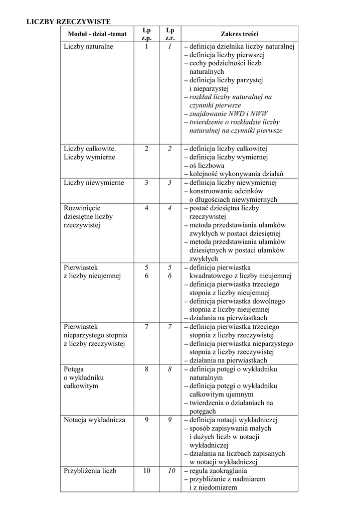 LICZBY RZECZYWISTE Lp z.p. Lp z.r. Liczby naturalne 1 1 ─ Liczby całkowite. Liczby wymierne 2 2 ─ Liczby niewymierne 3 3 Rozwinięcie dziesiętne liczby rzeczywistej 4 4 Pierwiastek z liczby nieujemnej 5 6 5 6 Pierwiastek nieparzystego stopnia z liczby rzeczywistej 7 7 Potęga o wykładniku całkowitym 8 8 Notacja wykładnicza 9 9 Przybliżenia liczb 10 10 Moduł - dział -temat Zakres treści definicja dzielnika liczby naturalnej ─ definicja liczby pierwszej ─ cechy podzielności liczb naturalnych ─ definicja liczby parzystej i nieparzystej ─ rozkład liczby naturalnej na czynniki pierwsze ─ znajdowanie NWD i NWW ─ twierdzenie o rozkładzie liczby naturalnej na czynniki pierwsze definicja liczby całkowitej ─ definicja liczby wymiernej ─ oś liczbowa ─ kolejność wykonywania działań ─ definicja liczby niewymiernej ─ konstruowanie odcinków o długościach niewymiernych ─ postać dziesiętna liczby rzeczywistej ─ metoda przedstawiania ułamków zwykłych w postaci dziesiętnej ─ metoda przedstawiania ułamków dziesiętnych w postaci ułamków zwykłych ─ definicja pierwiastka kwadratowego z liczby nieujemnej ─ definicja pierwiastka trzeciego stopnia z liczby nieujemnej ─ definicja pierwiastka dowolnego stopnia z liczby nieujemnej ─ działania na pierwiastkach ─ definicja pierwiastka trzeciego stopnia z liczby rzeczywistej ─ definicja pierwiastka nieparzystego stopnia z liczby rzeczywistej ─ działania na pierwiastkach ─ definicja potęgi o wykładniku naturalnym ─ definicja potęgi o wykładniku całkowitym ujemnym ─ twierdzenia o działaniach na potęgach ─ definicja notacji wykładniczej ─ sposób zapisywania małych i dużych liczb w notacji wykładniczej ─ działania na liczbach zapisanych w notacji wykładniczej ─ reguła zaokrąglania ─ przybliżanie z nadmiarem i z niedomiarem błąd przybliżenia ─ pojęcie procentu ─ pojęcie punktu procentowego ─ Obliczenia procentowe Powtórzenie wiadomości z liczb rzeczywistych. Praca klasowa i jej omówienie. 11 12 13 14 15 11 12 13 14 15 Lp z.p. LP z.r. JĘZYK MATEMATYKI Moduł - dział -temat Zakres treści Pojęcie zbioru 1 1 Działania na zbiorach 2 2 Przedziały liczbowe 3 3 Działania na przedziałach. 4 4 ─ Rozwiązywanie nierówności pierwszego 5 6 5 6 ─ 7 7 8 9 ─ 10 11 ─ 13 ─ stopnia z jedną niewiadomą Wzory skróconego mnożenia Zastosowanie przekształceń algebraicznych 8 9 Wartość bezwzględna 10 Własności wartości bezwzględnej - sposoby opisywania zbiorów ─ zbiory skończone i nieskończone ─ zbiór pusty ─ definicja podzbioru ─ relacja zawierania zbiorów ─ zapis symboliczny zbioru ─ iloczyn zbiorów ─ suma zbiorów ─ różnica zbiorów ─ dopełnienie zbioru ─ określenie przedziałów: otwartego, domkniętego, lewostronnie domkniętego, prawostronnie domkniętego, nieograniczonego ─ zapis symboliczny przedziałów ─ iloczyn, suma, różnica przedziałów nierówności pierwszego stopnia z jedną niewiadomą ─ nierówności równoważne wzory skróconego mnożenia (a ± b)² oraz a² – b² ─ wzory skróconego mnożenia (a ± b)³ oraz a³ ± b³ zastosowanie przekształceń algebraicznych do przekształcania równoważnego równań i nierówności ─ usuwanie niewymierności z mianownika 12 ─ definicja wartości bezwzględnej ─ interpretacja geometryczna wartości bezwzględnej własności wartości bezwzględnej Równania i nierówności z wartością bezwzględną Błąd bezwzględny i błąd względny - Powtórzenie wiadomości z języka matematyki. Praca klasowa i jej omówienie 12 13 14 15 11 14 − metody rozwiązywania równań 15 i nierówności z wartością 16 bezwzględną 17 18 ─ określenie błędu bezwzględnego i błędu względnego przybliżenia 19 20 21 22 FUNKCJA LINIOWA Lp z.p. Moduł - dział -temat Sposoby opisu funkcji 1 Lp z.r. 1 Zakres treści definicja funkcji sposoby opisywania funkcji ─ definicja miejsca zerowego ─ definicja funkcji liniowej ─ wykres funkcji liniowej ─ interpretacja geometryczna współczynników występujących we wzorze funkcji liniowej ─ pojęcia: pęk prostych, środek pęku ─ własności funkcji liniowej ─ ─ Wykres funkcji liniowej 2 2 3 Własności funkcji liniowej 4 3 Równanie prostej na płaszczyźnie 5 4 5 ─ Współczynnik kierunkowy prostej 6 6 7 ─ Warunek prostopadłości prostych 7 8 9 Układy równań liniowych 8 9 10 Interpretacja geometryczna układu równań liniowych 10 11 12 Układy nierówności liniowych 13 równanie kierunkowe prostej ─ równanie ogólne prostej współczynnik kierunkowy prostej przechodzącej przez dwa dane punkty ─ interpretacja geometryczna współczynnika kierunkowego ─ warunek prostopadłości prostych o równaniach kierunkowych ─ wyznaczanie równania prostej prostopadłej do danej prostej ─ metody algebraiczne rozwiązywania układów równań liniowych ─ definicja układu równań oznaczonego, sprzecznego, nieoznaczonego ─ interpretacja geometryczna układu oznaczonego, sprzecznego i nieoznaczonego interpretacja geometryczna nierówności z dwiema niewiadomymi ─ pojęcie półpłaszczyzny otwartej i ─ Funkcja liniowa – zastosowania 11 14 15 Powtórzenie wiadomości z funkcji liniowej. Praca klasowa i jej omówienie 12 13 14 16 17 18 19 domkniętej ─ ilustracja geometryczna układu nierówności ─ tworzenie modelu matematycznego opisującego przedstawione zagadnienie praktyczne FUNKCJE Lp z.p. 1 Moduł - dział -temat Dziedzina i miejsca zerowe funkcji Szkicowanie wykresu funkcji Monotoniczność funkcji Lp z.r. Zakres treści ─ 2 1 2 3 3 4 ─ Odczytywanie własności funkcji z wykresu 4 5 5 6 Przesuwanie wykresu wzdłuż osi OY 6 7 Przesuwanie wykresu wzdłuż osi OX 7 8 Wektory w układzie współrzędnych 9 Przesuwanie wykresu o wektor Przekształcanie wykresu przez symetrię względem osi układu współrzędnych Inne przekształcenia wykresu 10 8 9 11 12 13 d