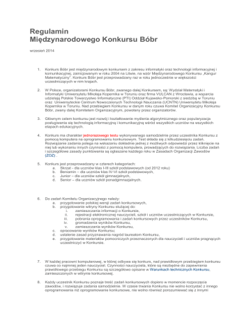 Regulamin Międzynarodowego Konkursu Bóbr wrzesień 2014 1. Konkurs Bóbr jest międzynarodowym konkursem z zakresu informatyki oraz technologii informacyjnej i komunikacyjnej, zainicjowanym w roku 2004 na Litwie, na wzór Międzynarodowego Konkursu „Kangur Matematyczny”. Konkurs Bóbr jest przeprowadzany raz w roku jednocześnie w większości uczestniczących w nim krajach. 2. W Polsce, organizatorami Konkursu Bóbr, zwanego dalej Konkursem, są: Wydział Matematyki i Informatyki Uniwersytetu Mikołaja Kopernika w Toruniu oraz firma VULCAN z Wrocławia, a wsparcia udzielają Polskie Towarzystwo Informatyczne (PTI) Oddział Kujawsko-Pomorski z siedzibą w Toruniu oraz Uniwersyteckie Centrum Nowoczesnych Technologii Nauczania (UCNTN) Uniwersytetu Mikołaja Kopernika w Toruniu. Nad przebiegiem Konkursu w danym roku czuwa Komitet Organizacyjny Konkursu Bóbr, zwany dalej Komitetem Organizacyjnym, powołany przez organizatorów. 3. Głównym celem konkursu jest rozwój i kształtowanie myślenia algorytmicznego oraz popularyzacja posługiwania się technologią informacyjną i komunikacyjną wśród wszystkich uczniów na wszystkich etapach edukacyjnych. 4. Konkurs ma charakter jednorazowego testu wykonywanego samodzielnie przez uczestnika Konkursu z pomocą komputera na oprogramowaniu konkursowym. Test składa się z kilkudziesięciu zadań. Rozwiązanie zadania polega na wskazaniu dokładnie jednej z możliwych odpowiedzi przez kliknięcie na niej lub wykonaniu innych czynności z pomocą komputera, prowadzących do rozwiązania. Liczba zadań i szczegółowe zasady punktowania są ogłaszane każdego roku w Zasadach Organizacji Zawodów (ZOZ) . 5. Konkurs jest przeprowadzany w czterech kategoriach: a. Skrzat - dla uczniów klas I-III szkół podstawowych (od 2012 roku) b. Beniamin – dla uczniów klas IV-VI szkół podstawowych, c. Junior – dla uczniów szkół gimnazjalnych, d. Senior – dla uczniów szkół ponadgimnazjalnych. 6. Do zadań Komitetu Organizacyjnego należy: a. przygotowanie polskiej wersji zadań konkursowych, b. przygotowanie witryny Konkursu służącej do: i. zamieszczania informacji o Konkursie, ii. rejestracji elektronicznej nauczycieli, szkół i uczniów uczestniczących w Konkursie, iii. pobrania oprogramowania i zadań konkursowych przez uczestników Konkursu, iv. gromadzenia wyników Konkursu, v. zamieszczania wyników Konkursu, c. opracowanie wyników Konkursu; d. ustalenie zasad przyznawania nagród laureatom Konkursu, e. przygotowanie materiałów pomocniczych przeznaczonych dla nauczycieli i uczniów pragnących uczestniczyć w Konkursie. 7. W każdej pracowni komputerowej, w której odbywa się konkurs, nad prawidłowym przebiegiem konkursu czuwa co najmniej jeden nauczyciel. Czynności nauczyciela, które są niezbędne do zapewnienia prawidłowego przebiegu Konkursu są szczegółowo opisane w Warunkach technicznych Konkursu, zamieszczonych w witrynie konkursowej. 8. Każdy uczestnik Konkursu poznaje treść zadań konkursowych dopiero w momencie rozpoczęcia zawodów, i rozwiązuje zadania samodzielnie. W czasie trwania Konkursu nie wolno korzystać z innego oprogramowania niż oprogramowanie konkursowe, nie wolno również porozumiewać się z innymi osobami za pomocą technicznych środków łączności, takich jak poczta elektroniczna czy telefon komórkowy. Rozwiązania zadań są oceniane automatycznie po przesłaniu ich na witrynę Konkursu. 9. Wstępne wyniki uzyskane przez poszczególnych uczniów są udostępniane nauczycielom przez witrynę konkursową nie później, niż w dwa tygodnie po Konkursie. W ciągu czterech tygodni przeprowadzenia konkursu przyjmowane są reklamacje dotyczące wyników. Komitet Organizacyjny ogłasza wyniki Konkursu na witrynie Konkursu w terminie dwóch miesięcy od daty przeprowadzenia Konkursu. Ogłaszane są listy laureatów i uczniów wyróżnionych. Wyniki wszystkich uczniów z danej szkoły są dostępne na witrynie Konkursu. Może je pobrać nauczyciel zarejestrowany jako opiekun uczniów z danej szkoły. 10. Komitet Organizacyjny może przyznawać nagrody w następujących kategoriach: a. nagrody laureatom Konkursu, b. nagrody szkołom, c. nagrody nauczycielom. 11. Komitet Organizacyjny ustala oddzielnie dla każdego poziomu wiekowego kryteria przydziału nagród w poszczególnych kategoriach. 12. Laureaci Konkursu otrzymują potwierdzony dyplomem, wydany przez Komitet Organizacyjny Konkursu tytuł Laureat edycji polskiej Międzynarodowego Konkursu Bóbr. Każdy uczestnik Konkursu i nauczyciel opiekujący się uczestnikami Konkursu otrzymuje dyplom uczestnictwa w Konkursie. Druk dyplomów konkursowych odbywa się z witryny Konkursu. Ważność dyplomu potwierdza pieczęć szkoły oraz własnoręczny podpis dyrektora szkoły i nauczyciela przeprowadzającego konkurs w szkole. 13. Komitet Organizacyjny rozpatruje odwołania dotyczące wyników Konkursu, o ile zostały one złożone przed 1 czerwca roku, w którym przeprowadzono konkurs. Wyniki konkursu przechowywane są przez Komitet Organizacyjny do dnia 22 czerwca roku, w którym przeprowadzono konkurs i po tym terminie odwołania uczestników Konkursu nie będą rozpatrywane. 14. Komitet Organizacyjny przed ogłoszeniem wyników Konkursu ma prawo do dyskwalifikacji tych uczniów, których wyniki wskazują, że zostały one otrzymane niesamodzielnie lub czas rozwiązywania zadań był zbyt krótki. Komitet Organizacyjny przedstawia nauczycielowi i dyrektorowi szkoły powody, dla których podjęta została decyzja o dyskwalifikacji uczniów. 15. Wszelkie sprawy nieobjęte niniejszym Regulaminem rozstrzyga Komitet Organizacyjny Konkursu.