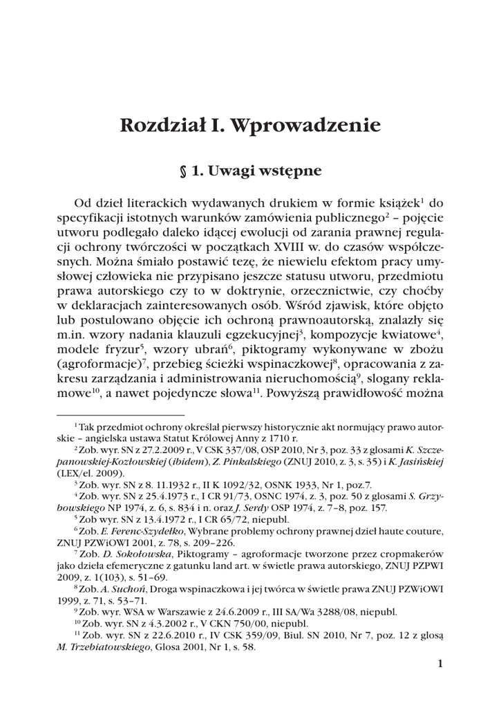 Rozdział I. Wprowadzenie § 1. Uwagi wstępne Od dzieł literackich wydawanych drukiem w formie książek do specyfikacji istotnych warunków zamówienia publicznego – pojęcie utworu podlegało daleko idącej ewolucji od zarania prawnej regulacji ochrony twórczości w początkach XVIII w. do czasów współczesnych. Można śmiało postawić tezę, że niewielu efektom pracy umysłowej człowieka nie przypisano jeszcze statusu utworu, przedmiotu prawa autorskiego czy to w doktrynie, orzecznictwie, czy choćby w deklaracjach zainteresowanych osób. Wśród zjawisk, które objęto lub postulowano objęcie ich ochroną prawnoautorską, znalazły się m.in. wzory nadania klauzuli egzekucyjnej, kompozycje kwiatowe, modele fryzur, wzory ubrań, piktogramy wykonywane w zbożu (agroformacje), przebieg ścieżki wspinaczkowej, opracowania z zakresu zarządzania i administrowania nieruchomością, slogany reklamowe10, a nawet pojedyncze słowa11. Powyższą prawidłowość można Tak przedmiot ochrony określał pierwszy historycznie akt normujący prawo autorskie – angielska ustawa Statut Królowej Anny z 1710 r. Zob. wyr. SN z 27.2.2009 r., V CSK 337/08, OSP 2010, Nr 3, poz. 33 z glosami K. Szczepanowskiej-Kozłowskiej (ibidem), Z. Pinkalskiego (ZNUJ 2010, z. 3, s. 35) i K. Jasińskiej (LEX/el. 2009). Zob. wyr. SN z 8. 11.1932 r., II K 1092/32, OSNK 1933, Nr 1, poz.7. Zob. wyr. SN z 25.4.1973 r., I CR 91/73, OSNC 1974, z. 3, poz. 50 z glosami S. Grzybowskiego NP 1974, z. 6, s. 834 i n. oraz J. Serdy OSP 1974, z. 7–8, poz. 157. Zob wyr. SN z 13.4.1972 r., I CR 65/72, niepubl. Zob. E. Ferenc-Szydełko, Wybrane problemy ochrony prawnej dzieł haute couture, ZNUJ PZWiOWI 2001, z. 78, s. 209–226. Zob. D. Sokołowska, Piktogramy – agroformacje tworzone przez cropmakerów jako dzieła efemeryczne z gatunku land art. w świetle prawa autorskiego, ZNUJ PZPWI 2009, z. 1(103), s. 51–69. Zob. A. Suchoń, Droga wspinaczkowa i jej twórca w świetle prawa ZNUJ PZWiOWI 1999, z. 71, s. 53–71. Zob. wyr. WSA w Warszawie z 24.6.2009 r., III SA/Wa 3288/08, niepubl. 10 Zob. wyr. SN z 4.3.2002 r., V CKN 750/00, niepubl. 11 Zob. wyr. SN z 22.6.2010 r., IV CSK 359/09, Biul. SN 2010, Nr 7, poz. 12 z glosą M. Trzebiatowskiego, Glosa 2001, Nr 1, s. 58. Rozdział I. Wprowadzenie łatwo wytłumaczyć, wskazując na takie właściwości systemu prawa autorskiego12, jak brak formalności potrzebnych do uzyskania ochrony prawnej, monopolistyczny charakter prawa podmiotowego oraz intensywność ochrony tego monopolu. Podmiot prawa autorskiego posiada bardzo szeroki wachlarz roszczeń na wypadek naruszenia interesów i to nawet w odniesieniu do naruszeń niezawinionych, obejmujący uprawnienia zakazowe (możliwość żądania zaniechania eksploatacji, na którą nie wyraża zgody), restytucyjne (roszczenia o usunięcie skutków naruszenia, w tym o złożenie oświadczenia), odszkodowawcze sensu stricto i inne (m.in. roszczenie o wydanie korzyści)13. O uprzywilejowanej, z normatywnego punktu widzenia, pozycji podmiotu prawa autorskiego najdobitniej świadczy konstrukcja roszczenia o naprawienie szkody wynikającej z naruszenia autorskich praw majątkowych: ustawodawca jako alternatywę dla roszczenia opartego o zasady ogólne wprowadził możliwość żądania wielokrotności stosownego wynagrodzenia z tytułu udzielenia zgody na korzystanie z utworu. W ten sposób uprawniony został zwolniony z obowiązku dowodzenia wysokości szkody, jaką poniósł wskutek naruszenia jego interesu (w sytuacji, gdy ciężar dowodu szkody i jej wysokości typowo obciąża poszkodowanego dochodzącego jej naprawienia). Zarazem, roszczenie o naprawienie szkody poprzez zapłatę wielokrotności wynagrodzenia przysługuje podmiotowi prawa autorskiego nawet wówczas, gdy naruszenie jest niezawinione (w tym przypadku jest to dwukrotność), co jest kolejnym przejawem korzystnej dla zainteresowanego specyfiki tej konstrukcji odpowiedzialności odszkodowawczej. Generalnie, porównanie katalogu roszczeń z art. 78 i 79 PrAutiPrPokr z roszczeniami ochronnymi przewidzianymi dla innych praw podmiotowych (w tym odnoszącymi się do innych niż utwory praw na dobrach niematerialnych)14 prowadzi do wniosku, że prawo autorskie jest najsilniej chronionym prawem 12 Pojęcie „system prawa autorskiego” definiuję jako zespół instytucji prawnych składających się na unormowanie ochrony wybranych przez ustawodawcę obiektów, stanowiących, w najogólniejszym ujęciu, efekty wysiłku intelektualnego człowieka o charakterze kulturowym (dobra kultury). Obecnie, katalog obiektów chronionych w ramach systemu prawa autorskiej określa ustawa z 4.2.1994 r. o prawie autorskim i prawach pokrewnych (t.j. Dz.U. z 2006 r. Nr 90, poz. 631 ze zm.). Jako obiekty chronione w ramach systemu prawa autorskiego postrzegam zarówno przedmiot prawa autorskiego sensu stricto, jak i przedmioty tzw. praw pokrewnych. 13 Zob. art. 78 i 79 PrAutiPrPokr. 14 Zob. przepisy o ochronie patentów, wzorów użytkowych, wzorów przemysłowych, znaków towarowych, oznaczeń geograficznych i topografii układów scalonych § 1. Uwagi wstępne podmiotowym w polskim systemie prawa prywatnego. Jego atrakcyjność jest więc w pełni zrozumiała, a tendencja do rozszerzania zakresu przedmiotowego ochrony prawnoautorskiej jest tej atrakcyjności pochodną. Z uwagi na intensywność ochrony prawnoautorskiej, a także jej przedmiotowe krzyżowanie się z ochroną wynikającą z innych instytucji prawnych (np. ochrony utworu wzornictwa przemysłowego z tą wynikającą z rejestracji wzoru przemysłowego w oparciu o przepisy Prawa własności przemysłowej), decyzja o przyznaniu obiektowi statusu przedmiotu prawa autorskiego nie powinna być podejmowana pochopnie. Istnieje ważna potrzeba wyznaczenia granic zjawiska, które podlega monopolistycznemu prawu autorskiemu, zważywszy m.in. na następujące uwarunkowania: 1) rozległość semantyczna pojęcia utworu wpływa na znaczenie p