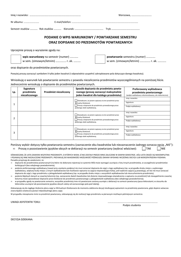 Imię i nazwisko: ……………………………………………………………………… Nr albumu: …………………… Warszawa, ………………………….. E-mail/telefon: …………………………………………………………………………………………… Semestr studiów ………… Rok studiów ………… Kierunek: ……………………………………… Tryb ……………………………………… PODANIE O WPIS WARUNKOWY / POWTARZANIE SEMESTRU ORAZ DOPISANIE DO PRZEDMIOTÓW POWTARZANYCH Uprzejmie proszę o wyrażenie zgody na: wpis warunkowy na semestr (numer) ………… w sem. (zimowym/letnim) …………… r. ak. ………… powtarzanie semestru (numer) …………. w sem. (zimowym/letnim) …………… r. ak. ………… oraz dopisanie do przedmiotów powtarzanych. Powyżej proszę zaznaczyć symbolem X tylko jeden kwadrat (i odpowiednio uzupełnić zakropkowane pola dotyczące danego kwadratu). Wnioskuję o warunek lub powtarzanie semestru z powodu niezaliczenia przedmiotów wyszczególnionych na poniższej liście. Jednocześnie wnioskuję o dopisanie do przedmiotów powtarzanych. Lp. Sygnatura przedmiotu niezaliczonego Przedmiot niezaliczony Sposób dopisania do przedmiotu powtarzanego (proszę zaznaczyć maksymalnie jeden kwadrat dla każdego przedmiotu) Preferowany wykładowca przedmiotu powtarzanego (podpis wykładowcy rekomendowany, ale niekonieczny) Imię i nazwisko: 1 __ Oświadczam, że jestem zapisany na ten przedmiot przez Wirtualny Dziekanat. __ Proszę o dopisanie do przedmiotu prowadzonego przez podanego obok wykładowcę. 2 __ Oświadczam, że jestem zapisany na ten przedmiot przez Wirtualny Dziekanat. __ Proszę o dopisanie do przedmiotu prowadzonego przez podanego obok wykładowcę. 3 __ Oświadczam, że jestem zapisany na ten przedmiot przez Wirtualny Dziekanat. __ Proszę o dopisanie do przedmiotu prowadzonego przez podanego obok wykładowcę. Sygnatura: Podpis wykładowcy: Imię i nazwisko: Sygnatura: Podpis wykładowcy: Imię i nazwisko: Sygnatura: Podpis wykładowcy: Poniższy wybór dotyczy tylko powtarzania semestru (zaznaczenie obu kwadratów lub niezaznaczenie żadnego oznacza opcję „NIE”): • Proszę o pozostawienie języków obcych w deklaracji na semestr powtarzany (wybrać właściwe): __ TAK __ NIE OŚWIADCZAM, ŻE LISTA ZAWIERA WSZYSTKIE PRZEDMIOTY, O KTÓRYCH WIEM, IŻ NIE ZOSTAŁY PRZEZE MNIE ZALICZONE W DANYM SEMESTRZE. JEŚLI LISTA OKAŻE SIĘ NIEKOMPLETNA I POJAWIĄ SIĘ INNE NIEZALICZONE PRZEDMIOTY, PRZYJMUJĘ DO WIADOMOŚCI MOŻLIWOŚĆ PÓŹNIEJSZEJ ZMIANY WYDANEJ WCZEŚNIEJ DECYZJI LUB NIEROZPATRZENIA PODANIA. Ponadto przyjmuję do wiadomości, że: • dopisanie do przedmiotów powtarzanych (na które nie dokonano rejestracji w systemie WD) może wymagać usunięcia z listy innych przedmiotów, w szczególności przedmiotów kolidujących (bez odrębnego powiadomienia); • podanie preferowanego wykładowcy (nawet przy uzyskaniu podpisu) nie musi oznaczać dopisania do zajęć u tego wykładowcy (np. w przypadku braku miejsc u wybranego wykładowcy, większej liczby miejsc u innych wykładowców lub możliwości wpisania na zajęcia niepowodujące kolizji, jeśli wybrane zajęcia ją powodują), ani też nie musi oznaczać dopisania do zajęć z tego przedmiotu u jakiegokolwiek wykładowcy (np. w przypadku braku miejsc u wszystkich wykładowców lub nieuruchomienia przedmiotu); • podanie błędnych danych w czwartej kolumnie (np. zaznaczenie dwóch kwadratów lub złożenie nieprawdziwego oświadczenia o zapisaniu na przedmiot) lub niewypełnienie czwartej kolumny może spowodować dopisanie przez Dziekanat do przedmiotu powtarzanego u jakiegokolwiek wykładowcy (bez odrębnego powiadomienia); • w przypadku zgody na powtarzanie semestru, wszystkie przedmioty inne niż powtarzane zostaną usunięte z deklaracji na semestr powtarzany (poza lektoratami; w stosunku do lektoratów usunięcie lub pozostawienie języków obcych zależy od zaznaczonego pola pod tabelą). Zobowiązuję się do ciągłego śledzenia planu zajęć w Wirtualnym Dziekanacie do momentu odebrania decyzji skutkującej wpisaniem na przedmioty powtarzane, gdyż dopiero wówczas znana będzie ostateczna postać indywidualnego planu zajęć. W przypadku niezapisania mnie na przedmiot powtarzany, zobowiązuję się do realizacji tego przedmiotu w pierwszym możliwym późniejszym semestrze. UWAGI ASYSTENTKI TOKU: ……………………………………………………………………. Podpis studenta ..................................................................................................................................................................................................................................... DECYZJA DZIEKANA: