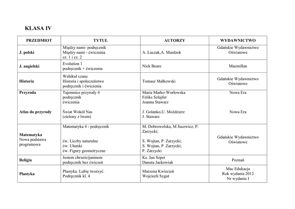 KLASA IV TYTUŁ PRZEDMIOT AUTORZY WYDAWNICTWO J. polski Między nami- podręcznik Między nami - ćwiczenia cz. 1 i cz. 2 A. Łuczak,A. Murdzek J. angielski Evolution 1 podręcznik + ćwiczenia Nick Beare Historia Wehikuł czasu Historia i społeczeństwo podręcznik i ćwiczenia Tomasz Małkowski Przyroda Tajemnice przyrody 4 podręcznik ćwiczenia Maria Marko-Worłowska Feliks Szlajfer Joanna Stawarz Nowa Era Atlas do przyrody Świat Wokół Nas (zielony z lwem) J. Golanko,U. Moździerz J. Stawarz Nowa Era Matematyka 4 - podręcznik M. Dobrowolska, M Jucewicz, P. Zarzycki; ćw. Liczby naturalne ćw. Ułamki ćw. Figury geometryczne S. Wojtan, P. Zarzycki; S. Wojtan, P. Zarzycki; P. Zarzycki Religia Jestem chrześcijaninem podręcznik bez ćwiczeń Ks. Jan Szpet Danuta Jackowiak Poznań Plastyka Plastyka. Lubię tworzyć. Podręcznik kl. 4 Marzena Kwiecień Wojciech Sygut Mac Edukacja Rok wydania 2012 Nr wydania I Matematyka Nowa podstawa programowa Gdańskie Wydawnictwo Oświatowe Macmillan Gdańskie Wydawnictwo Oświatowe Gdańskie Wydawnictwo Oświatowe Technika Jak to działa podręcznik + ćwiczenia dla kl. 4-6 Lech Łabecki, Marta Łabecka Muzyka Muzyczny Świat - podręcznik Teresa Wójcik Zajęcia komputerowe Informatyka Europejczyka. Podręcznik do zajęć komputerowych dla szkoły podstawowej – kl. 4 Edycja: Windows XP, Linux Ubuntu, MS Office 2003, OpenOffice.org (wydanie II) D. Kiałka, K Kiałka Nowa Era MAC Edukacja rok wydania 2012 Helion KLASA V TYTUŁ PRZEDMIOT J. polski AUTORZY Między nami - podręcznik A. Łuczak, A. Murdzek Między Nami kl. 5 szkoły podstawowej ćwiczenia część 1 i 2 A. Łuczak, A. Murdzek J. angielski Evolution 2 podręcznik + ćwiczenia Nick Beare Historia Wehikuł czasu Historia i społeczeństwo podręcznik i ćwiczenia Tomasz Małkowski Przyroda Tajemnice przyrody 5 podręcznik ćwiczenia Atlas do przyrody Świat Wokół Nas (zielony z lwem) Matematyka Matematyka 5- podręcznik M. Dobrowolska, M Jucewicz, P. Zarzycki M. Karpiński, ćw. Geometria M. Dobrowolska, A. Mysior, P. Zarzycki ćw. Liczby całkowite i ułamki cz. 1 Z. Bolałek, M. Dobrowolska, A. Mysior, S. Wojtan Z. Bolałek, M. Dobrowolska, A. Mysior, S. Wojtan ćw. Liczby całkowite i ułamki cz. 2 Maria Marko-Worłowska Feliks Szlajfer Joanna Stawarz J. Golanko,U. Moździerz J. Stawarz WYDAWNICTWO Gdańskie Wydawnictwo Oświatowe Macmillan Gdańskie Wydawnictwo Oświatowe Nowa Era Nowa Era Gdańskie Wydawnictwo Oświatowe Religia Plastyka Muzyka Wierzę w Boga nowy podręcznik bez ćwiczeń Plastyka. Lubię tworzyć. Podręcznik .klasa5 Muzyczny Świat - podręcznikkl.V Zajęcia komputerowe Informatyka Europejczyka. Podręcznik do zajęć komputerowych dla szkoły podstawowej – kl. 5 Edycja: Windows XP, Linux Ubuntu, MS Office 2003, OpenOffice.org (Wydanie II) Technika kontynuacja podręcznika z kl. IV Jak to działa podręcznik + ćwiczenia dla kl. 4-6 Ks. Jan Szpet D. Jackowiak Poznań Marzena Kwiecień Wojciech Sygut Mac Edukacja Teresa Wójcik MAC Edukacja 2013 D. Kiałka, K Kiałka Helion Nowa Era KLASA VI TYTUŁ PRZEDMIOT J. polski J. angielski Między nami-podręcznik Między Nami kl. 6 szkoły podstawowej ćwiczenia część 1 i 2 Evolution 3 podręcznik + ćwiczenia AUTORZY D. Łuczak, E. A. Murdzek WYDAWNICTWO Gdańskie Wydawnictwo Oświatowe P. Borys, A. Halasz Nich Beare Macmillan Historia Wehikuł czasu Historia i społeczeństwo Podręcznik i ćwiczenia T. Małkowski Nowa Era Przyroda Tajemnice przyrody kl. VI podręcznik + ćwiczenia 1 i 2 cz. atlas do przyrody J. Stawarz F. Szlajfer H. Kowalczyk Nowa Era Matematyka Matematyka 6- podręcznik M. Dobrowolska, M Jucewicz, P. Zarzycki, M. Karpiński ćw. Geometria M. Dobrowolska, M Jucewicz, P. Zarzycki Religia ćw. Liczby i wyrażenia algebraiczne cz. 1 Z. Bolałek, M. Dobrowolska, A. Mysior, S. Wojtan ćw. Liczby i wyrażenia algebraiczne cz. 2 A.Demby, M. Dobrowolska M. JucewiczP. Zarzycki Ks. J. Szpet D. Jackowiak Wierzę w Kościół podręcznik bez ćwiczeń Gdańskie Wydawnictwo Oświatowe Poznań Technika kontynuacja podręcznika z kl. IV Jak to działa podręcznik + ćwiczenia dla kl. 4-6 Muzyka (nowa podstawa Programowa) I gra muzyka podręcznik Z dodatkiem „ Zagrajmy” i „ Zaśpiewajmy” dla klas 4-6 M.Gromek, G.Kilbach 569/2012 Zajęcia komputerowe Informatyka Europejczyka. Podręcznik do zajęć komputerowych dla szkoły podstawowej kl.6 Edycja: Windows XP, Linux Ubuntu, MS Office 2003, OpenOffice.org( Wydanie II) D. Kiałka z zespołem Helion Nowa Era