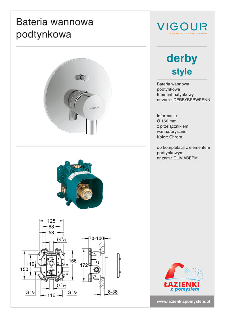 Bateria wannowa podtynkowa derby style Bateria wannowa podtynkowa Element natynkowy nr zam.: DERBYBSBWPENN Informacje Ø 160 mm z przełącznikiem wanna/prysznic Kolor: Chrom do kompletacji z elementem podtynkowym nr zam.: CLIVIABEPM www.lazienkizpomyslem.pl