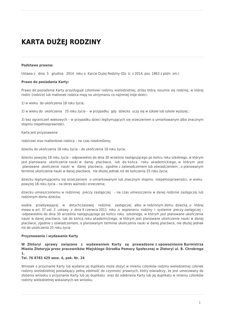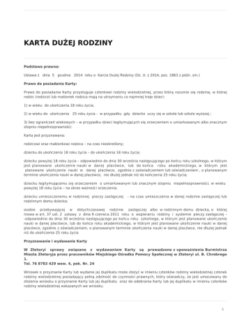 KARTA DUŻEJ RODZINY Podstawa prawna: Ustawa z dnia 5 grudnia 2014 roku o Karcie Dużej Rodziny (Dz. U. z 2014, poz. 1863 z późn. zm.) Prawo do posiadania Karty: Prawo do posiadania Karty przysługuje członkowi rodziny wielodzietnej, przez którą rozumie się rodzinę, w której rodzic (rodzice) lub małżonek rodzica mają na utrzymaniu co najmniej troje dzieci: 1) w wieku do ukończenia 18 roku życia; 2) w wieku do ukończenia 25 roku życia - w przypadku gdy dziecko uczy się w szkole lub szkole wyższej ; 3) bez ograniczeń wiekowych – w przypadku dzieci legitymujących się orzeczeniem o umiarkowanym albo znacznym stopniu niepełnosprawności. Karta jest przyznawana: rodzicowi oraz małżonkowi rodzica – na czas nieokreślony; dziecku do ukończenia 18 roku życia – do ukończenia 18 roku życia; dziecku powyżej 18 roku życia – odpowiednio do dnia 30 września następującego po końcu roku szkolnego, w którym jest planowane ukończenie nauki w danej placówce, lub do końca roku akademickiego, w którym jest planowane ukończenie nauki w danej placówce, zgodnie z zaświadczeniem lub oświadczeniem , o planowanym terminie ukończenia nauki w danej placówce, nie dłużej jednak niż do kończenia 25 roku życia; dziecku legitymującemu się orzeczeniem o umiarkowanym lub znacznym stopniu niepełnosprawności, w wieku powyżej 18 roku życia – na okres ważności orzeczenia; dziecku umieszczonemu w rodzinnej pieczy zastępczej rodzinnym domu dziecka; - na czas umieszczenia w danej rodzinie zastępczej lub osobie przebywającej w dotychczasowej rodzinie zastępczej albo w rodzinnym domu dziecka, o której mowa w art. 37 ust. 2 ustawy z dnia 9 czerwca 2011 roku o wspieraniu rodziny i systemie pieczy zastępczej – -odpowiednio do dnia 30 września następującego po końcu roku szkolnego, w którym jest planowane ukończenie nauki w danej placówce, lub do końca roku akademickiego, w którym jest planowane ukończenie nauki w danej placówce, zgodnie z oświadczeniem, o planowanym terminie ukończenia nauki w danej placówce, nie dłużej jednak niż do ukończenia 25 roku życia Przyznawanie i wydawanie Karty W Złotoryi sprawy związane z wydawaniem Karty są prowadzone z upoważnienia Burmistrza Miasta Złotoryja przez pracowników Miejskiego Ośrodka Pomocy Społecznej w Złotoryi ul. B. Chrobrego 1. Tel. 76 8783 429 wew. 4, pok. Nr. 24 Wniosek o przyznanie Karty lub wydanie jej duplikatu może złożyć w imieniu członków rodziny wielodzietnej członek rodziny wielodzietnej posiadający pełną zdolność do czynności prawnych, który oświadczy, że jest umocowany do złożenia wniosku o przyznanie Karty lub jej duplikatu oraz do odebrania Karty lub jej duplikatu w imieniu członków rodziny wielodzietnej wskazanych we wniosku. 1 Składając wniosek o przyznanie Karty, przedstawia się oryginały lub odpisy dokumentów potwierdzających prawo do przyznania Karty, w szczególności: - w przypadku rodzica – dokument potwierdzający tożsamość oraz oświadczenie, że rodzic nie jest pozbawiony władzy rodzicielskiej ani ograniczony we władzy rodzicielskiej przez umieszczenie dziecka w pieczy zastępczej w stosunku do co najmniej trojga dzieci; - w przypadku małżonka rodzica – dokument potwierdzający tożsamość oraz akt małżeństwa; - w przypadku dzieci w wieku powyżej 18 roku życia – dokument potwierdzający tożsamość oraz oświadczenie o planowanym terminie ukończenia nauki w danej placówce; - w przypadku dzieci w wieku powyżej 18 roku życia – dokument potwierdzający tożsamość oraz oświadczenie o planowanym terminie ukończenia nauki w danej placówce; - w przypadku dzieci legitymujących się orzeczenie o umiarkowanym lub znacznym stopniu niepełnosprawności w wieku powyżej 18 roku życia – dokument potwierdzający tożsamość oraz orzeczenie o umiarkowanym albo znacznym stopniu niepełnosprawności; - w przypadku dzieci umieszczonych w pieczy zastępczej lub rodzinnym domu Dziecka – postanowienie o umieszczeniu w rodzinie zastępczej lub rodzinnym domu Dziecka; - w przypadku osób przebywających w dotychczasowej rodzinie zastępczej albo w rodzinnym domy Dziecka, o których mowa w art. 37 ust. 2 ustawy z dnia 9 czerwca 2011 roku o wspieraniu rodziny i systemie pieczy zastępczej – oświadczenie o pozostawaniu w dotychczasowej rodzinie zastępczej lub rodzinnym domu dziecka. Wniosek o przyznanie Karty lub wydanie jej duplikatu może być złożony w formie dokumentu elektronicznego opatrzonego bezpiecznym podpisem elektronicznym weryfikowanym za pomocą ważnego kwalifikowanego certyfikatu lub podpisem potwierdzonym profilem zaufanym ePUAP. Karta Dużej Rodziny jest przyznawana bezpłatnie Wydanie duplikatu Karty podlega opłacie w wys. 9,21 zł Jak zostać partnerem Karty Dużej Rodziny? Szczegółowe informacje dla firm i instytucji, które chcą się włączyć do ogólnopolskiego programu Karty Dużej Rodziny znajdują się na stronach internetowych: www.rodzina.gov.pl Przysługujące zniżki dla posiadaczy Karty Dużej Rodziny Strony internetowe www.rodzina.gov.pl , Partnerzy Karty Dużej Rodziny DRUKI DO POBRANIA: -Wniosek o wydanie Karty Dużej Rodziny -Oświadczenie o kontynuowaniu nauki -Oświadczenie ograniczenie władzy rodzicielskiej -Oświadczenie o kontynuowaniu nauki 2 2 -Oświadczenie o utracie Karty Dużej Rodziny 3