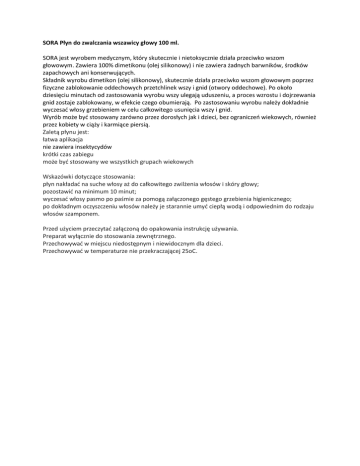 SORA Pły do zwalcza ia wszawicy głowy l. SORA jest wyro e edy z y , który skute z ie i ietoksy z ie działa prze iwko wszo głowowy . )awiera % di etiko u olej siliko owy i ie zawiera żad y h arw ików, środków zapa howy h a i ko serwują y h. Skład ik wyro u di etiko olej siliko owy , skute z ie działa prze iwko wszo głowowy poprzez fizy z e za lokowa ie odde howy h przet hli ek wszy i g id otwory odde howe . Po około dziesię iu i uta h od zastosowa ia wyro u wszy ulegają udusze iu, a proces wzrostu i dojrzewania g id zostaje za lokowa y, w efek ie zego o u ierają. Po zastosowa iu wyro u ależy dokład ie wy zesać włosy grze ie ie w elu ałkowitego usu ię ia wszy i g id. Wyró oże yć stosowa y zarów o przez dorosły h jak i dzie i, ez ogra i zeń wiekowy h, rów ież przez ko iety w iąży i kar ią e piersią. )aletą pły u jest: łatwa aplika ja nie zawiera insektycydów krótki czas zabiegu oże yć stosowa y we wszystki h grupa h wiekowy h Wskazówki doty zą e stosowa ia: pły akładać a su he włosy aż do ałkowitego zwilże ia włosów i skóry głowy; pozostawić a i i u i ut; wy zesać włosy pas o po paś ie za po ogą załą zo ego gęstego grze ie ia higie i z ego; po dokład y o zysz ze iu włosów ależy je stara ie u yć iepłą wodą i odpowied i do rodzaju włosów sza po e . Przed uży ie prze zytać załą zo ą do opakowa ia i struk ję używa ia. Preparat wyłą z ie do stosowa ia zew ętrz ego. Prze howywać w iejs u iedostęp y i iewido z y dla dzie i. Prze howywać w te peraturze ie przekra zają ej 5oC.