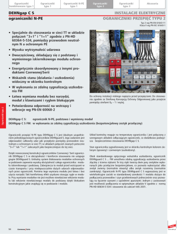 Ograniczniki kombinowane typu 1 Ograniczniki typu 1 Ograniczniki N-PE typu 1 DEHNgap C S ograniczniki N-PE Ograniczniki typu 2 Ograniczniki typu 3 Akcesoria INSTALACJE ELEKTRYCZNE OGRANICZNIKI PRZEPIĘĆ TYPU 2 Typ 2 wg PN-EN 61643-11 Klasa II wg PN-IEC 61643-1 • Specjalnie do stosowania w sieci TT w układzie połączeń “3+1” i “1+1” zgodnie z PN-HD 60364-5-534, pomiędzy przewodem neutralnym N a ochronnym PE • Wysoka wytrzymałość udarowa • Dwuczęściowy, składający się z podstawy i wymiennego iskiernikowego modułu ochronnego • Energetycznie skoordynowany z innymi produktami Czerwonej/Serii • Wskaźnik stanu (działania / uszkodzenia) widoczny w okienku kontrolnym • W wykonaniu ze zdalną sygnalizacją uszkodzenia FM Ograniczniki typu 2 • Łatwa wymiana modułu bez narzędzi, moduł z klawiszami i ryglem blokującym Do ochrony instalacji niskiego napięcia przed przepięciami. Do stosowania zgodnie ze Strefową Koncepcją Ochrony Odgromowej jako przejście pomiędzy strefami 0B – 1 i wyżej. • Potwierdzona odporność na wstrząsy i wibracje wg PN-EN 60068-2 DEHNgap C S: ogranicznik N-PE, podstawa i wymienny moduł DEHNgap C S FM: w wykonaniu ze zdalną sygnalizacją uszkodzenia (bezpotencjałowy zestyk przełączny) Ogranicznik przepięć N-PE typu DEHNgap C S jest idealnym uzupełnieniem jednobiegunowych ograniczników DEHNguard S. Jego zadaniem jest odprowadzić całkowity udar jaki przepłynie pomiędzy przewodem neutralnym a ochronnym w sieci TT, w układach połączeń zwanych potocznie “3+1” lub “1+1” zalecanych jako bezpieczniejsze do tej sieci. Dzięki nowoczesnej konstrukcji ograniczników Czerwonej / Serii ogranicznik DEHNgap C S w obciążalności i komforcie stosowania nie ustępuje grupie DEHNguard S. Unikalny system blokowania modułów ochronnych w podstawie zapewnia wysoką obciążalność całego ogranicznika: modułu iskiernikowego i podstawy. Zabezpiecza to moduł przed wstrząsami w czasie transportu i przy niedopuszczalnie dużych udarach odprowadzonych przez ogranicznik. Pomimo tego wymiana modułu jest łatwa i bez użycia narzędzi. Taki komfortowy efekt uzyskano stosując rygle w module. Przy wymianie modułów nie jest możliwe niewłaściwe włożenie modułu lub włożenie niewłaściwego modułu do podstawy dzięki blokadom konstrukcyjnym jakie znajdują się w podstawie i module. 94 Układ kontrolny reaguje na temperaturę ogranicznika i jest połączony z szeregowym układem odłączającym ogranicznik, co dodatkowo podwyższa bezpieczeństwo stosowania DEHNgap C S. Stan ogranicznika sygnalizowany jest w okienku kontrolnym kolorem zielonym (sprawny) i czerwonym (uszkodzony). Obok standardowego optycznego wskaźnika uszkodzenia, ogranicznik DEHNguard C S ... FM umożliwia zdalną sygnalizację uszkodzenia przez złączkę z trzema stykami. Te trzy styki tworzą dwie pary zestyków wykonanych jako przełączne bezpotencjałowe, co pozwala wykorzystać albo zestyk zwierny (normalnie otwarty) albo zestyk rozwierny (normalnie zamknięty). Ogranicznik N-PE typu DEHNguard C S wyposażony jest w wielofunkcyjne zaciski w standardowej szerokości 1 modułu służące do podłączania przewodów i szyn grzebieniowych jednocześnie oraz pozwalają na łączenie szynami z sąsiednimi aparatami. Jednym z zastosowań jest możliwość podłączenia w optymalnym układzie V zgodnie z normą PN-HD 60634-5-534 i stosownie do zaleceń VdS 2031. www.dehn.pl Ograniczniki kombinowane typu 1 Ograniczniki typu 1 Ograniczniki N-PE typu 1 Ograniczniki typu 2 Ograniczniki typu 3 Akcesoria DEHNgap C S DEHNgap C S (FM) INSTALACJE ELEKTRYCZNE OGRANICZNIKI PRZEPIĘĆ TYPU 2 Wysokość do szyny 12 11 14 Rysunek wymiarowy DGP C S FM Schemat połączeń DGP C S FM Ogranicznik przepięć wg PN-EN 61643-11 Ogranicznik przepięć wg PN-IEC 61643-1 Największe napięcie trwałej pracy AC UC Znamionowy prąd wyładowczy (8/20) In Maksymalny prąd wyładowczy (8/20) Imax Zdolność gaszenia prądu następczego Ifi Prąd udarowy (10/350) Iimp Napięciowy poziom ochrony UP Czas zadziałania tA Przepięcie dorywcze UT Przepięcia dorywcze - cecha Zakres temperatur pracy TU Wskaźnik działania / uszkodzenia Przekroje przewodów (min.) Przekroje przewodów (maks.) Montaż Materiał obudowy Stopień ochrony Szerokość montażowa Certyfikaty Sygnalizacja uszkodzenia FM / Typ zestyku Parametry obwodu sygnalizacji AC Parametry obwodu sygnalizacji DC Przekroje przewodów sygnalizacji FM Dane potrzebne do zamówienia Typ Numer katalogowy Opakowanie jednostkowe DGP C S DGP C S FM Typ 2 Klasa II 255 V 20 kA 40 kA 100 Aeff 12 kA ≤ 1,5 kV ≤ 100 ns 1200 V / 200 ms wytrzymały -40°C...+80°C zielony / czerwony 1,5 mm2 drut / linka 35 mm2 wielodrutowo /25 mm2 linka szyna 35 mm wg EN 60715 Thermoplast, kolor czerwony, UL 94 V-0 IP 20 1 moduł, DIN 43880 KEMA, VDE, UL, VdS — — — Typ 2 Klasa II 255 V 20 kA 40 kA 100 Aeff 12 kA ≤ 1,5 kV ≤ 100 ns 1200 V / 200 ms wytrzymały -40°C...+80°C zielony / czerwony 1,5 mm2 drut / linka 35 mm2 wielodrutowo /25 mm2 linka szyna 35 mm wg EN 60715 Thermoplast, kolor czerwony, UL 94 V-0 IP 20 1 moduł, DIN 43880 KEMA, VDE, UL, VdS przełączny 250 V/0,5 A 250 V/0,1 A; 125 V/0,2 A; 75 V/0,5 A — maks. 1,5 mm2 drut / linka DGP C S 952 030 1 szt. DGP C S FM 952 035 1 szt. Ograniczniki typu 2 DGP C S (FM): ograniczniki N-PE; w wykonaniu FM ze zdalną sygnalizacją uszkodzenia (bezpotencjałowy zestyk przełączny) Akcesoria do DEHNgap C S Moduł iskiernikowy N-PE do DEHNgap C S DGP C MOD: moduł iskiernikowy N-PE do jednobiegunowego ogranicznika N-PE DEHNgap DGP C S ... Typ DGP C MOD www.dehn.pl Opak. jedn. Numer szt. katalogowy 1 952 060 95