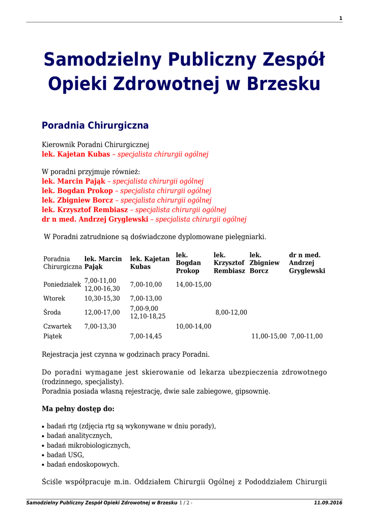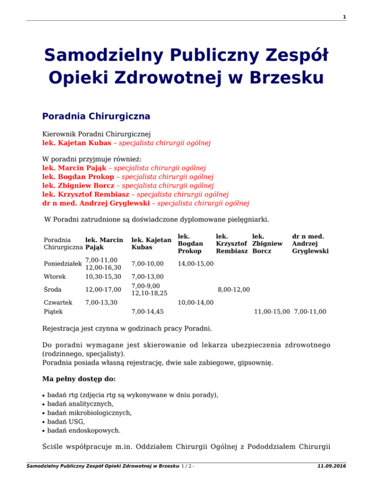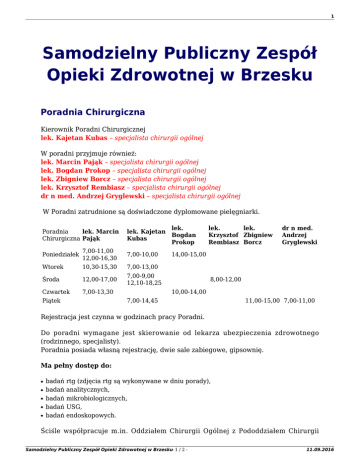 1 Samodzielny Publiczny Zespół Opieki Zdrowotnej w Brzesku Poradnia Chirurgiczna Kierownik Poradni Chirurgicznej lek. Kajetan Kubas – specjalista chirurgii ogólnej W poradni przyjmuje również: lek. Marcin Pająk – specjalista chirurgii ogólnej lek. Bogdan Prokop – specjalista chirurgii ogólnej lek. Zbigniew Borcz – specjalista chirurgii ogólnej lek. Krzysztof Rembiasz – specjalista chirurgii ogólnej dr n med. Andrzej Gryglewski – specjalista chirurgii ogólnej W Poradni zatrudnione są doświadczone dyplomowane pielęgniarki. Poradnia lek. Marcin Chirurgiczna Pająk lek. lek. Kajetan Bogdan Kubas Prokop Poniedziałek 7,00-11,00 12,00-16,30 7,00-10,00 Wtorek 10,30-15,30 7,00-13,00 Środa 12,00-17,00 7,00-9,00 12,10-18,25 Czwartek 7,00-13,30 Piątek lek. lek. Krzysztof Zbigniew Rembiasz Borcz dr n med. Andrzej Gryglewski 14,00-15,00 8,00-12,00 10,00-14,00 7,00-14,45 11,00-15,00 7,00-11,00 Rejestracja jest czynna w godzinach pracy Poradni. Do poradni wymagane jest skierowanie od lekarza ubezpieczenia zdrowotnego (rodzinnego, specjalisty). Poradnia posiada własną rejestrację, dwie sale zabiegowe, gipsownię. Ma pełny dostęp do: ● ● ● ● ● badań rtg (zdjęcia rtg są wykonywane w dniu porady), badań analitycznych, badań mikrobiologicznych, badań USG, badań endoskopowych. Ściśle współpracuje m.in. Oddziałem Chirurgii Ogólnej z Pododdziałem Chirurgii Samodzielny Publiczny Zespół Opieki Zdrowotnej w Brzesku- 1 / 2 - 11.09.2016 2 Urazowo -Ortopedycznej oraz pozostałymi oddziałami i poradniami specjalistycznymi. W Poradni Chirurgicznej: ● ● ● ● ● udzielane są porady i konsultacje w zakresie chirurgii ogólnej, wykonywane są zabiegi ambulatoryjnie w znieczuleniu miejscowym, zakładanie i usuwanie opatrunków gipsowych, zaopatrywanie ran (szycie), zmiany opatrunków. Ważne telefony: ● Rejestracja: 14 66-21-390. Rejestracja do poradni odbywa się: osobiście, telefonicznie, za pośrednictwem osób trzecich lub poprzez stronę internetową www.spzoz-brzesko.pl. Samodzielny Publiczny Zespół Opieki Zdrowotnej w Brzesku- 2 / 2 - 11.09.2016