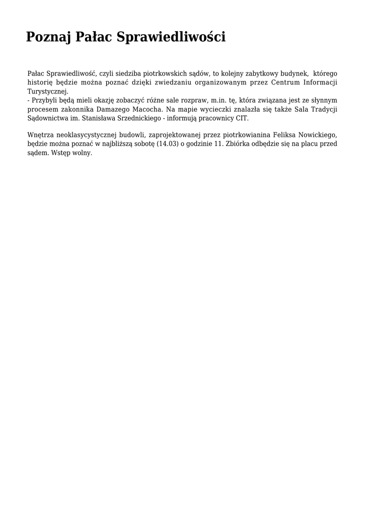 Poznaj Pałac Sprawiedliwości Pałac Sprawiedliwość, czyli siedziba piotrkowskich sądów, to kolejny zabytkowy budynek, którego historię będzie można poznać dzięki zwiedzaniu organizowanym przez Centrum Informacji Turystycznej. - Przybyli będą mieli okazję zobaczyć różne sale rozpraw, m.in. tę, która związana jest ze słynnym procesem zakonnika Damazego Macocha. Na mapie wycieczki znalazła się także Sala Tradycji Sądownictwa im. Stanisława Srzednickiego - informują pracownicy CIT. Wnętrza neoklasycystycznej budowli, zaprojektowanej przez piotrkowianina Feliksa Nowickiego, będzie można poznać w najbliższą sobotę (14.03) o godzinie 11. Zbiórka odbędzie się na placu przed sądem. Wstęp wolny.