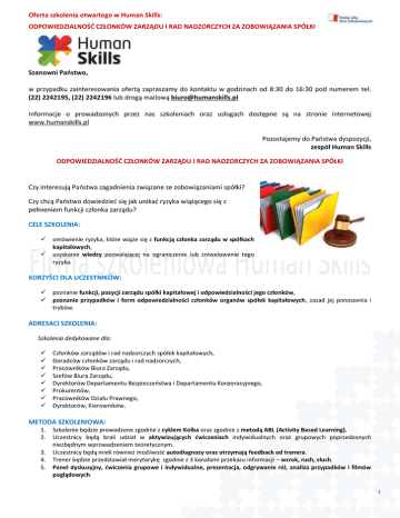 Oferta szkolenia otwartego w Human Skills: ODPOWIEDZIALNOŚĆ CZŁONKÓW ZARZĄDU I RAD NADZORCZYCH ZA ZOBOWIĄZANIA SPÓŁKI Szanowni Państwo, w przypadku zainteresowania ofertą zapraszamy do kontaktu w godzinach od 8:30 do 16:30 pod numerem tel. (22) 2242195, (22) 2242196 lub drogą mailową [email protected] Informacje o prowadzonych przez nas szkoleniach oraz usługach dostępne są na stronie internetowej www.humanskills.pl Pozostajemy do Państwa dyspozycji, zespół Human Skills ODPOWIEDZIALNOŚĆ CZŁONKÓW ZARZĄDU I RAD NADZORCZYCH ZA ZOBOWIĄZANIA SPÓŁKI Czy interesują Państwa zagadnienia związane ze zobowiązaniami spółki? Czy chcą Państwo dowiedzieć się jak unikać ryzyka wiążącego się z pełnieniem funkcji członka zarządu? CELE SZKOLENIA: omówienie ryzyka, które wiąże się z funkcją członka zarządu w spółkach kapitałowych, uzyskanie wiedzy pozwalającej na ograniczenie lub zniwelowanie tego ryzyka. KORZYŚCI DLA UCZESTNIKÓW: poznanie funkcji, pozycji zarządu spółki kapitałowej i odpowiedzialności jego członków, poznanie przypadków i form odpowiedzialności członków organów spółek kapitałowych, zasad jej ponoszenia i trybów. ADRESACI SZKOLENIA: Szkolenia dedykowane dla: Członków zarządów i rad nadzorczych spółek kapitałowych, Doradców członków zarządu i rad nadzorczych, Pracowników Biura Zarządu, Szefów Biura Zarządu, Dyrektorów Departamentu Bezpieczeństwa i Departamentu Korporacyjnego, Prokurentów, Pracowników Działu Prawnego, Dyrektorów, Kierowników. METODA SZKOLENIOWA: 1. 2. 3. 4. 5. Szkolenie będzie prowadzone zgodnie z cyklem Kolba oraz zgodnie z metodą ABL (Activity Based Learning). Uczestnicy będą brali udział w aktywizujących ćwiczeniach indywidualnych oraz grupowych poprzedzonych niezbędnym wprowadzeniem teoretycznym. Uczestnicy będą mieli również możliwość autodiagnozy oraz otrzymają feedback od trenera. Trener będzie przedstawiał merytorykę zgodnie z 3 kanałami przekazu informacji – wzrok, ruch, słuch. Panel dyskusyjny, ćwiczenia grupowe i indywidualne, prezentacja, odgrywanie ról, analiza przypadków i filmów poglądowych. 1 Oferta szkolenia otwartego w Human Skills: ODPOWIEDZIALNOŚĆ CZŁONKÓW ZARZĄDU I RAD NADZORCZYCH ZA ZOBOWIĄZANIA SPÓŁKI PROGRAM SZKOLENIA: 09:00 – 09:30 Rozpoczęcie szkolenia. Wstęp - omówienie celów szkolenia oraz potrzeb uczestników. 09:30 – 10:30 Zarząd i Rada Nadzorcza w spółkach kapitałowych 1. 2. 3. Prawa i obowiązki oraz kompetencje członka zarządu i rady nadzorczej. Wymagany stopień staranności przy pełnieniu funkcji. Pozycja zarządu wobec rady nadzorczej i zgromadzenia wspólników (akcjonariuszy). Odpowiedzialność odszkodowawcza członków zarządu i członków rady nadzorczej wobec wierzycieli oraz wobec spółki 1. 2. 3. 4. 5. 6. Warunki i zakres odpowiedzialności członków zarządu wobec wierzycieli spółki. Warunki i zakres odpowiedzialności członków zarządu i członków rady nadzorczej wobec spółki. Kiedy powstaje odpowiedzialność? Kiedy członek zarządu odpowiada a kiedy z odpowiedzialności zostaje zwolniony? Na czym polega „obowiązek naprawienia szkody”? Znaczenie uchwały udzielającej absolutorium dla odpowiedzialności członków zarządu i rady nadzorczej spółki. 7. Odpowiedzialność za szkodę wyrządzoną spółce. 8. Odpowiedzialność za bezprawne wypłaty. 9. Odpowiedzialność odszkodowawcza za czyny niedozwolone. 10. Odpowiedzialność członka rady nadzorczej oddelegowanego do czasowego wykonywania funkcji członka zarządu. 11. Zróżnicowanie odpowiedzialności w zależności od formy zatrudnienia. 12. Przedawnienie roszczeń. Odpowiedzialność członków zarządu spółki z o.o. za zobowiązania cywilnoprawne spółki 1. 2. 3. 4. 5. Warunki i zakres podlegania odpowiedzialności za zobowiązania cywilnoprawne spółki z o.o. Bezskuteczność egzekucji przeciwko spółce z o.o. Brak zgłoszenia wniosku o upadłość spółki z o.o. we właściwym czasie. Niezawinione niezgłoszenie lub niezawinione opóźnienie w zgłoszeniu wniosku o upadłość. Brak szkody po stronie wierzyciela. 12:30 – 13:10 Przerwa na lunch 13:10 – 15:30 Odpowiedzialność członków zarządu spółki za zobowiązania publicznoprawne 1. 2. 3. Warunki i zakres podlegania odpowiedzialności za zobowiązania publicznoprawne. Odpowiedzialność członka zarządu za zobowiązania podatkowe. Odpowiedzialność członka zarządu za zobowiązania spółki z tytułu składek na ubezpieczenie społeczne. Odpowiedzialność karnoskarbowa członków zarządu 1. 2. Warunki i zakres odpowiedzialności za wykroczenia skarbowe. Warunki i zakres odpowiedzialności za przestępstwa skarbowe. 2 Oferta szkolenia otwartego w Human Skills: ODPOWIEDZIALNOŚĆ CZŁONKÓW ZARZĄDU I RAD NADZORCZYCH ZA ZOBOWIĄZANIA SPÓŁKI Odpowiedzialność karna członków zarządu spółki z o.o./spółki akcyjnej (tzw. przestępstwa menedżerskie) Zabezpieczenie interesu spółki i uniknięcie odpowiedzialności majątkowej 1. 2. 3. 4. 5. 6. 7. 8. 9. Bezpieczeństwo i odpowiedzialność w świetle obecnej sytuacji rynkowej i aktualnych sytuacji spółek kapitałowych. „Opcje walutowe” – odpowiedzialność członków w zakresie transakcji walutowych. Odpowiedzialność cywilnoprawna członków zarządu i rady nadzorczej. Zróżnicowanie odpowiedzialności członków zarządu i rady nadzorczej w zależności od formy zatrudnienia. Ubezpieczenie OC członków zarządów i rad nadzorczych spółek kapitałowych. Środki prawne służące zabezpieczenia interesów spółki i zaniechaniu ukarania członka zarządu. Zapobieganie nadużyciom i defraudacjom w procesie zapewnienia bezpieczeństwa spółki oraz członka zarządu i rady nadzorczej. Uprawnienia pracodawcy/zarządu w przypadku wykrycia nadużyć. Wdrażanie mechanizmów z zakresu zapobiegania nadużyciom. 15:30 – 16:00 Podsumowanie i zakończenie szkolenia. TRENER: Marci
