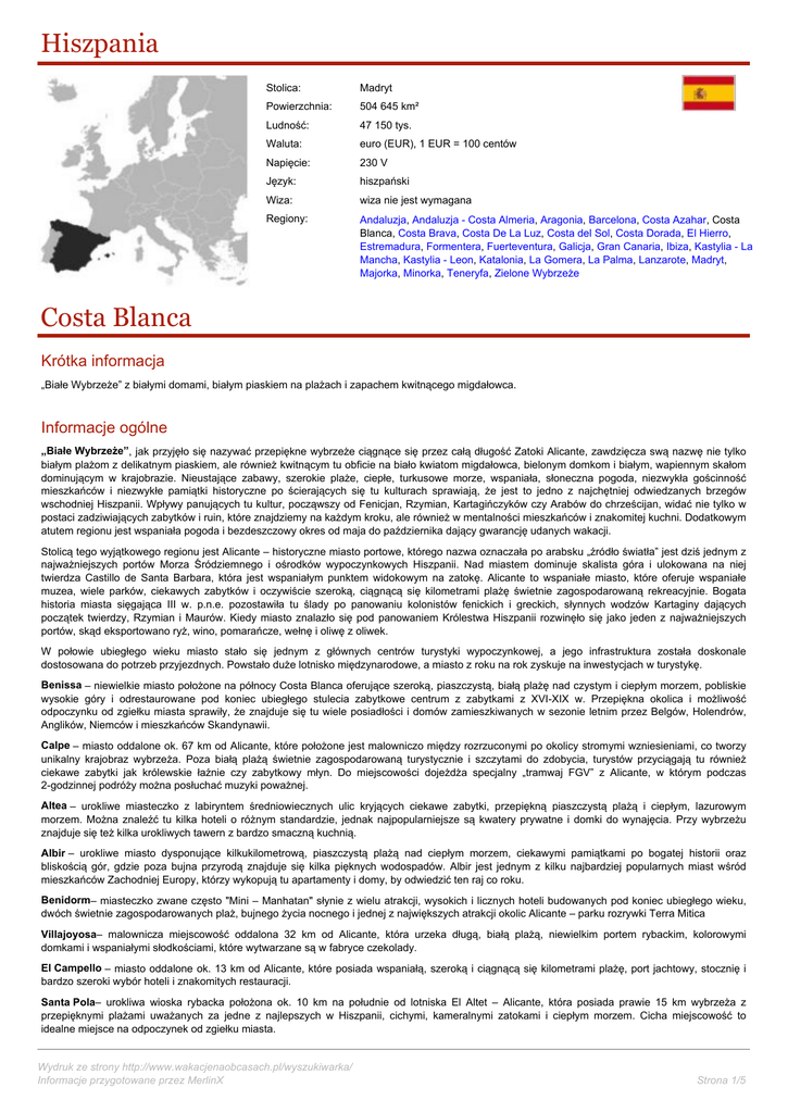 Hiszpania Stolica: Madryt Powierzchnia: 504 645 km² Ludność: 47 150 tys. Waluta: euro (EUR), 1 EUR = 100 centów Napięcie: 230 V Język: hiszpański Wiza: wiza nie jest wymagana Regiony: Andaluzja, Andaluzja - Costa Almeria, Aragonia, Barcelona, Costa Azahar, Costa Blanca, Costa Brava, Costa De La Luz, Costa del Sol, Costa Dorada, El Hierro, Estremadura, Formentera, Fuerteventura, Galicja, Gran Canaria, Ibiza, Kastylia - La Mancha, Kastylia - Leon, Katalonia, La Gomera, La Palma, Lanzarote, Madryt, Majorka, Minorka, Teneryfa, Zielone Wybrzeże Costa Blanca Krótka informacja „Białe Wybrzeże” z białymi domami, białym piaskiem na plażach i zapachem kwitnącego migdałowca. Informacje ogólne „Białe Wybrzeże”, jak przyjęło się nazywać przepiękne wybrzeże ciągnące się przez całą długość Zatoki Alicante, zawdzięcza swą nazwę nie tylko białym plażom z delikatnym piaskiem, ale również kwitnącym tu obficie na biało kwiatom migdałowca, bielonym domkom i białym, wapiennym skałom dominującym w krajobrazie. Nieustające zabawy, szerokie plaże, ciepłe, turkusowe morze, wspaniała, słoneczna pogoda, niezwykła gościnność mieszkańców i niezwykłe pamiątki historyczne po ścierających się tu kulturach sprawiają, że jest to jedno z najchętniej odwiedzanych brzegów wschodniej Hiszpanii. Wpływy panujących tu kultur, począwszy od Fenicjan, Rzymian, Kartagińczyków czy Arabów do chrześcijan, widać nie tylko w postaci zadziwiających zabytków i ruin, które znajdziemy na każdym kroku, ale również w mentalności mieszkańców i znakomitej kuchni. Dodatkowym atutem regionu jest wspaniała pogoda i bezdeszczowy okres od maja do października dający gwarancję udanych wakacji. Stolicą tego wyjątkowego regionu jest Alicante – historyczne miasto portowe, którego nazwa oznaczała po arabsku „źródło światła” jest dziś jednym z najważniejszych portów Morza Śródziemnego i ośrodków wypoczynkowych Hiszpanii. Nad miastem dominuje skalista góra i ulokowana na niej twierdza Castillo de Santa Barbara, która jest wspaniałym punktem widokowym na zatokę. Alicante to wspaniałe miasto, które oferuje wspaniałe muzea, wiele parków, ciekawych zabytków i oczywiście szeroką, ciągnącą się kilometrami plażę świetnie zagospodarowaną rekreacyjnie. Bogata historia miasta sięgająca III w. p.n.e. pozostawiła tu ślady po panowaniu kolonistów fenickich i greckich, słynnych wodzów Kartaginy dających początek twierdzy, Rzymian i Maurów. Kiedy miasto znalazło się pod panowaniem Królestwa Hiszpanii rozwinęło się jako jeden z najważniejszych portów, skąd eksportowano ryż, wino, pomarańcze, wełnę i oliwę z oliwek. W połowie ubiegłego wieku miasto stało się jednym z głównych centrów turystyki wypoczynkowej, a jego infrastruktura została doskonale dostosowana do potrzeb przyjezdnych. Powstało duże lotnisko międzynarodowe, a miasto z roku na rok zyskuje na inwestycjach w turystykę. Benissa – niewielkie miasto położone na północy Costa Blanca oferujące szeroką, piaszczystą, białą plażę nad czystym i ciepłym morzem, pobliskie wysokie góry i odrestaurowane pod koniec ubiegłego stulecia zabytkowe centrum z zabytkami z XVI-XIX w. Przepiękna okolica i możliwość odpoczynku od zgiełku miasta sprawiły, że znajduje się tu wiele posiadłości i domów zamieszkiwanych w sezonie letnim przez Belgów, Holendrów, Anglików, Niemców i mieszkańców Skandynawii. Calpe – miasto oddalone ok. 67 km od Alicante, które położone jest malowniczo między rozrzuconymi po okolicy stromymi wzniesieniami, co tworzy unikalny krajobraz wybrzeża. Poza białą plażą świetnie zagospodarowaną turystycznie i szczytami do zdobycia, turystów przyciągają tu również ciekawe zabytki jak królewskie łaźnie czy zabytkowy młyn. Do miejscowości dojeżdża specjalny „tramwaj FGV” z Alicante, w którym podczas 2-godzinnej podróży można posłuchać muzyki poważnej. Altea – urokliwe miasteczko z labiryntem średniowiecznych ulic kryjących ciekawe zabytki, przepiękną piaszczystą plażą i ciepłym, lazurowym morzem. Można znaleźć tu kilka hoteli o różnym standardzie, jednak najpopularniejsze są kwatery prywatne i domki do wynajęcia. Przy wybrzeżu znajduje się też kilka urokliwych tawern z bardzo smaczną kuchnią. Albir – urokliwe miasto dysponujące kilkukilometrową, piaszczystą plażą nad ciepłym morzem, ciekawymi pamiątkami po bogatej historii oraz bliskością gór, gdzie poza bujna przyrodą znajduje się kilka pięknych wodospadów. Albir jest jednym z kilku najbardziej popularnych miast wśród mieszkańców Zachodniej Europy, którzy wykopują tu apartamenty i domy, by odwiedzić ten raj co roku. Benidorm– miasteczko zwane często "Mini – Manhatan" słynie z wielu atrakcji, wysokich i licznych hoteli budowanych pod koniec ubiegłego wieku, dwóch świetnie zagospodarowanych plaż, bujnego życia nocnego i jednej z największych atrakcji okolic Alicante – parku rozrywki Terra Mitica Villajoyosa– malownicza miejscowość oddalona 32 km od Alicante, która urzeka długą, białą plażą, niewielkim portem rybackim, kolorowymi domkami i wspaniałymi słodkościami, które wytwarzane są w fabryce czekolady. El Campello – miasto oddalone ok. 13 km od Alicante, które posiada wspaniałą, szeroką i ciągnącą się kilometrami plażę, port jachtowy, stocznię i bardzo szeroki wybór hoteli i znakomitych restauracji. Santa Pola– urokliwa wioska rybacka położona ok. 10 km na południe od lotniska El Altet – Alicante, która posiada prawie 15 km wybrzeża z przepięknymi plażami uważanych za jedne z najlepszych w Hiszpanii, cichymi, kameralnymi zatokami i ciepłym morzem. Cicha miejscowość to idealne miejsce na odpoczynek od zgiełku miasta. Wydruk ze strony http://www.wakacjenaobcasach.pl/wyszukiwarka/ Informacje przygotowane przez MerlinX Strona 1/5 Guardam