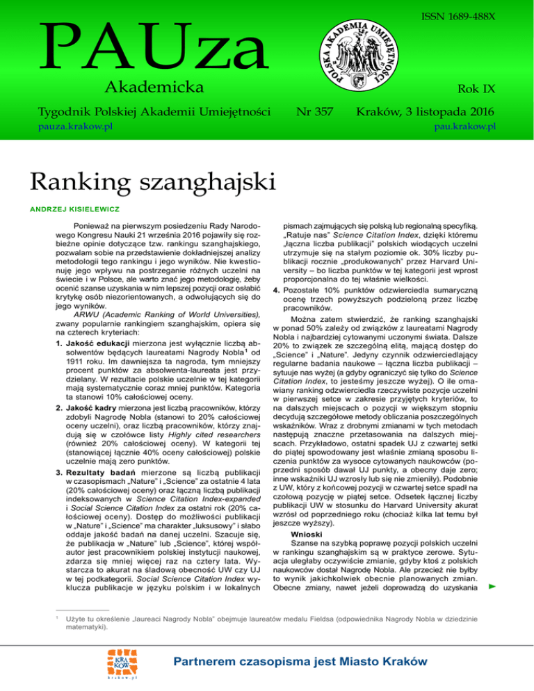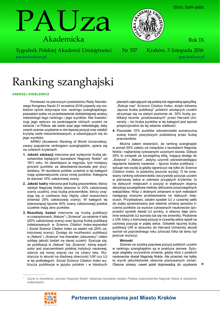 PAUza ISSN 1689-488X Akademicka Rok IX Nr 357 Tygodnik Polskiej Akademii Umiejętności Kraków, 3 listopada 2016 pau.krakow.pl pauza.krakow.pl Ranking szanghajski ANDRZEJ KISIELEWICZ Ponieważ na pierwszym posiedzeniu Rady Narodowego Kongresu Nauki 21 września 2016 pojawiły się rozbieżne opinie dotyczące tzw. rankingu szanghajskiego, pozwalam sobie na przedstawienie dokładniejszej analizy metodologii tego rankingu i jego wyników. Nie kwestionuję jego wpływu na postrzeganie różnych uczelni na świecie i w Polsce, ale warto znać jego metodologię, żeby ocenić szanse uzyskania w nim lepszej pozycji oraz osłabić krytykę osób niezorientowanych, a odwołujących się do jego wyników. ARWU (Academic Ranking of World Universities), zwany popularnie rankingiem szanghajskim, opiera się na czterech kryteriach: 1. Jakość edukacji mierzona jest wyłącznie liczbą absolwentów będących laureatami Nagrody Nobla 1 od 1911 roku. Im dawniejsza ta nagroda, tym mniejszy procent punktów za absolwenta-laureata jest przydzielany. W rezultacie polskie uczelnie w tej kategorii mają systematycznie coraz mniej punktów. Kategoria ta stanowi 10% całościowej oceny. 2. Jakość kadry mierzona jest liczbą pracowników, którzy zdobyli Nagrodę Nobla (stanowi to 20% całościowej oceny uczelni), oraz liczbą pracowników, którzy znajdują się w czołówce listy Highly cited researchers (również 20% całościowej oceny). W kategorii tej (stanowiącej łącznie 40% oceny całościowej) polskie uczelnie mają zero punktów. 3. Rezultaty badań mierzone są liczbą publikacji w czasopismach „Nature” i „Science” za ostatnie 4 lata (20% całościowej oceny) oraz łączną liczbą publikacji indeksowanych w Science Citation Index-expanded i Social Science Citation Index za ostatni rok (20% całościowej oceny). Dostęp do możliwości publikacji w „Nature” i „Science” ma charakter „luksusowy” i słabo oddaje jakość badań na danej uczelni. Szacuje się, że publikacja w „Nature” lub „Science”, której współautor jest pracownikiem polskiej instytucji naukowej, zdarza się mniej więcej raz na cztery lata. Wystarcza to akurat na śladową obecność UW czy UJ w tej podkategorii. Social Science Citation Index wyklucza publikacje w języku polskim i w lokalnych 1 pismach zajmujących się polską lub regionalną specyfiką. „Ratuje nas” Science Citation Index, dzięki któremu „łączna liczba publikacji” polskich wiodących uczelni utrzymuje się na stałym poziomie ok. 30% liczby publikacji rocznie „produkowanych” przez Harvard University – bo liczba punktów w tej kategorii jest wprost proporcjonalna do tej właśnie wielkości. 4. Pozostałe 10% punktów odzwierciedla sumaryczną ocenę trzech powyższych podzieloną przez liczbę pracowników. Można zatem stwierdzić, że ranking szanghajski w ponad 50% zależy od związków z laureatami Nagrody Nobla i najbardziej cytowanymi uczonymi świata. Dalsze 20% to związek ze szczególną elitą, mającą dostęp do „Science” i „Nature”. Jedyny czynnik odzwierciedlający regularne badania naukowe – łączna liczba publikacji – sytuuje nas wyżej (a gdyby ograniczyć się tylko do Science Citation Index, to jesteśmy jeszcze wyżej). O ile omawiany ranking odzwierciedla rzeczywiste pozycje uczelni w pierwszej setce w zakresie przyjętych kryteriów, to na dalszych miejscach o pozycji w większym stopniu decydują szczegółowe metody obliczania poszczególnych wskaźników. Wraz z drobnymi zmianami w tych metodach następują znaczne przetasowania na dalszych miejscach. Przykładowo, ostatni spadek UJ z czwartej setki do piątej spowodowany jest właśnie zmianą sposobu liczenia punktów za wysoce cytowanych naukowców (poprzedni sposób dawał UJ punkty, a obecny daje zero; inne wskaźniki UJ wzrosły lub się nie zmieniły). Podobnie z UW, który z końcowej pozycji w czwartej setce spadł na czołową pozycję w piątej setce. Odsetek łącznej liczby publikacji UW w stosunku do Harvard University akurat wzrósł od poprzedniego roku (chociaż kilka lat temu był jeszcze wyższy). Wnioski Szanse na szybką poprawę pozycji polskich uczelni w rankingu szanghajskim są w praktyce zerowe. Sytuacja uległaby oczywiście zmianie, gdyby ktoś z polskich naukowców dostał Nagrodę Nobla. Ale przecież nie byłby to wynik jakichkolwiek obecnie planowanych zmian. Obecne zmiany, nawet jeżeli doprowadzą do uzyskania Użyte tu określenie „laureaci Nagrody Nobla” obejmuje laureatów medalu Fieldsa (odpowiednika Nagrody Nobla w dziedzinie matematyki). Partnerem czasopisma jest Miasto Kraków ► Numer 357 3 listopada 2016 2 www.pauza.krakow.pl ► Nobla, to odbiją się w tym rankingu nie wcześniej niż za dwie dekady. Jedyny sposób na lekką poprawę to „wymuszenie” podwojenia liczby indeksowanych publikacji, a w szczególności „zmuszenie” polskich humanistów do publikowania w anglojęzycznych pismach indeksowanych w Social Science Citation Index (które w rankingu szanghajskim liczą się podwójnie), a także pozbycie się z UW i UJ pracowników niepublikujących w indeksowanych czasopismach. Dotyczy to także innych czołowych rankingów, w których Polska stoi równie źle, ponieważ generalnie mają one podobne kryteria. Dodatkowe kryteria stosowane w innych rankingach to „umiędzynarodowienie” i „współpraca z przemysłem” – tu oczywiście jest potencjał poprawy, chociaż gdyby chcieć to robić pod rankingi, trzeba by dokładnie zanalizować metodologie ocen (a generalnie są one równie arbitralne i powierzchowne). Wydaje się, że tym ogólnym rankingom należy przeciwstawić rankingi dziedzinowe – w niektórych z nich polskie uczelnie lub wydziały stoją dużo lepiej – a przede wszystkim nagłaśniać konkretne sukcesy polskich naukowców, których przecież nie brakuje. W jakimkolwiek kierunku pójdzie reforma nauki, konieczne wydaje się dokładne zdi