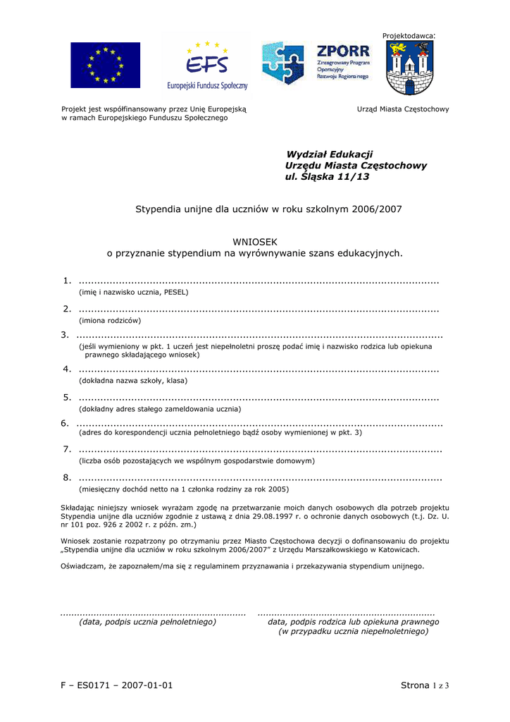 Projektodawca: Projekt jest współfinansowany przez Unię Europejską w ramach Europejskiego Funduszu Społecznego Urząd Miasta Częstochowy Wydział Edukacji Urzędu Miasta Częstochowy ul. Śląska 11/13 Stypendia unijne dla uczniów w roku szkolnym 2006/2007 WNIOSEK o przyznanie stypendium na wyrównywanie szans edukacyjnych. 1. ..................................................................................................................... (imię i nazwisko ucznia, PESEL) 2. ..................................................................................................................... (imiona rodziców) 3. ....................................................................................................................... (jeśli wymieniony w pkt. 1 uczeń jest niepełnoletni proszę podać imię i nazwisko rodzica lub opiekuna prawnego składającego wniosek) 4. ..................................................................................................................... (dokładna nazwa szkoły, klasa) 5. ..................................................................................................................... (dokładny adres stałego zameldowania ucznia) 6. ....................................................................................................................... (adres do korespondencji ucznia pełnoletniego bądź osoby wymienionej w pkt. 3) 7. ...................................................................................................................... (liczba osób pozostających we wspólnym gospodarstwie domowym) 8. ...................................................................................................................... (miesięczny dochód netto na 1 członka rodziny za rok 2005) Składając niniejszy wniosek wyraŜam zgodę na przetwarzanie moich danych osobowych dla potrzeb projektu Stypendia unijne dla uczniów zgodnie z ustawą z dnia 29.08.1997 r. o ochronie danych osobowych (t.j. Dz. U. nr 101 poz. 926 z 2002 r. z późn. zm.) Wniosek zostanie rozpatrzony po otrzymaniu przez Miasto Częstochowa decyzji o dofinansowaniu do projektu „Stypendia unijne dla uczniów w roku szkolnym 2006/2007” z Urzędu Marszałkowskiego w Katowicach. Oświadczam, Ŝe zapoznałem/ma się z regulaminem przyznawania i przekazywania stypendium unijnego. ................................................................... (data, podpis ucznia pełnoletniego) F – ES0171 – 2007-01-01 ................................................................ data, podpis rodzica lub opiekuna prawnego (w przypadku ucznia niepełnoletniego) Strona 1 z 3 Oświadczenie o sytuacji rodzinnej i materialnej rodziny ucznia. Oświadczam, Ŝe moja rodzina składa się z niŜej wymienionych osób pozostających na wspólnym gospodarstwie domowym, których dochody netto w roku 2005 wynosiły1: Wysokość dochodu netto PLN Lp. Imię i nazwisko Rok Miejsce Stopień urodzenia pracy pokrewieńs - nauki twa W tym dochody : ogółem z MOPS-u2 stypendia z gospodarst wa rolnego pozostałe3 łączny dochód całego gospodarstwa domowego: Składając niniejszą deklarację oświadczam, Ŝe jest mi wiadome, Ŝe dokumenty na podstawie których zadeklarowałem/am dochody jestem zobowiązany/a przechowywać przez okres 3 lat, a uprzedzony/a o odpowiedzialności karnej z art. 233 § 1 kodeksu karnego, potwierdzam własnoręcznym podpisem prawdziwość danych zamieszczonych w deklaracji. ..................................................... (miejscowość, data) 1 2 3 ............................................ podpis rodzica lub opiekuna prawnego (w przypadku ucznia niepełnoletniego) W przypadku braku dochodu proszę wpisać “0” Z wyłączeniem świadczeń rodzinnych Dochody uzyskane w roku kalendarzowym 2005 niepodlegające opodatkowaniu F – ES0171 – 2007-01-01 Strona 2 z 3 Pouczenie: Do powyŜszego oświadczenia naleŜy dołączyć dokumenty potwierdzające uzyskanie dochodów w szczególności: 1. Zaświadczenie z Urzędu Gminy o zameldowaniu ucznia lub ksero kopia dowodu osobistego. 2. Zaświadczenia z urzędu skarbowego o wysokości dochodów netto uzyskanych przez członków rodziny w roku kalendarzowym 2005, jeśli dochody te podlegają opodatkowaniu podatkiem dochodowym od osób fizycznych na zasadach ogólnych. 3. Zaświadczenia z urzędu skarbowego o wysokości naleŜnego zryczałtowanego podatku dochodowego za dany rok albo decyzję lub decyzje ustalające wysokość podatku dochodowego w formie karty podatkowej. 4. Oświadczenia członków rodziny o wysokości uzyskanego dochodu w roku kalendarzowym 2005, jeśli członkowie rodziny rozliczają się na podstawie przepisów o zryczałtowanym podatku dochodowym od niektórych przychodów osiąganych przez osoby fizyczne. 5. Zaświadczenia z urzędu skarbowego o wysokości dochodów netto uzyskanych przez członków rodziny w roku kalendarzowym 2005 dla wszystkich pełnoletnich osób pod wskazanym adresem z wyjątkiem : • uczniów szkół ponadgimnazjalnych dla młodzieŜy kończących się maturą, którzy przedstawiają zaświadczenie ze szkoły • uczniów , którzy ubiegają się o stypendium 6. Zaświadczenie właściwego organu gminy o wielkości gospodarstwa rolnego wyraŜonej w hektarach przeliczeniowych ogólnej powierzchni w roku kalendarzowym 2005 albo nakaz płatniczy za ten rok, 7. Przekazy lub przelewy pienięŜne dokumentujące wysokość alimentów, jeśli członkowie rodziny są zobowiązani wyrokiem sądu lub ugodą sądową do ich płacenia na rzecz osoby spoza rodziny, 8. Kopię odpisu wyroku sądu zasądzającego alimenty na rzecz osób w rodzinie lub kopię odpisu protokołu posiedzenia zawierającego treść ugody sądowej, przekazy lub przelewy pienięŜne dokumentujące faktyczną wysokość otrzymanych alimentów, w przypadku uzyskania alimentów niŜszych niŜ zasądzone w wyroku lub ugodzie sądowej, oraz zaświadczenie komornika o całkowitej lub częściowej bezs